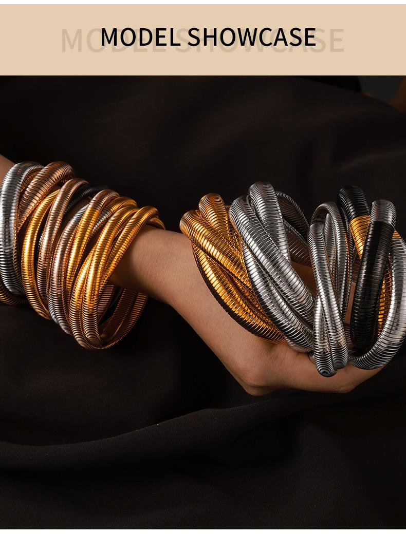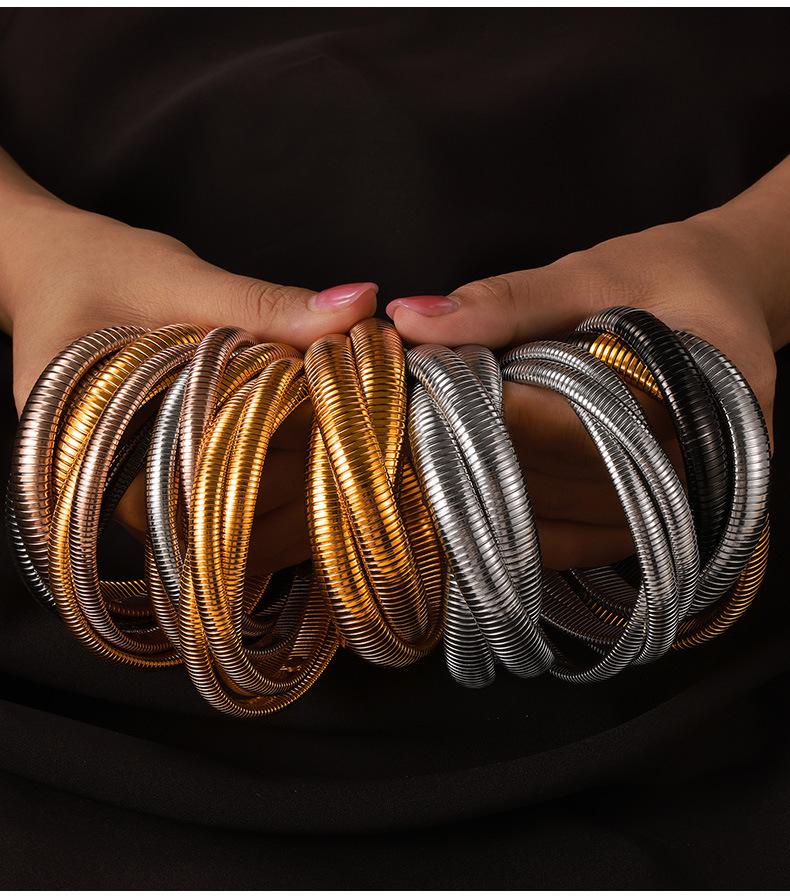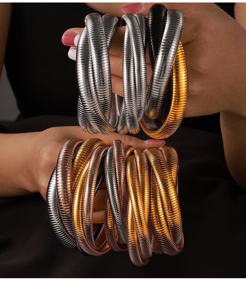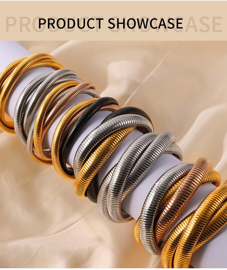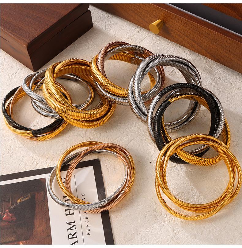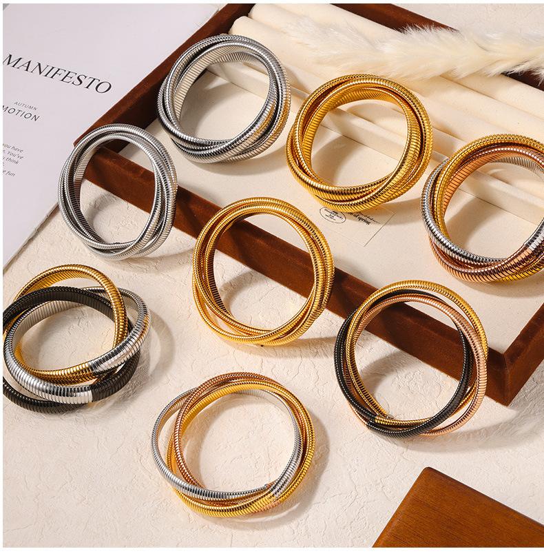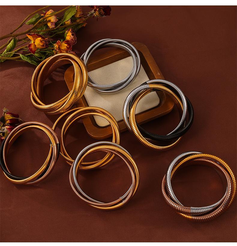 Compra Pulsera de titanio de moda de alta gama europea y americana transfronteriza de cara ancha de garganta de ganso tendencia personalizada combinación de colores tres círculos hueso de serpiente elástica mano al por mayor en Joom.pro