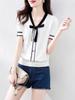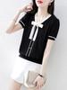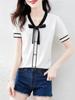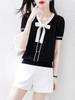 2025 Nueva Camiseta de Verano de Seda de Hielo de Manga Corta para Mujer Ajustada Moda Lazo Cuello Marino Tejido Más Fácil de Combinar Top Trendy