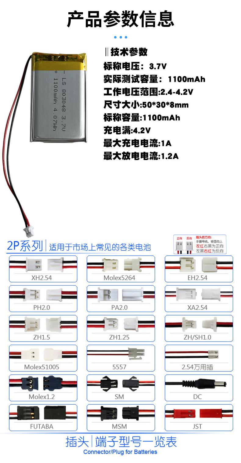 Batería de polímero de litio 803048, 1100 mAh, 3,7 V, recargable, para instrumento de belleza, batería iónica.