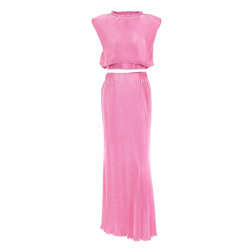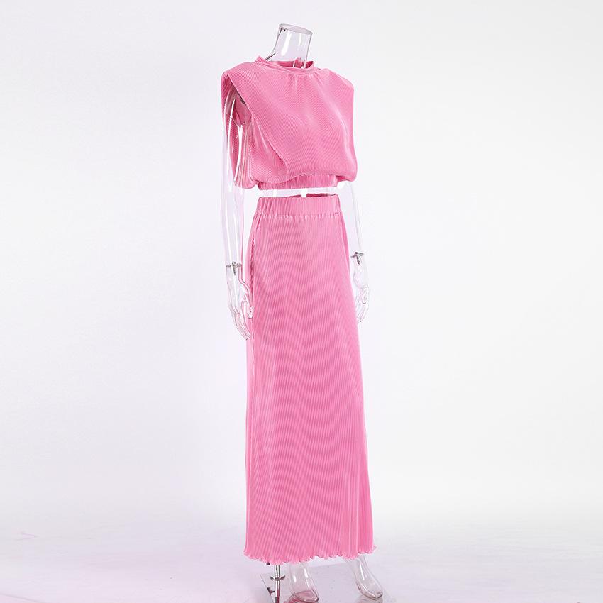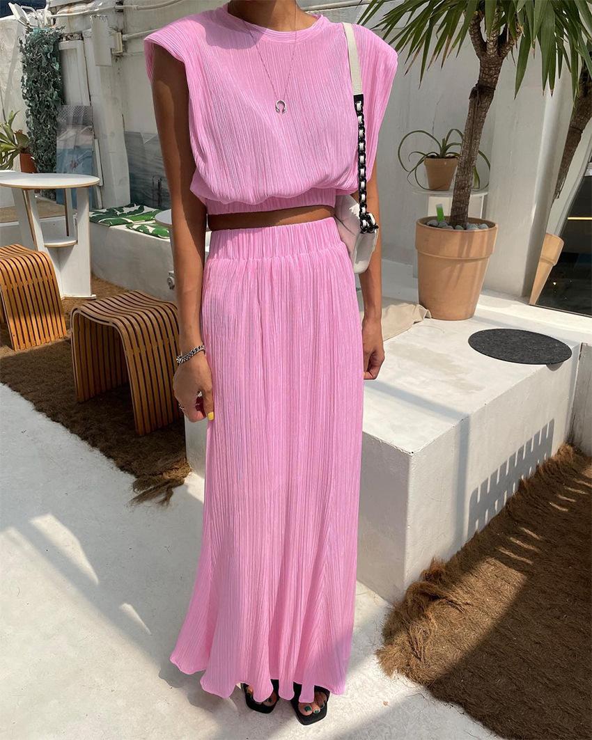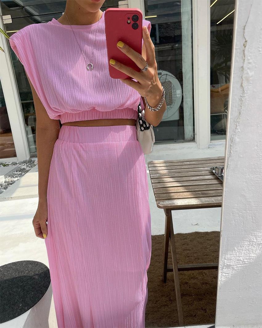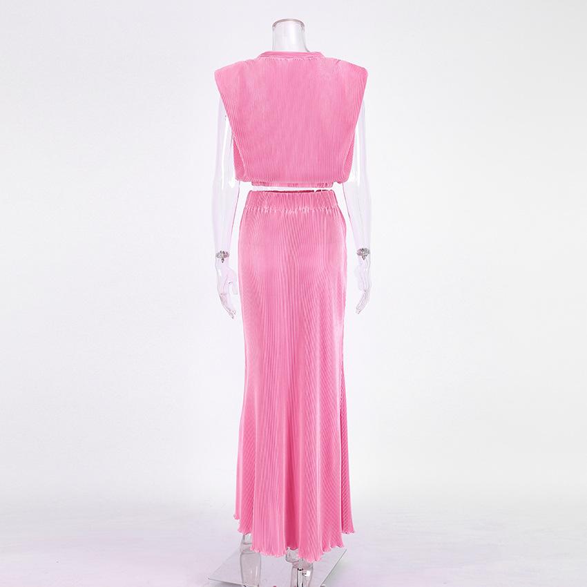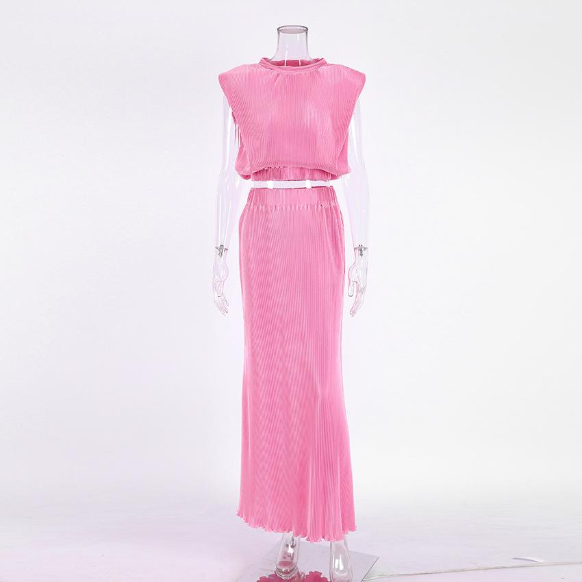 Conjunto de dos piezas plisado elegante e informal de moda europea y americana, novedad de verano 2023, chaleco con hombreras, falda y vestido para mujer