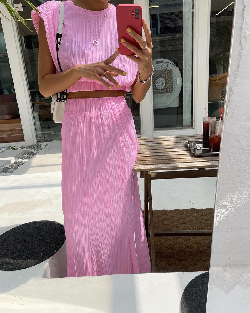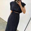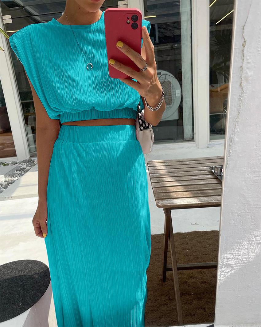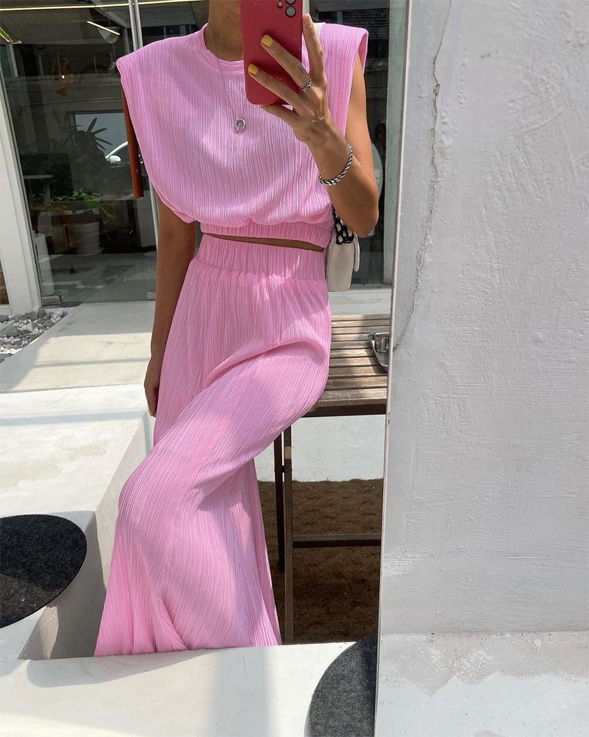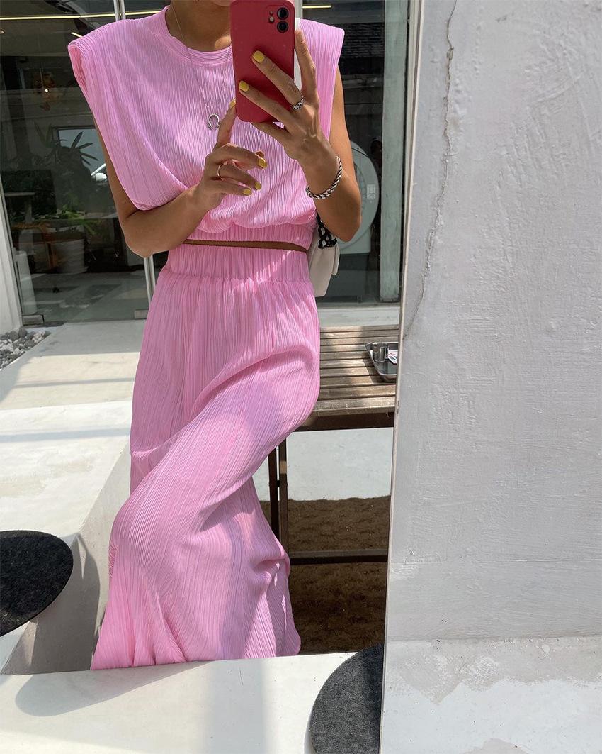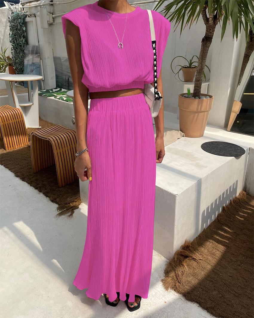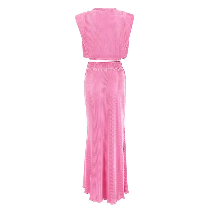 Conjunto de dos piezas plisado elegante e informal de moda europea y americana, novedad de verano 2023, chaleco con hombreras, falda y vestido para mujer