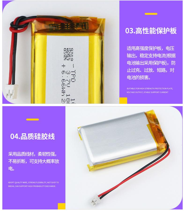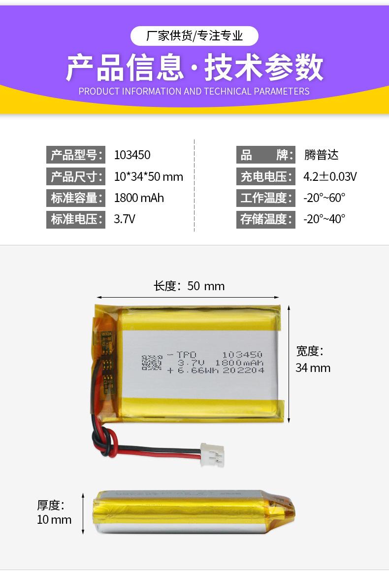 103450-1800mAh single cell, 103450-2000mAh single cell, 103450-1800mAh with plate outlet, 103450-2000mAh Outlet with Plate