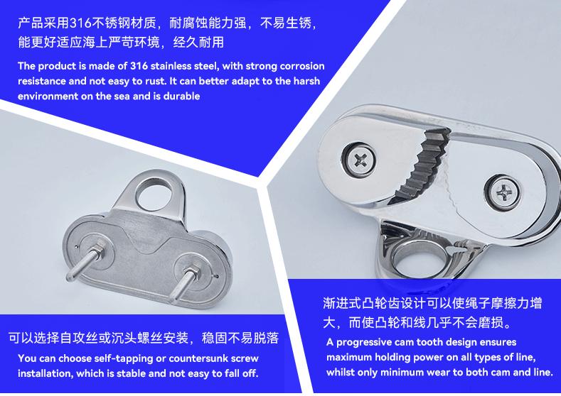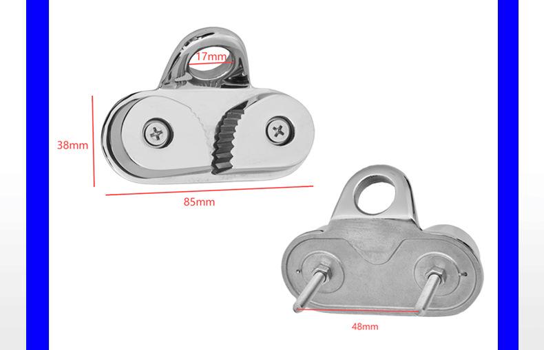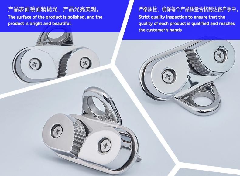 Fábrica: yangxin heritage metal products co., ltd. Nombre del producto:Mordaza de cuerda Cam Cleat Material: acero inoxidable 316 Tamaño aplicable:85*38mm Aplicación: Barco, yate, hogar, muebles, instalación de puertas y ventanas y otros campos Método de embalaje predeterminado: bolsa de burbujas OPP |