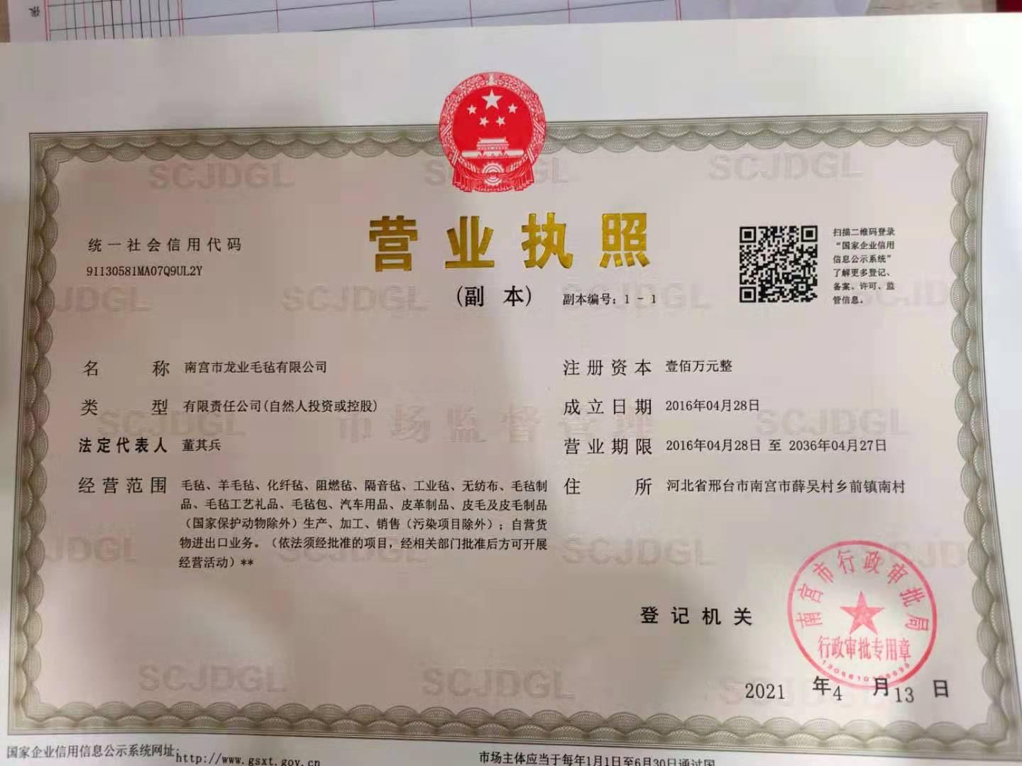 Nangong Longye Felt Co., Ltd. es una empresa especializada en la producción y procesamiento de productos de fieltro, cestas tejidas para almacenaje, cajas de almacenaje, bolsos para ordenador, bolsos para vino tinto, cestas para guardar ropa interior, fieltro insonorizante, fieltro industrial, bolsas de fieltro, árboles de Navidad, mesitas de noche, lavabos y camas para gatos, fieltro para pintura y caligrafía, bolsos navideños y otros productos. Cuenta con un sistema de gestión de calidad completo y científico. La integridad y la calidad de sus productos son reconocidas por la industria. Invitamos a amigos de todos los ámbitos a visitarnos, orientarnos y hacer negocios.