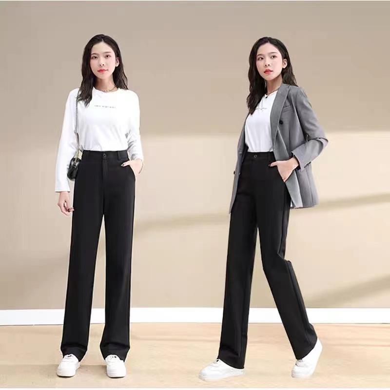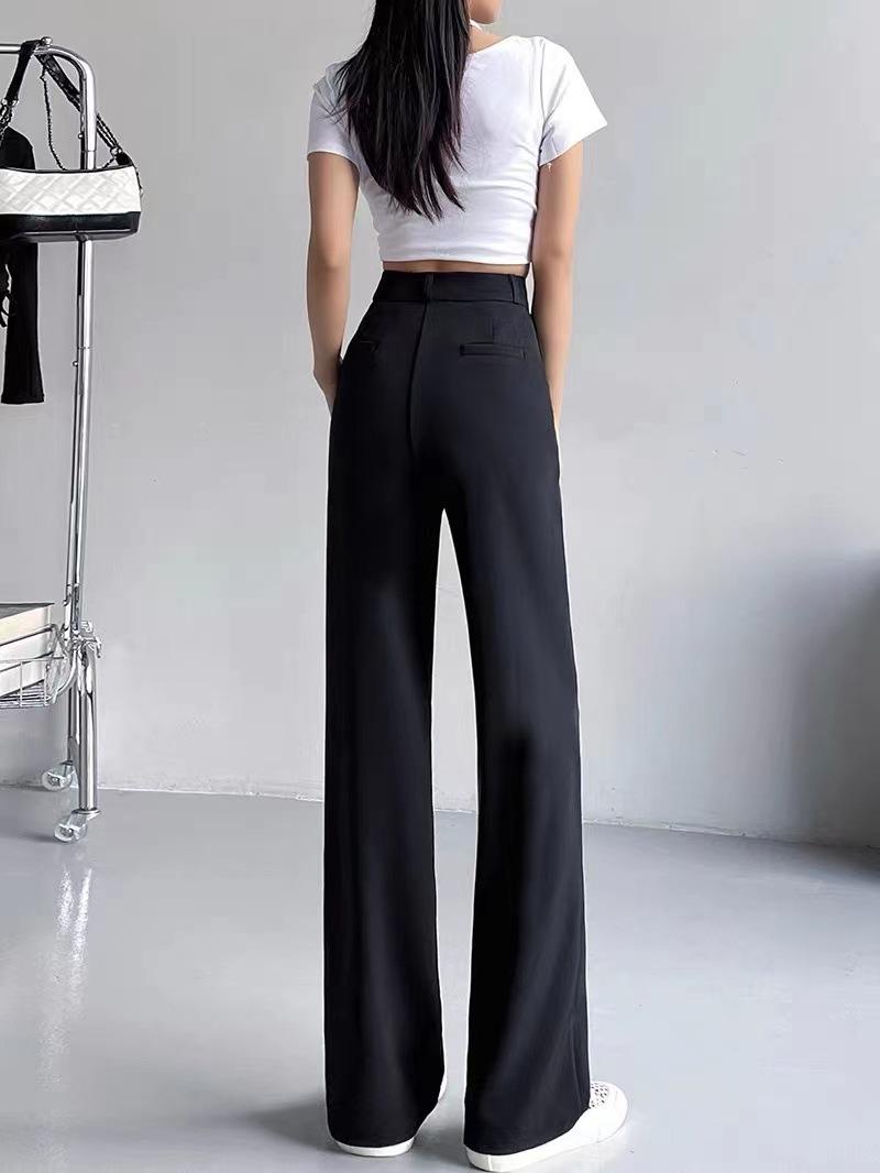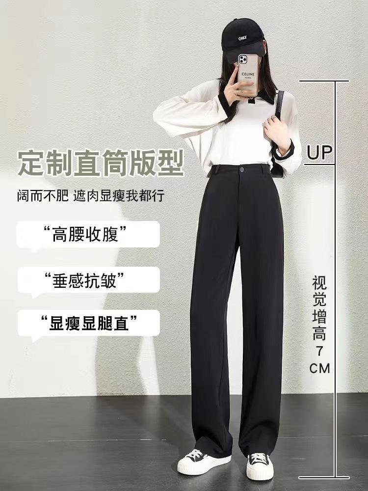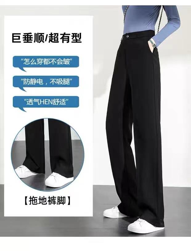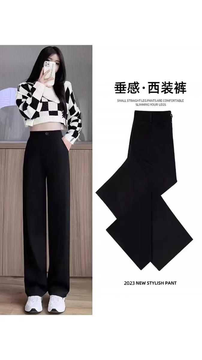 Compra Pantalones de traje para mujer Primavera y Otoño 2024 Nuevos Pantalones rectos estrechos negros de cintura alta drapeados casuales de pierna ancha pequeña al por mayor en Joom.pro