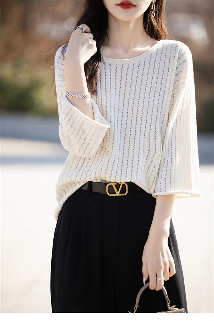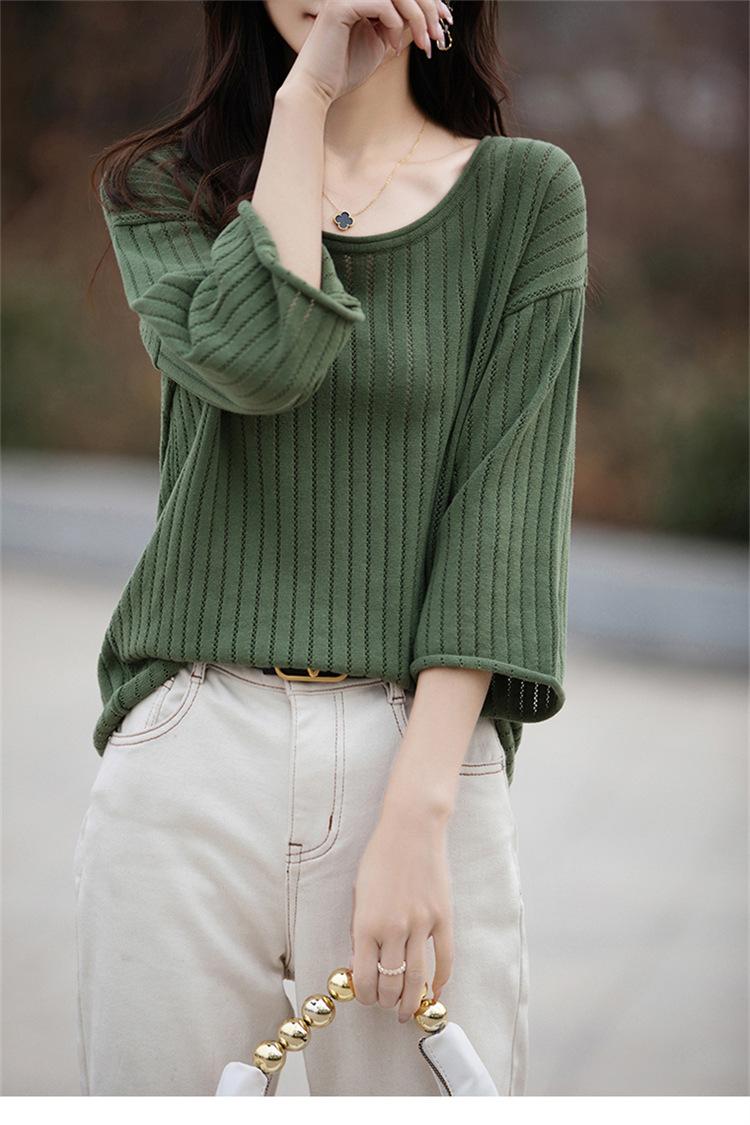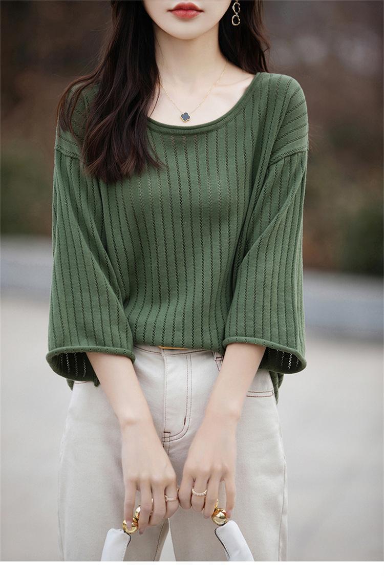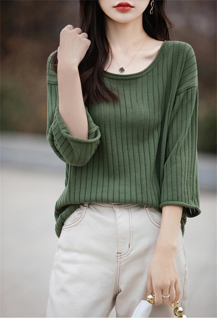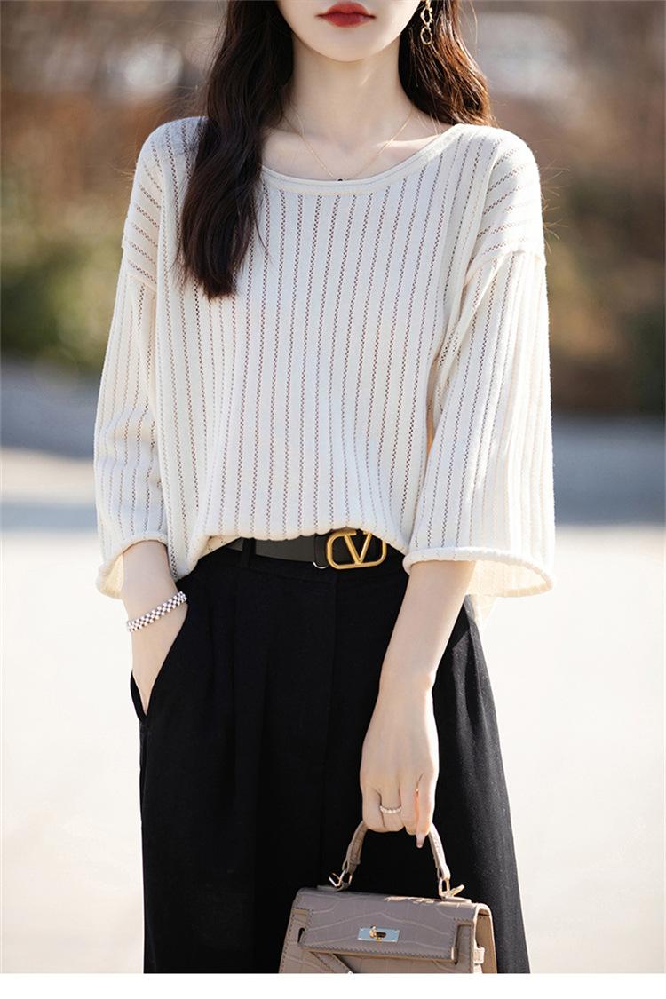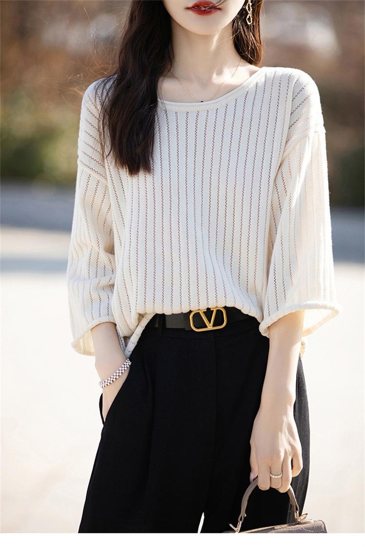 Jersey de talla grande de media manga de verano para mujer, jersey de punto hueco de algodón, camiseta, suéter fresco, versión suelta, manga 3/4