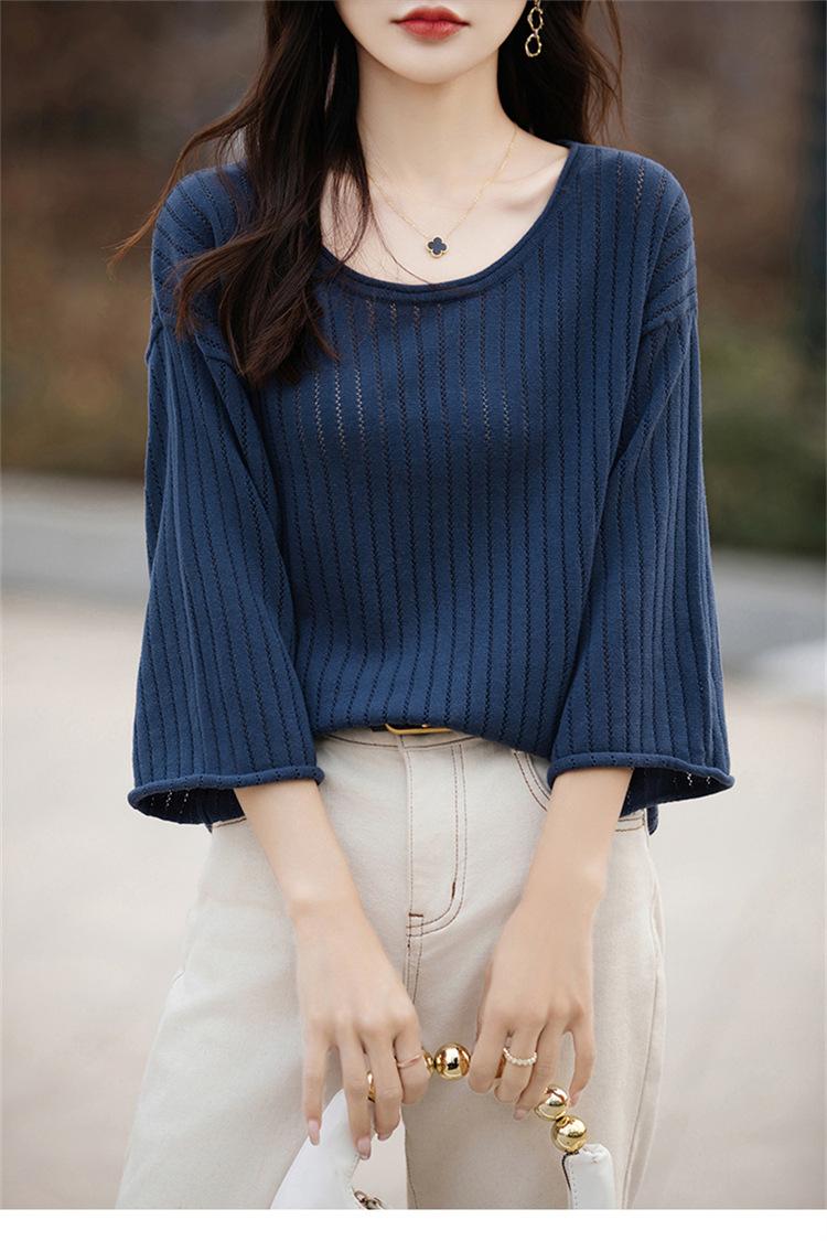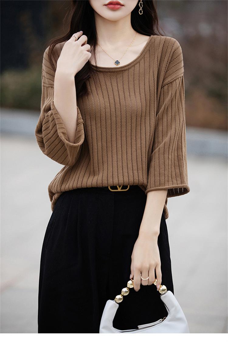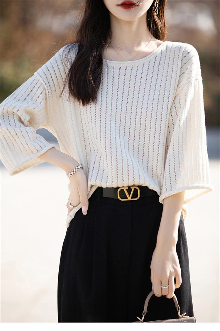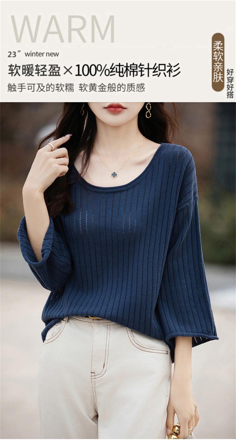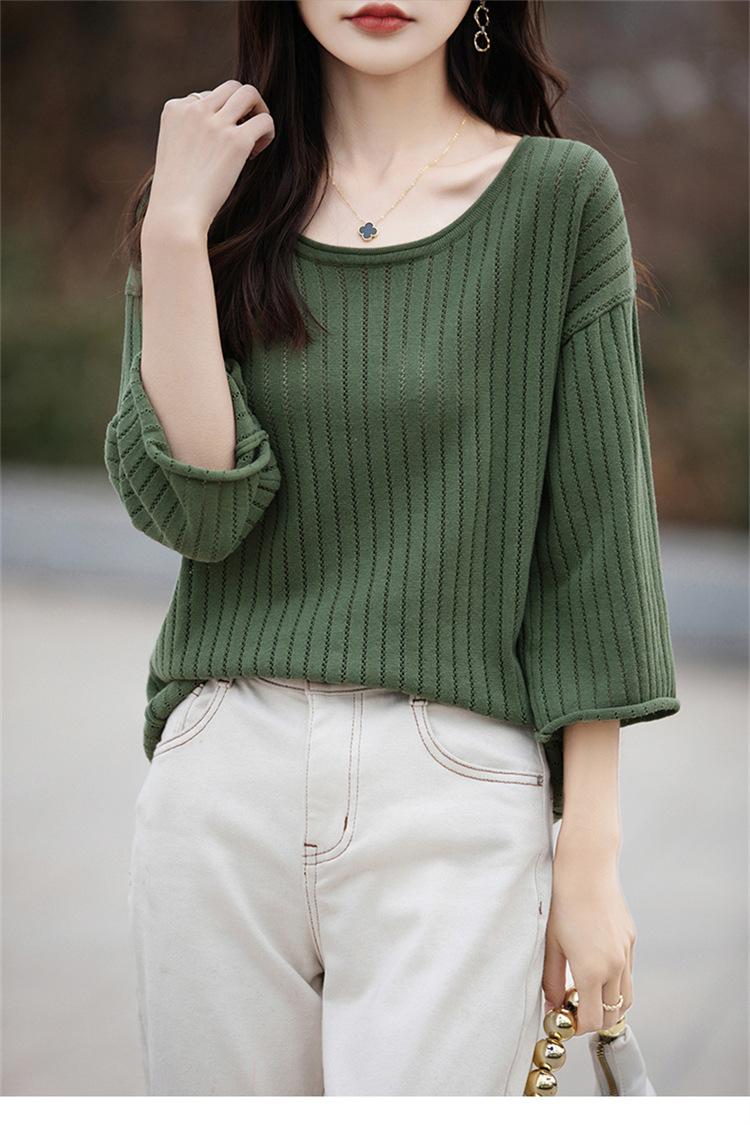 Jersey de talla grande de media manga de verano para mujer, jersey de punto hueco de algodón, camiseta, suéter fresco, versión suelta, manga 3/4