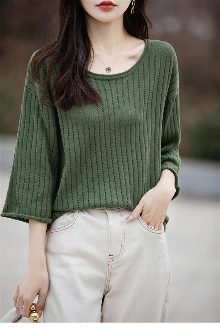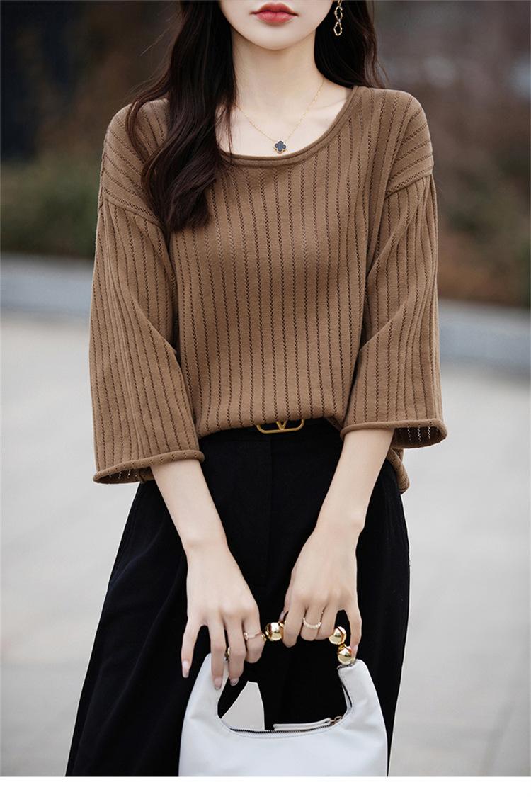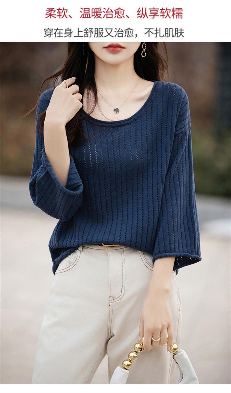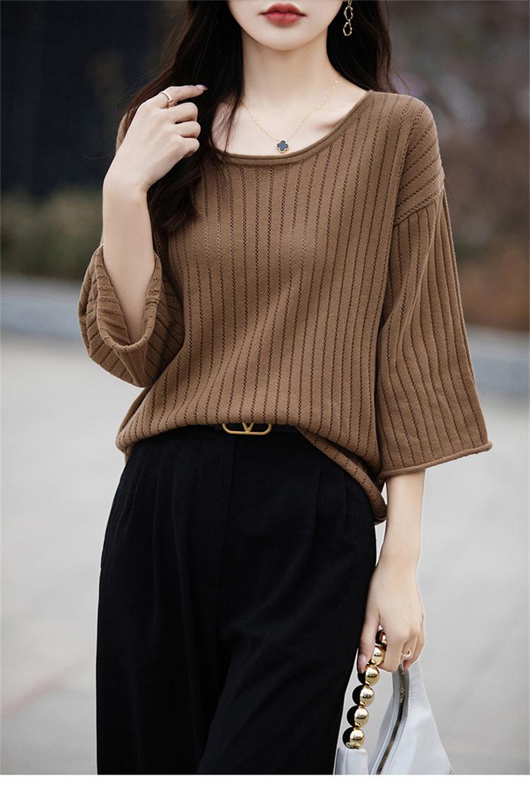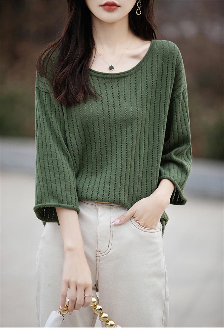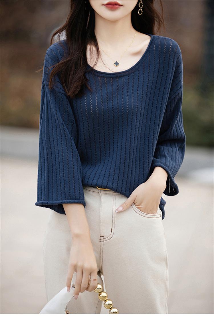 Jersey de talla grande de media manga de verano para mujer, jersey de punto hueco de algodón, camiseta, suéter fresco, versión suelta, manga 3/4