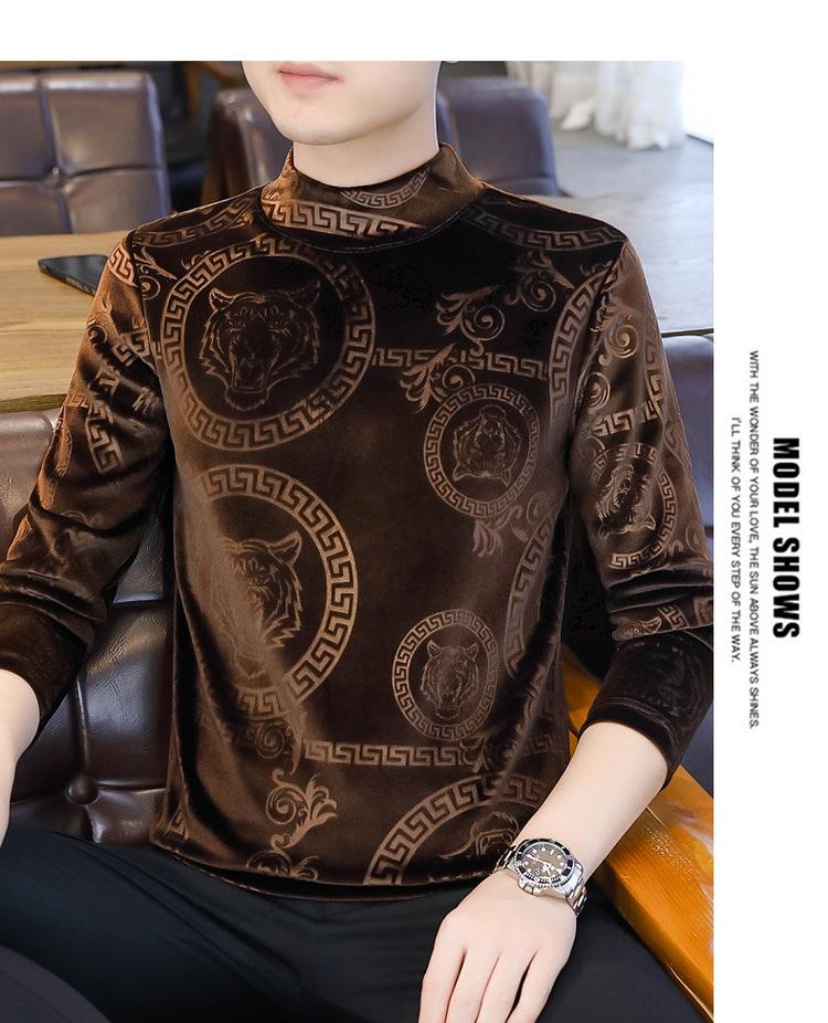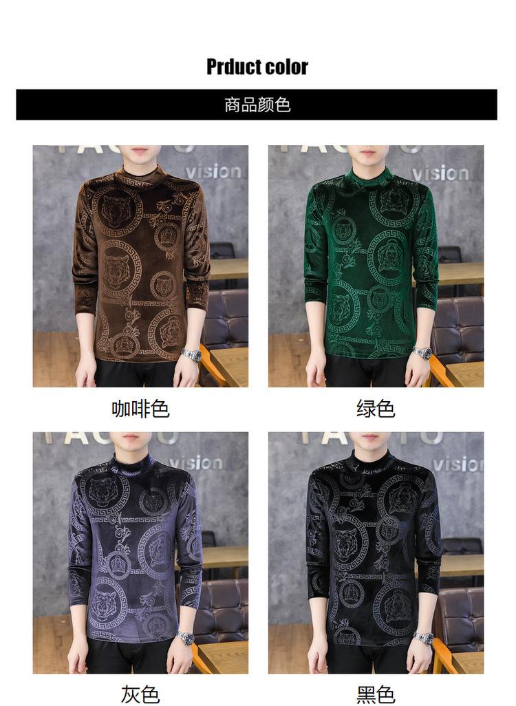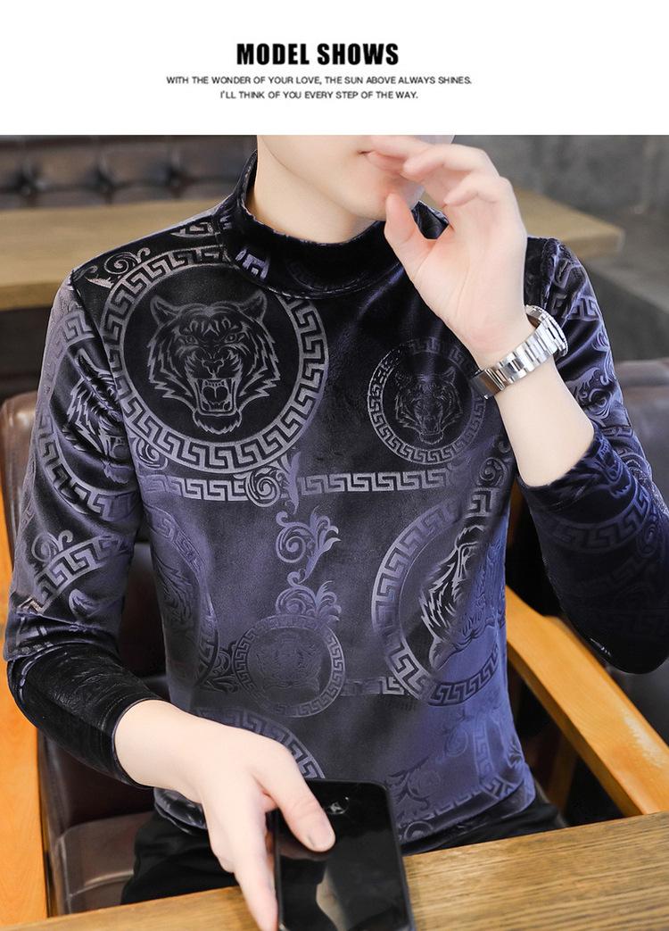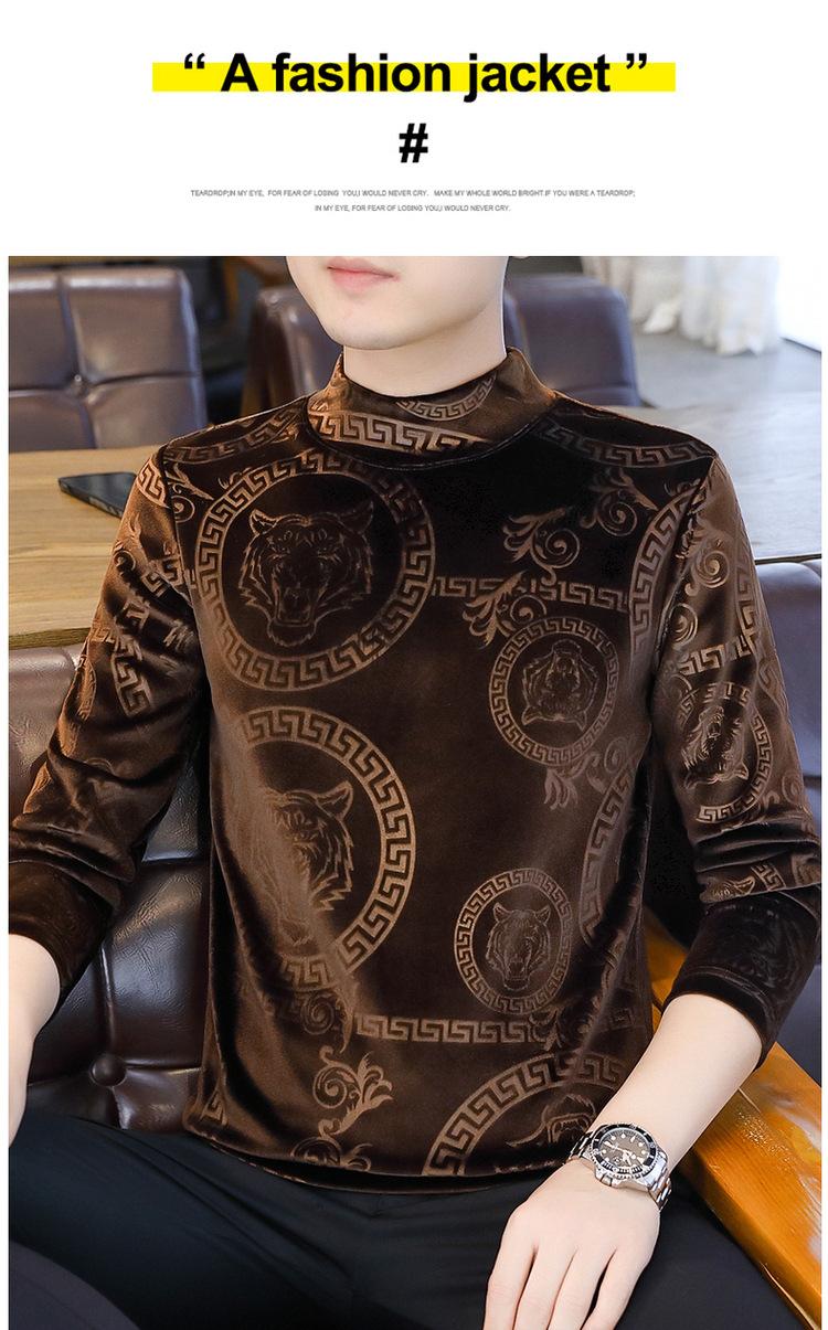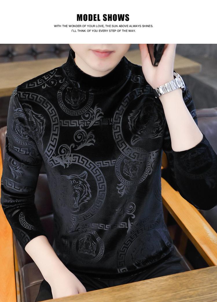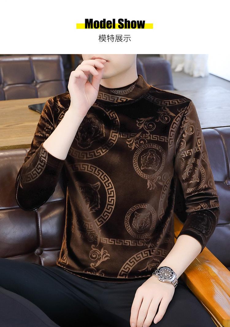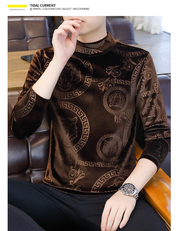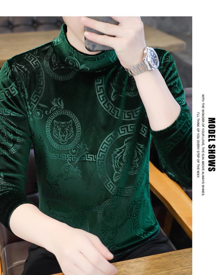 Suéter de manga larga de cuello medio de terciopelo dorado para otoño e invierno, nueva marca de moda para hombre, camiseta de cuello alto cálida y gruesa, camisa de fondo