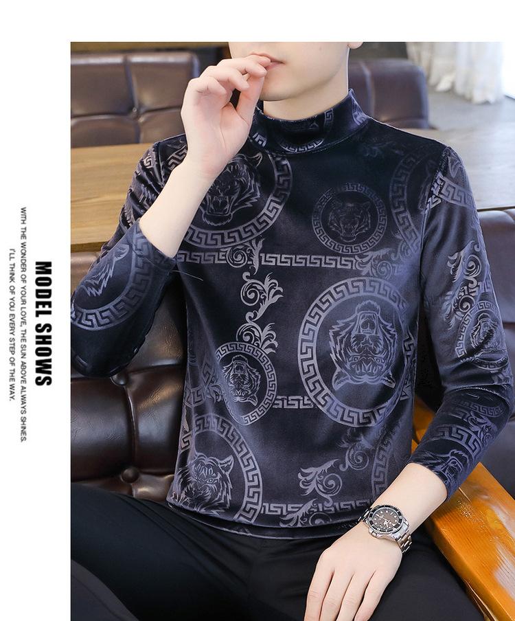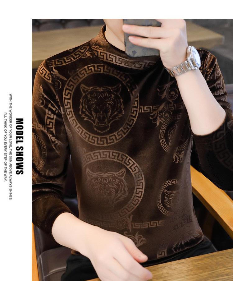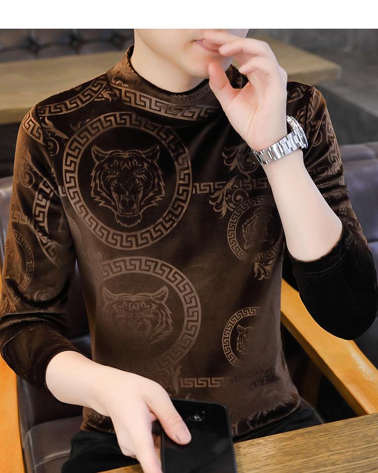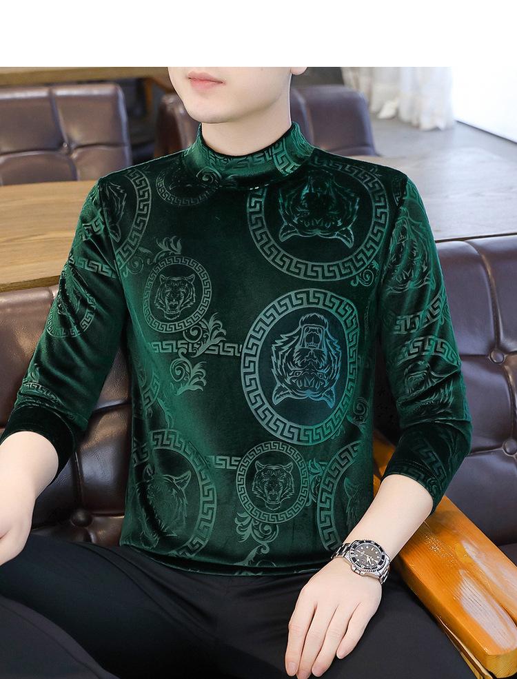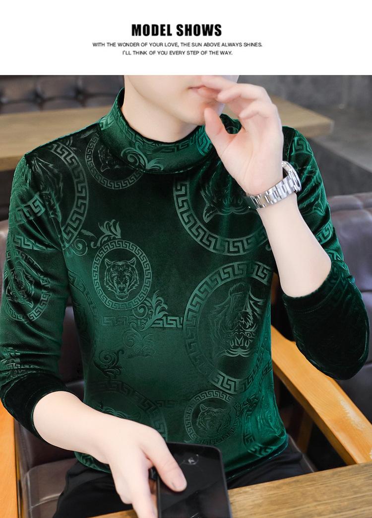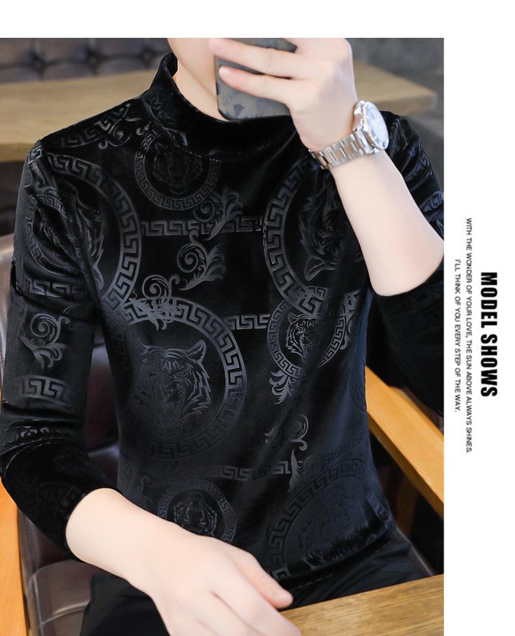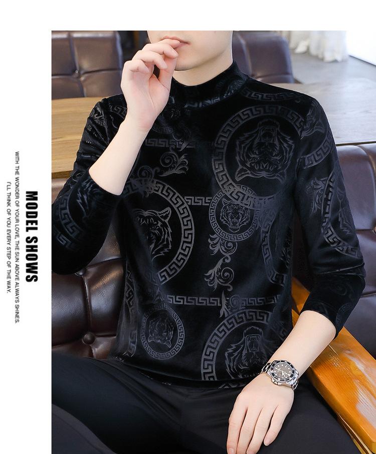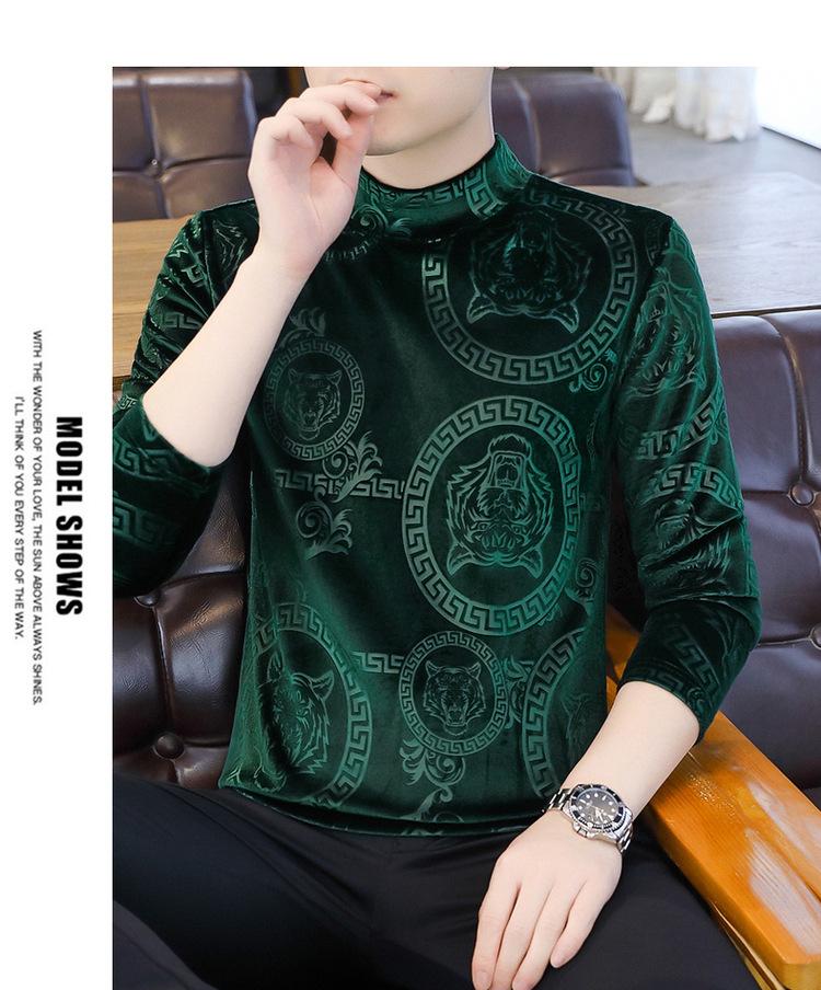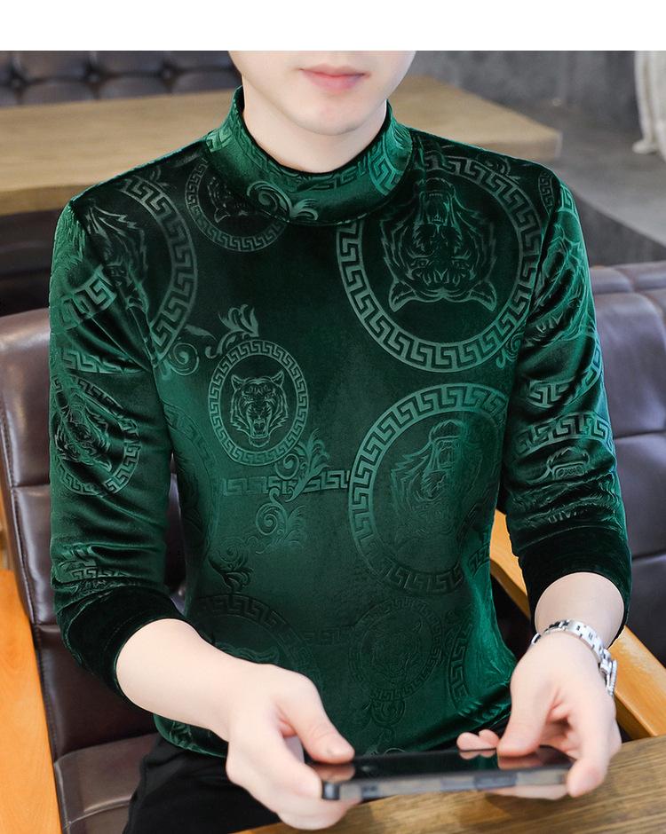 Suéter de manga larga de cuello medio de terciopelo dorado para otoño e invierno, nueva marca de moda para hombre, camiseta de cuello alto cálida y gruesa, camisa de fondo