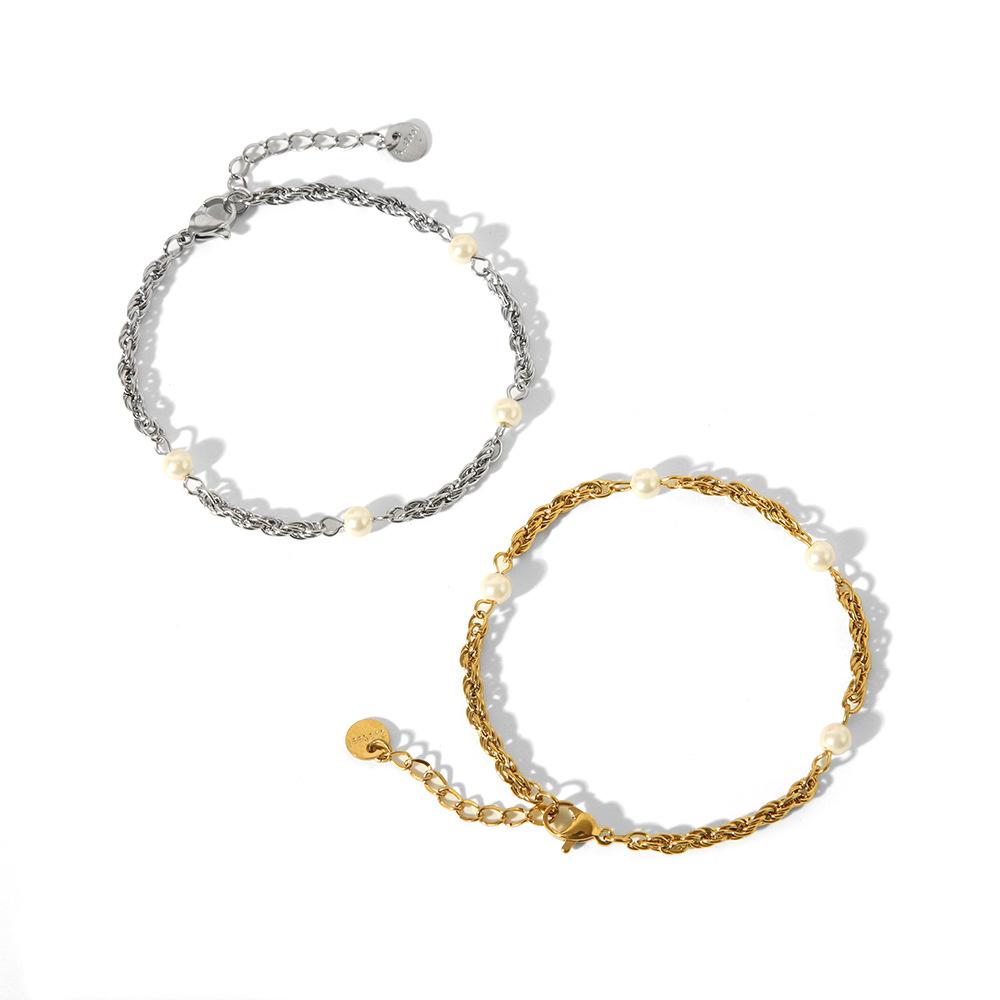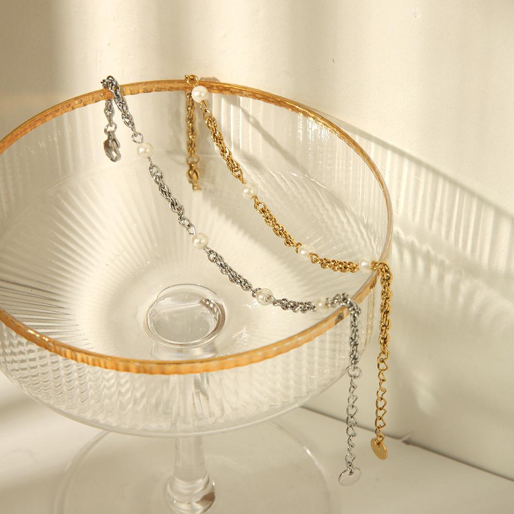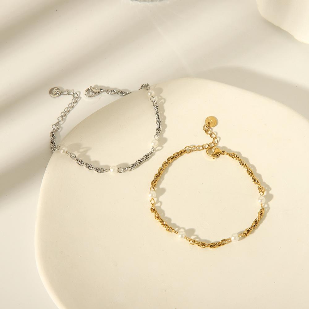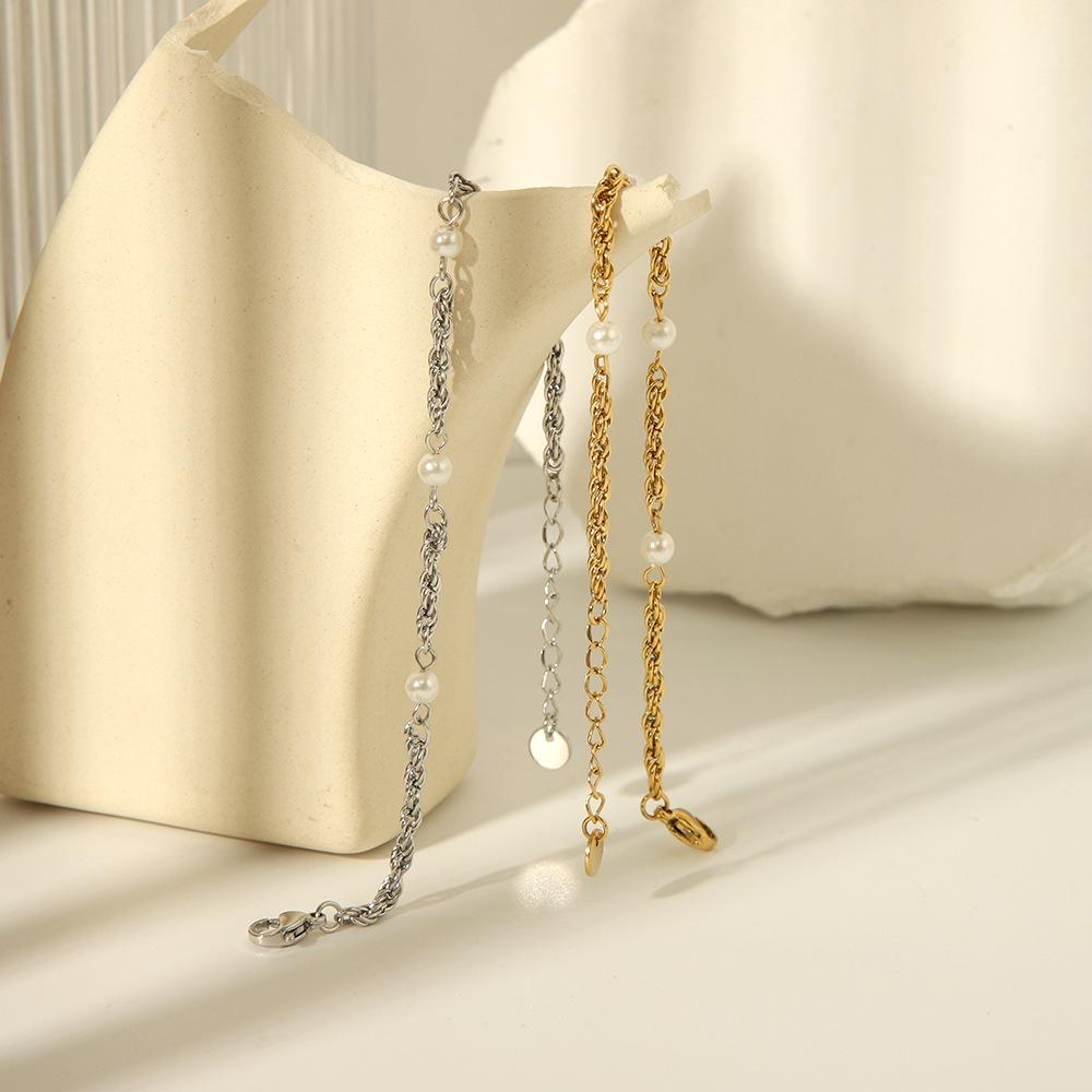 Pulsera de acero inoxidable estilo retro francés de cadena retorcida de perlas de 18K, moda simple, comodín, para damas, venta al por mayor