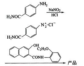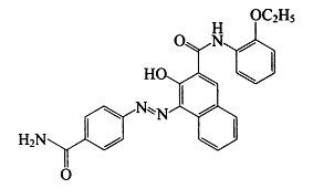 Añadir 13,6 partes (masa) de 1-amino-4-benzamida a 60 partes (volumen) de ácido clorhídrico de 5 mol/L, agitar ligeramente y diluir con agua. A 10 °C, diazotar con 20 partes (volumen) de solución de nitrito de sodio de 5 mol/L para obtener un diazo líquido. Mezclar 32 partes (masa) de N-(2-etoxifenil)-2-hidroxi-3-naftamida y 1000 partes (volumen) de piridina. Añadir el diazo líquido a 25-30 °C en un plazo de 30-45 min. Tras la adición, agitar durante 1 h más. Filtrar, vaporizar hasta que no quede piridina, lavar con agua y secar para obtener el producto.