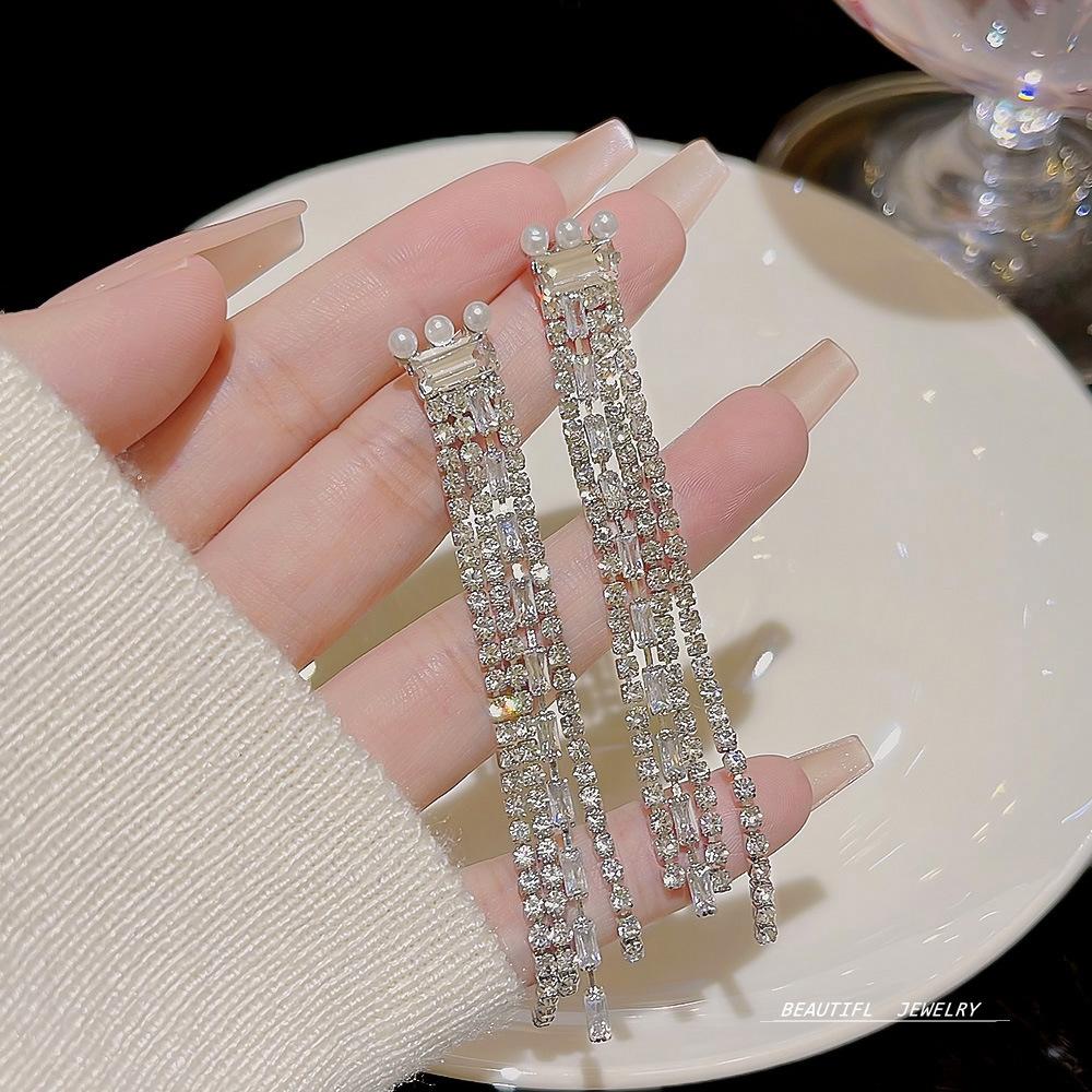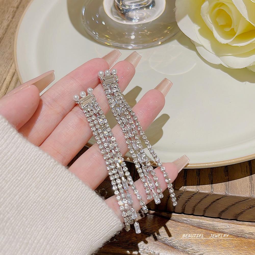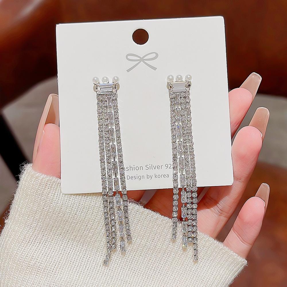 Pendientes Largos de Borla de Perlas de Temperamento Aguja de Plata 2025 Nuevo Diseño Nicho Pendientes Celebridad de Internet Joyería al Mayoreo