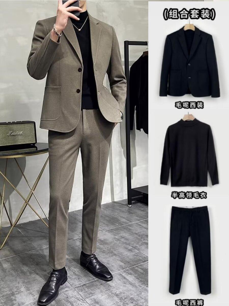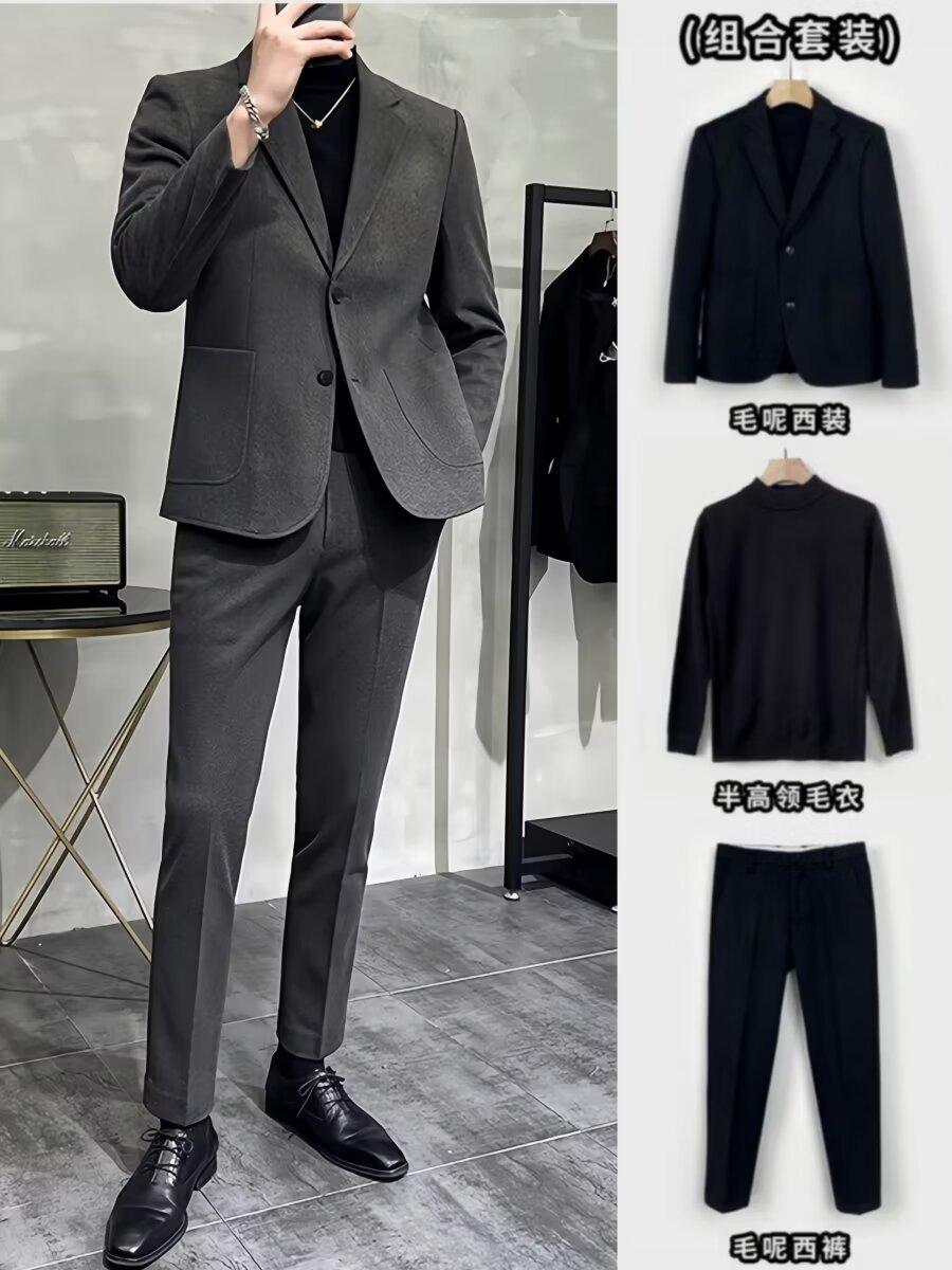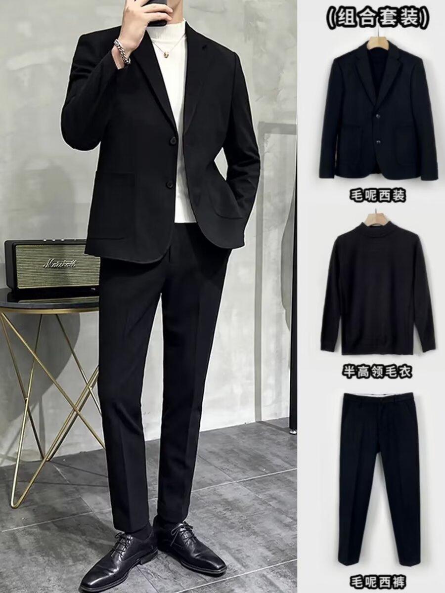 Grey Suit Black Sweater Black Pants, Brown Suit Black Sweater Black Pants, Black Suit White Sweater Black Pant...