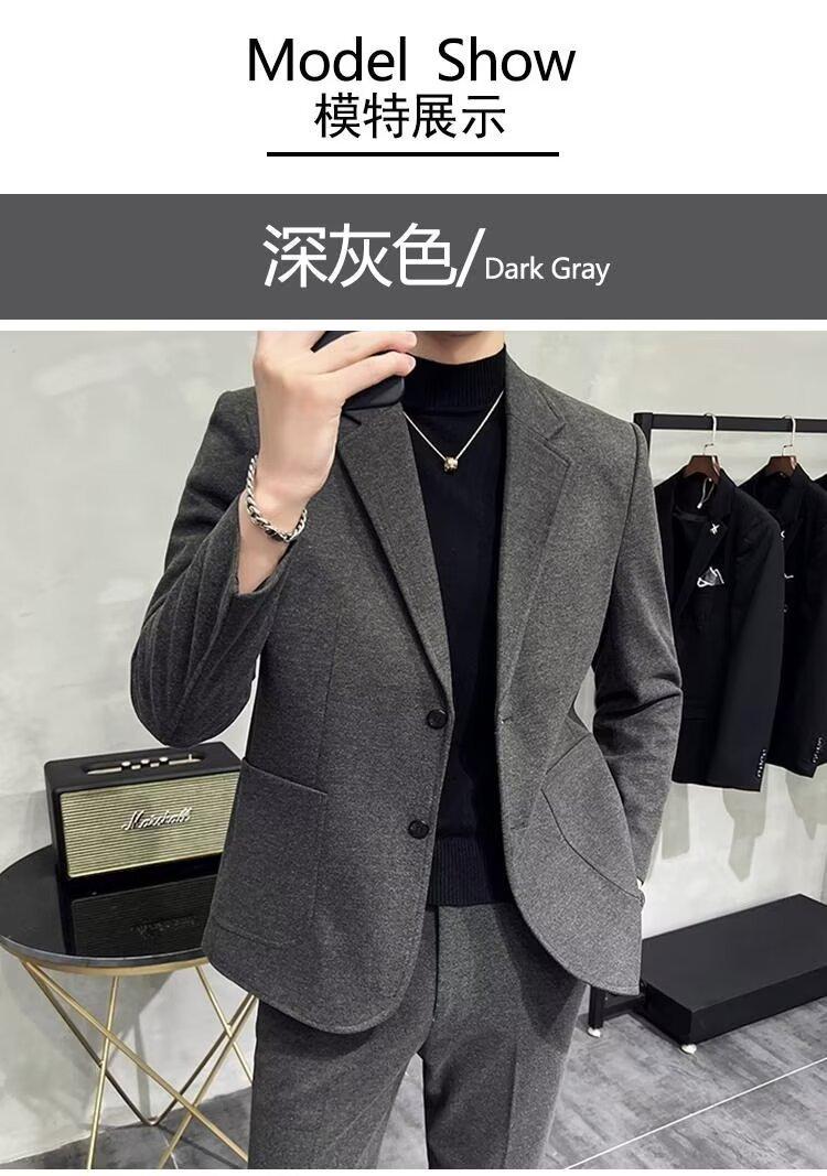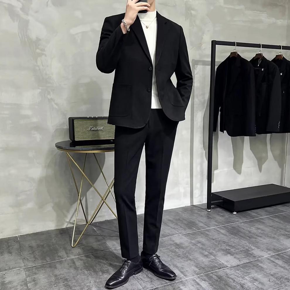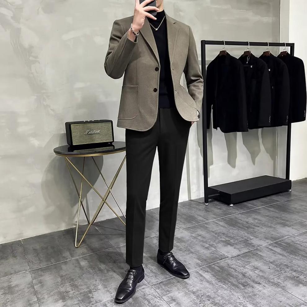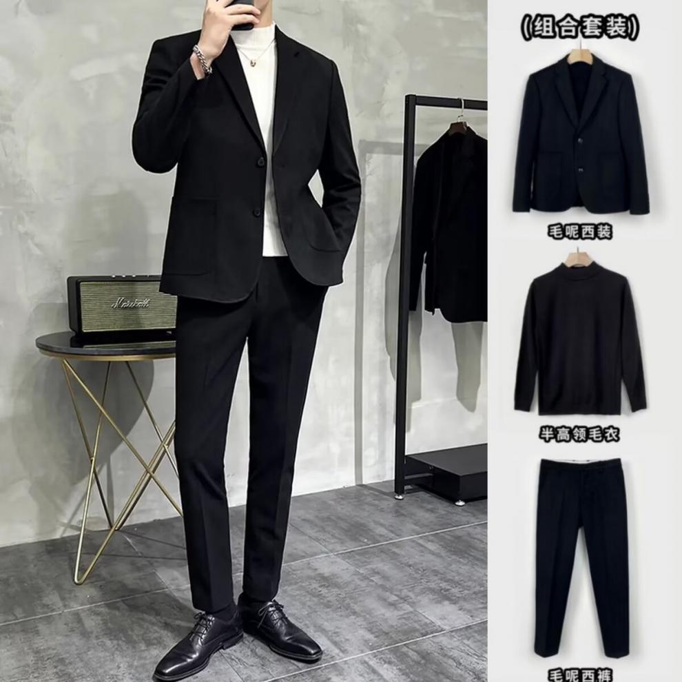 Grey Suit Black Sweater Black Pants, Brown Suit Black Sweater Black Pants, Black Suit White Sweater Black Pant...