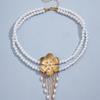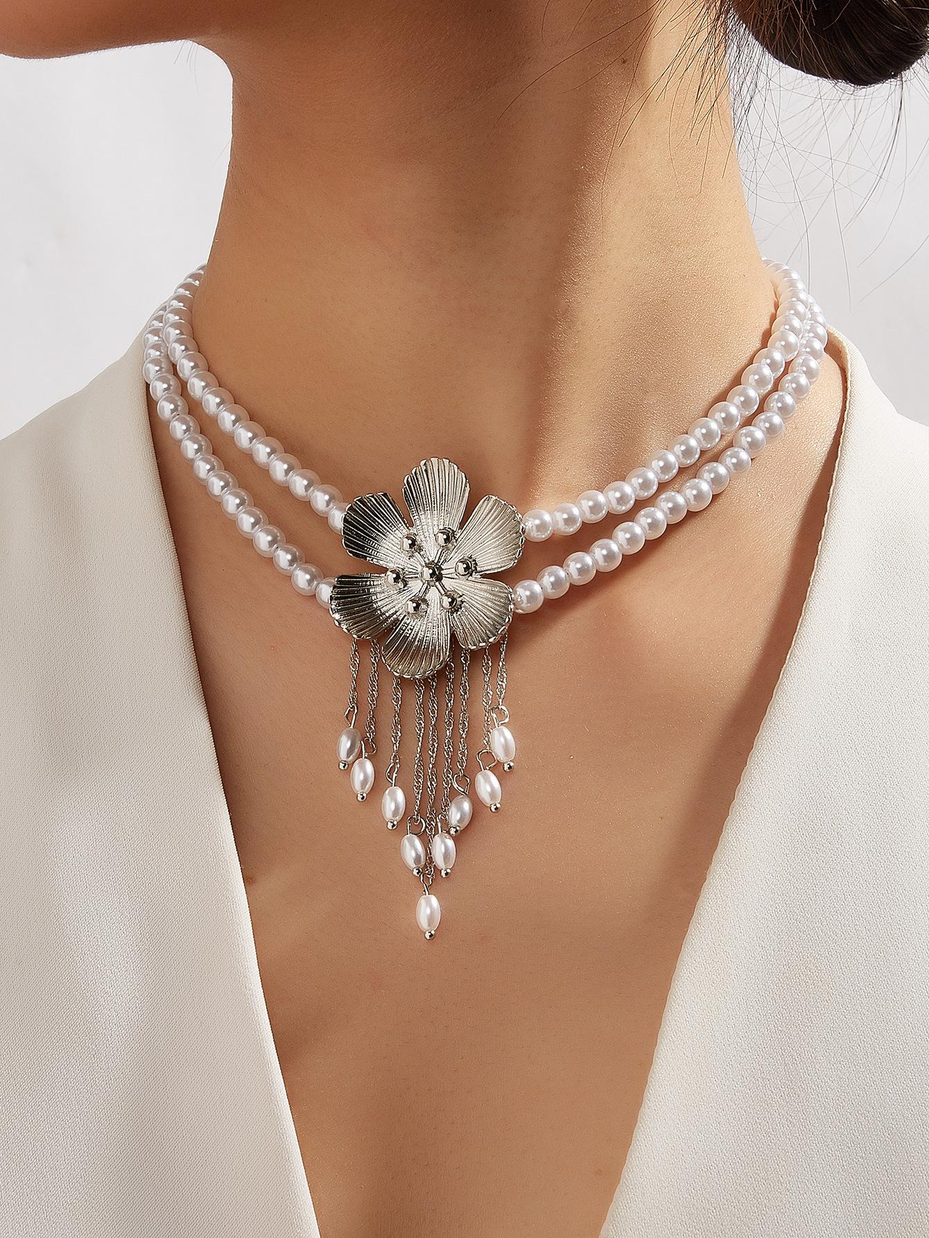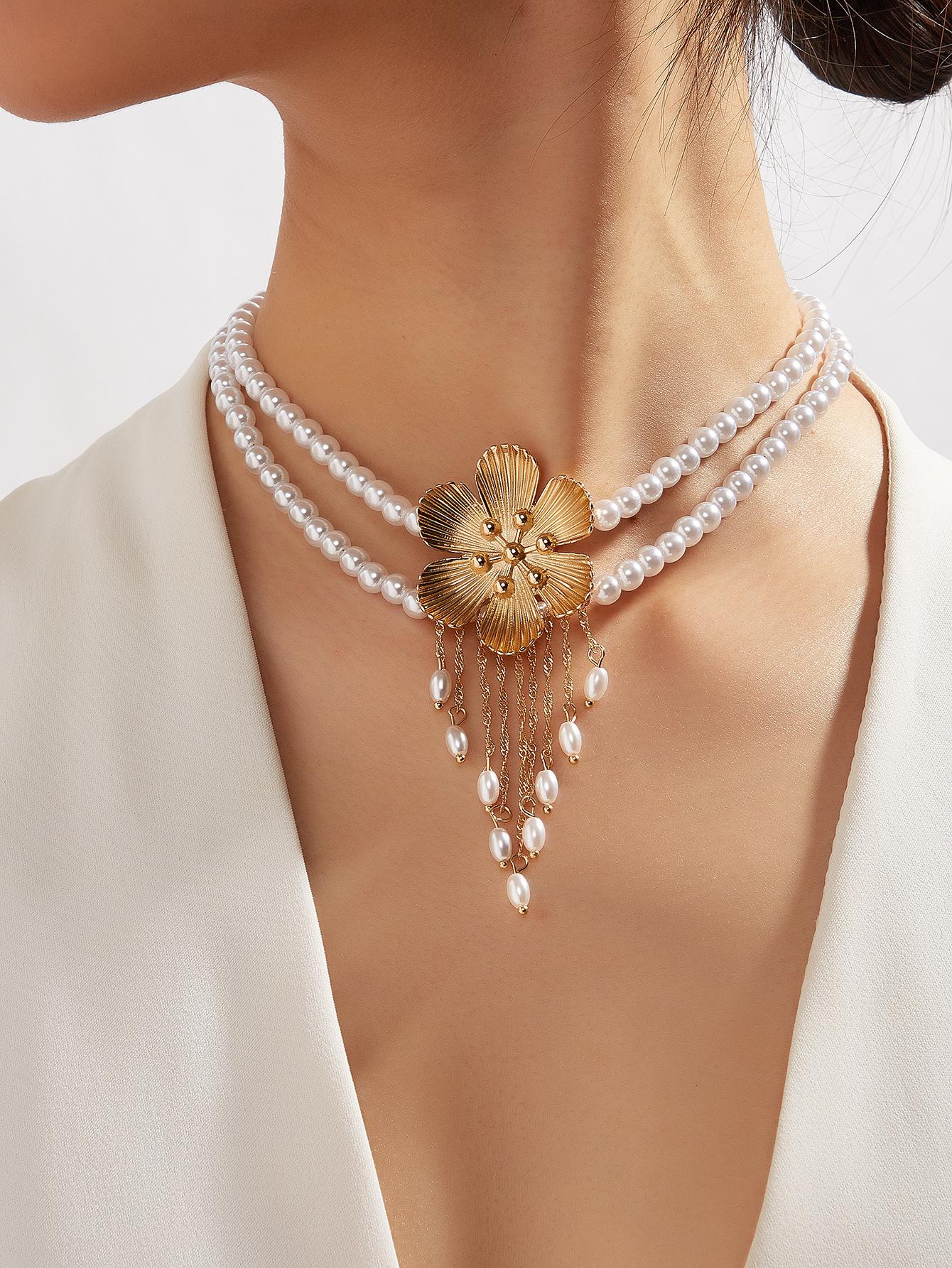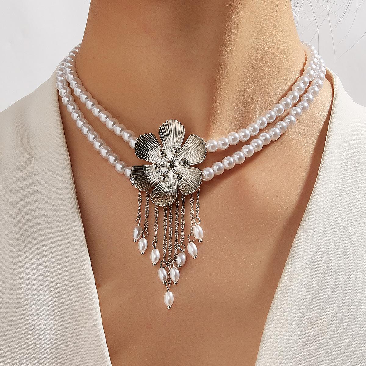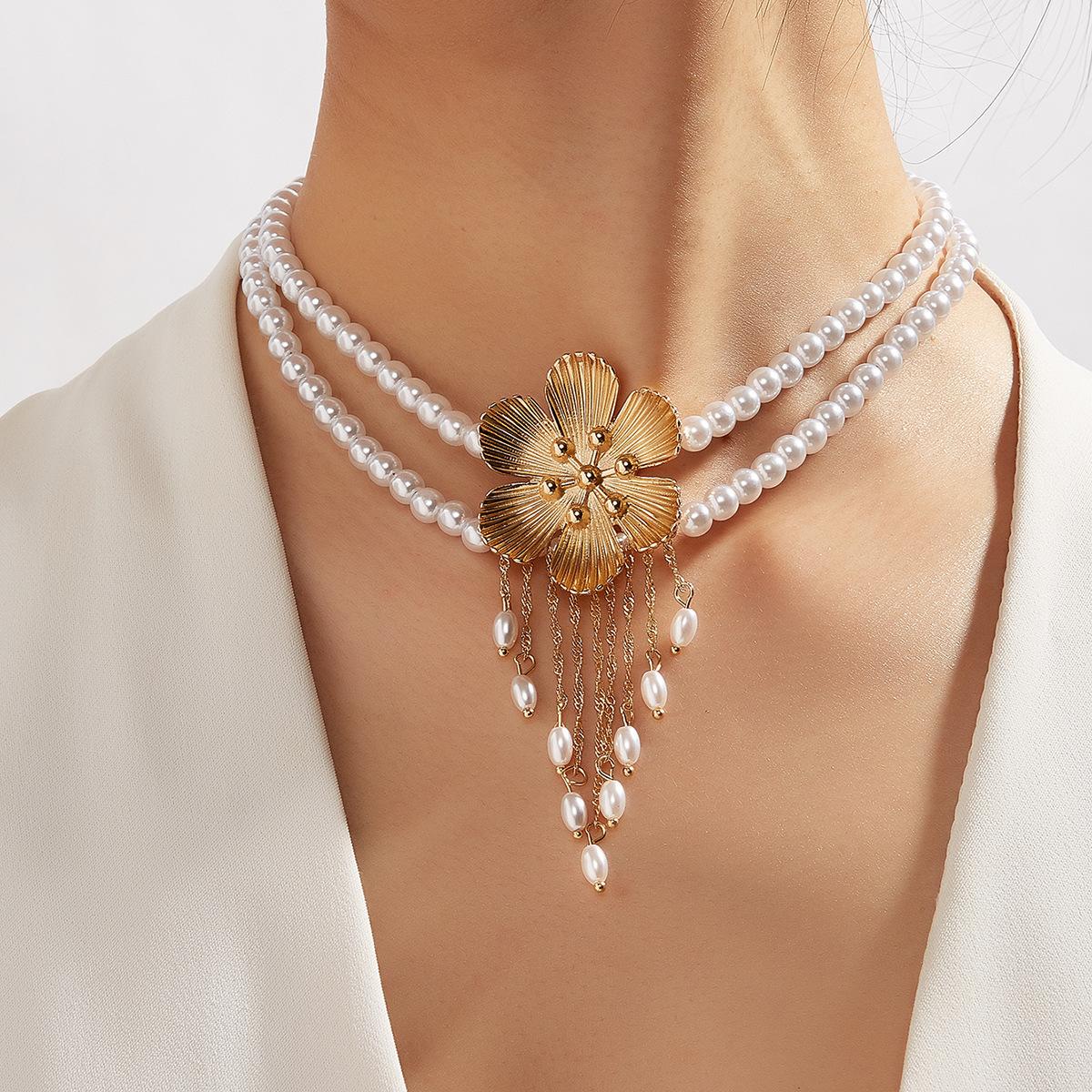 Elegante gargantilla retro francesa de flor con borla de perlas, collar de cadena para la clavícula femenina, collar de diamantes