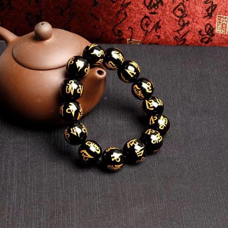 12mm17 pieces [six words mantra] Obsidian bracelet
