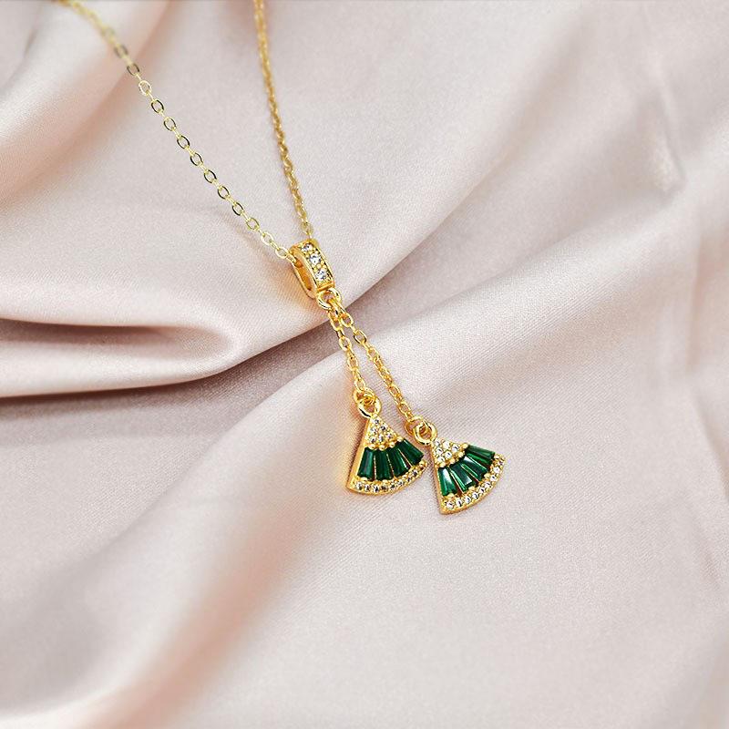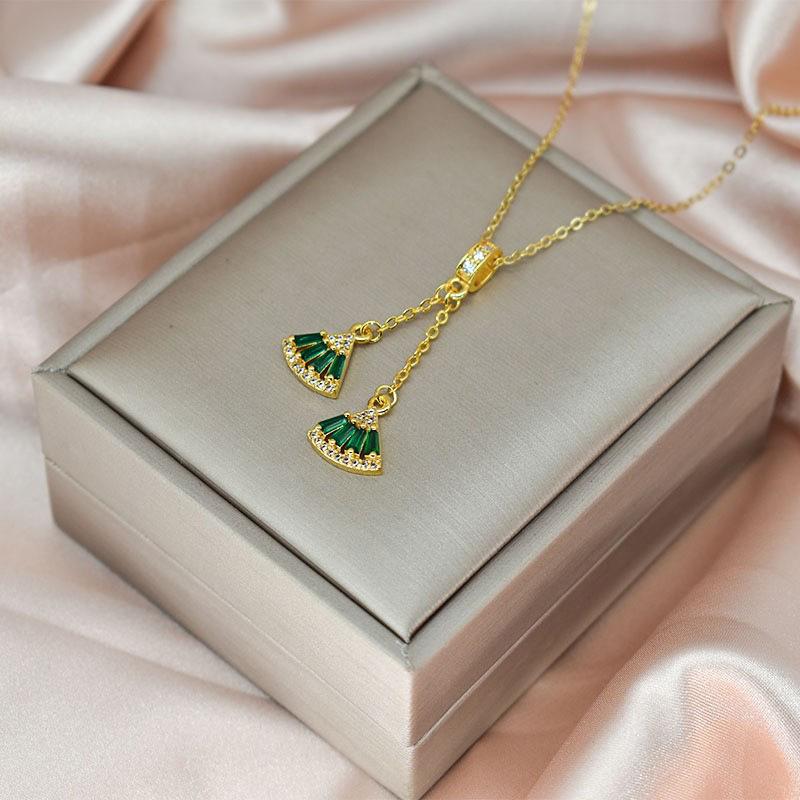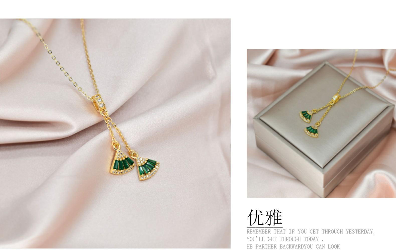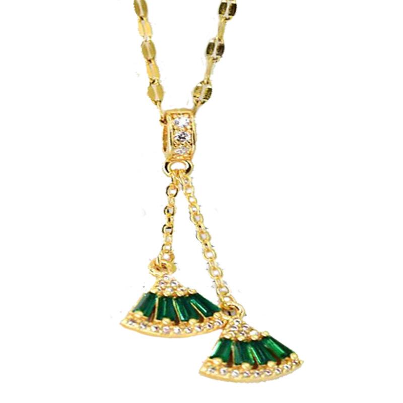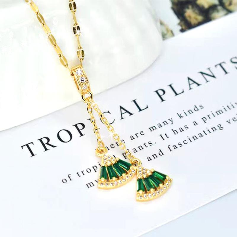Collar de falda pequeña con borlas verdes para mujer, colgante de abanico de alta gama con microincrustaciones, cadena de clavícula de acero de titanio sin color, primera joyería