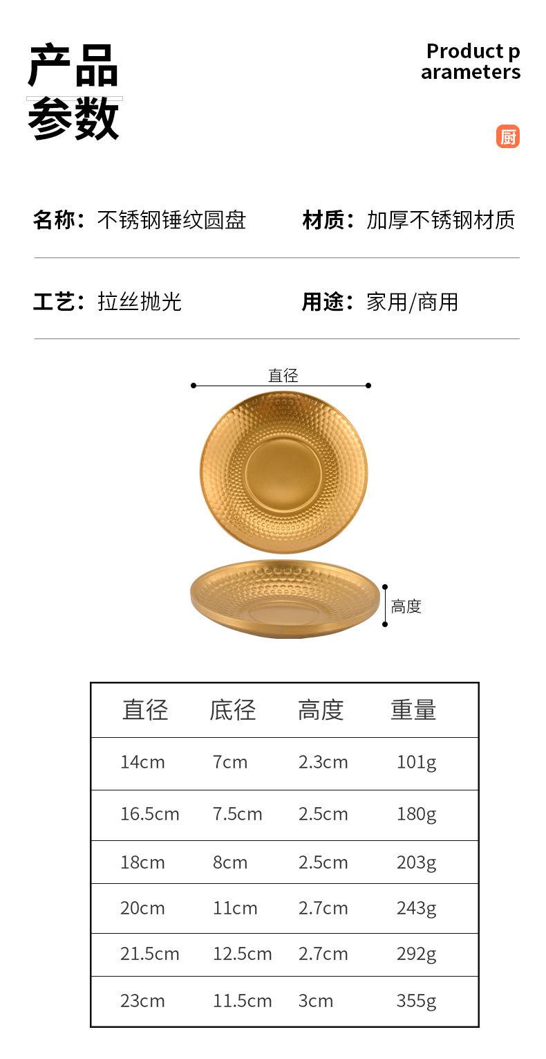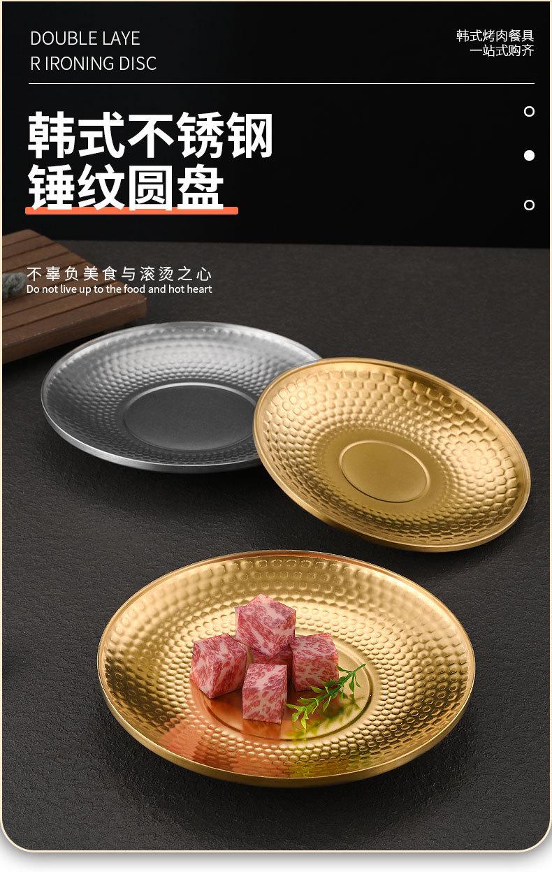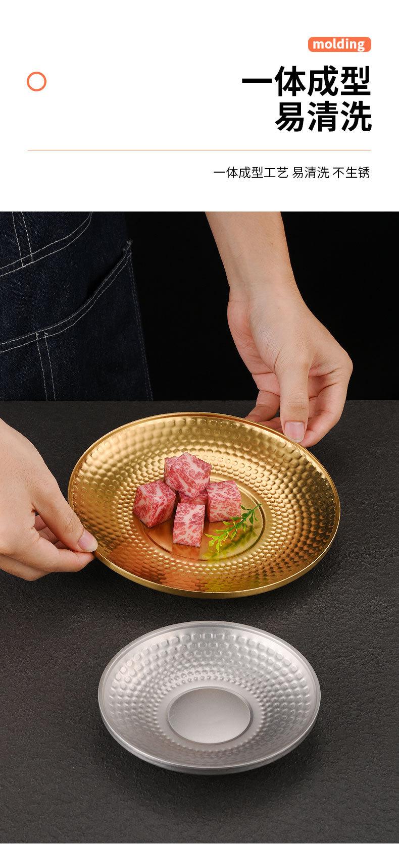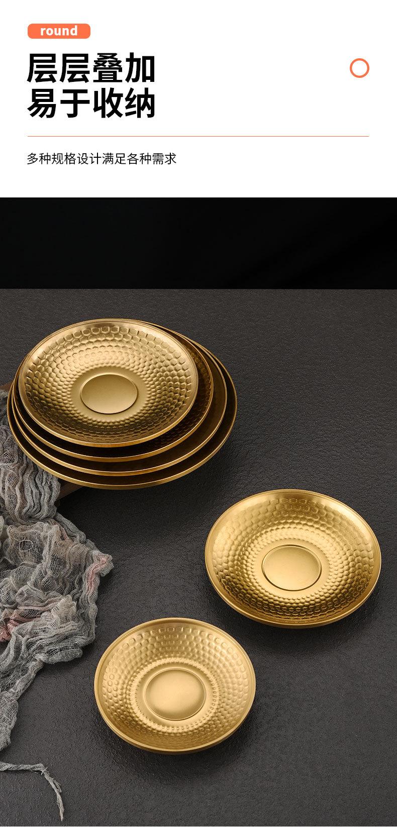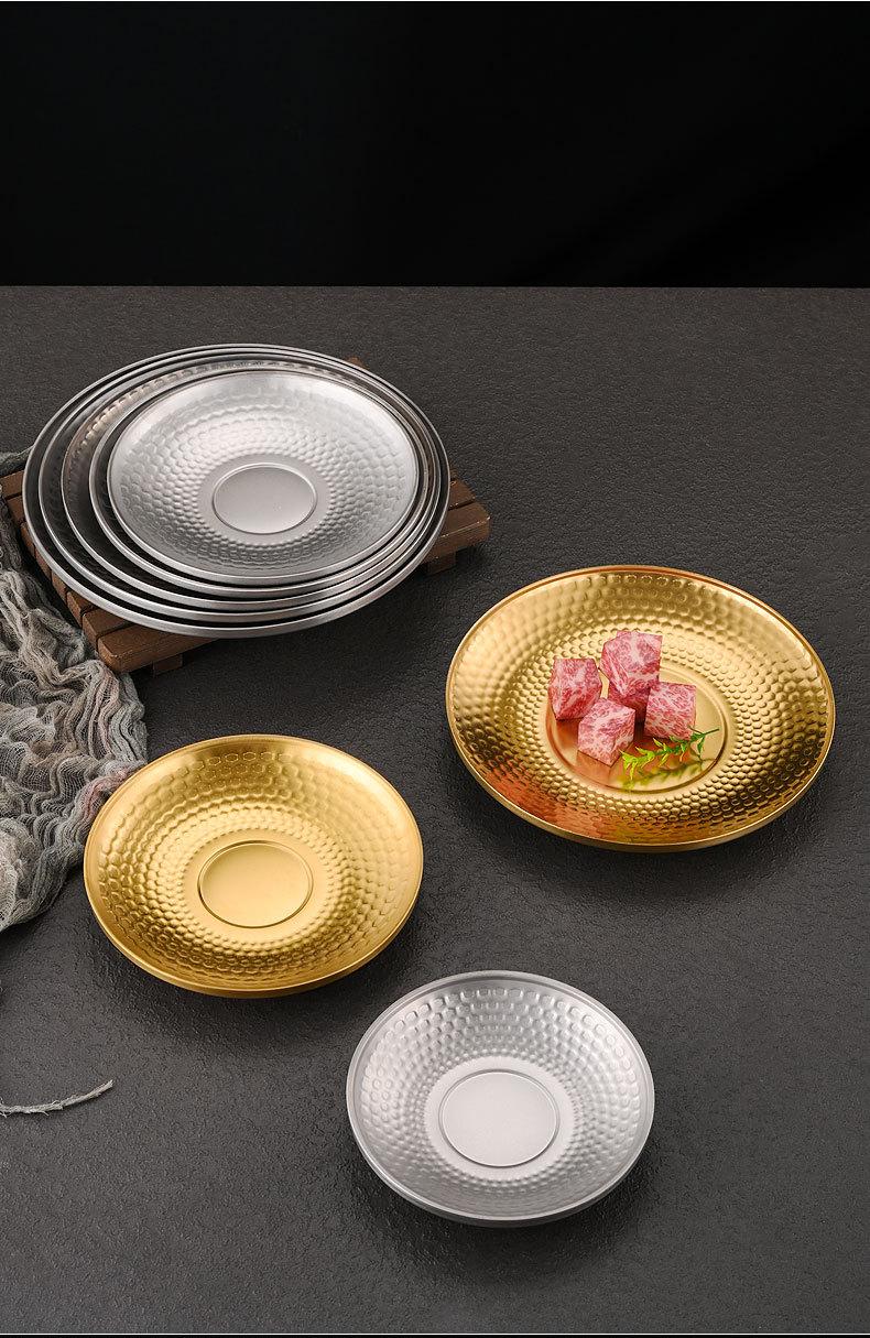 Suministro Directo de Plato Redondo Creativo Martillado de Acero Inoxidable 304 Comercial para Barbacoa Restaurante Dorado Plato Hondo para Snacks Postres Pastel