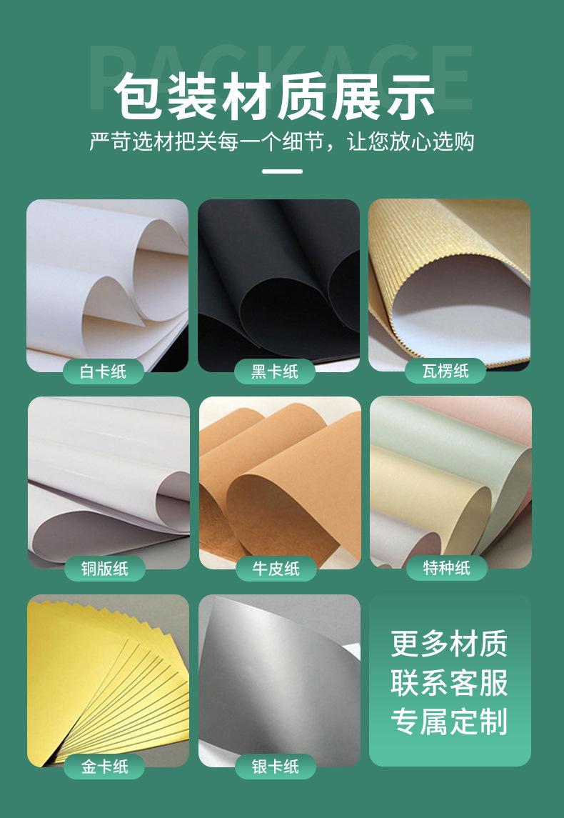 【Material】Varios tipos de papel están disponibles para selección, como cartulina blanca, papel estucado, papel kraft, papel corrugado, papel de aluminio, papel especial, blanco sobre blanco, blanco sobre gris, papel de escritura, etc.