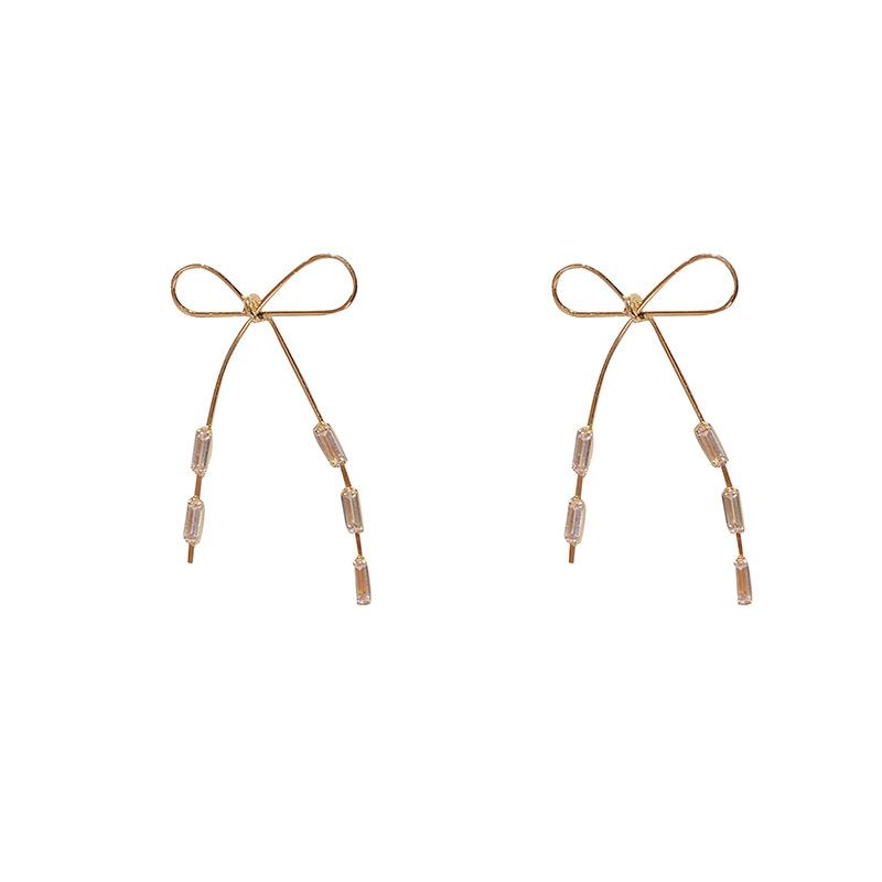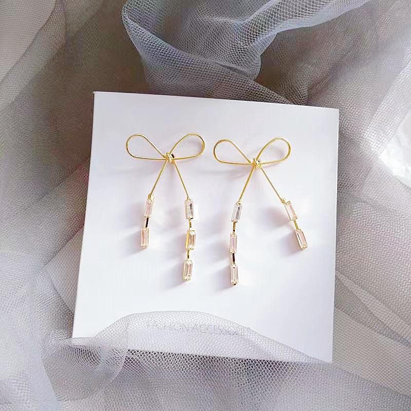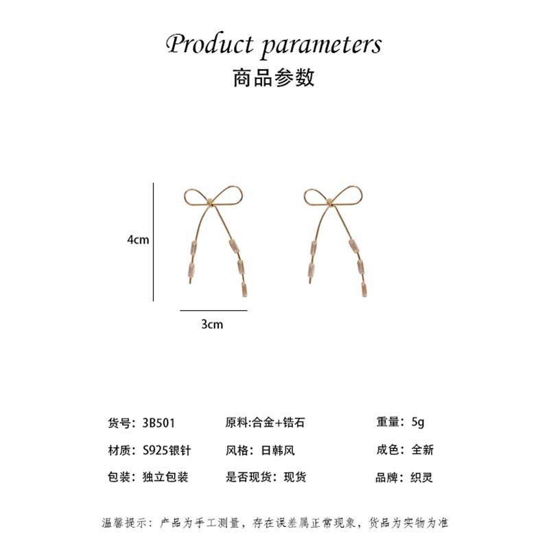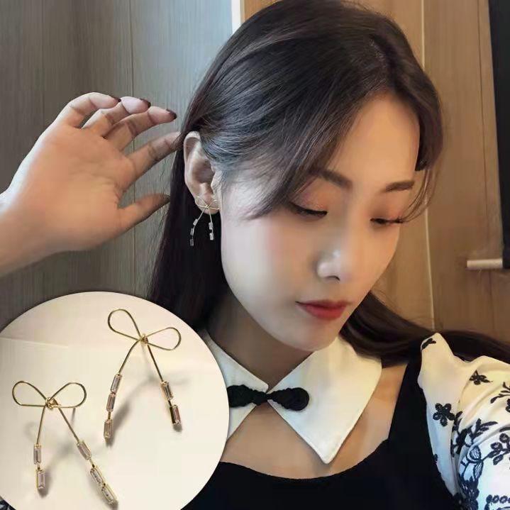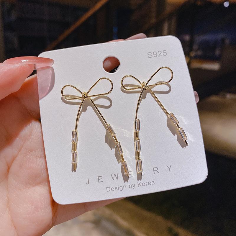 Exquisitos pendientes con forma de aguja de plata S925 con forma de lazo de diamantes de celebridades de Internet, pendientes sencillos y lindos con temperamento de súper hada para mujer