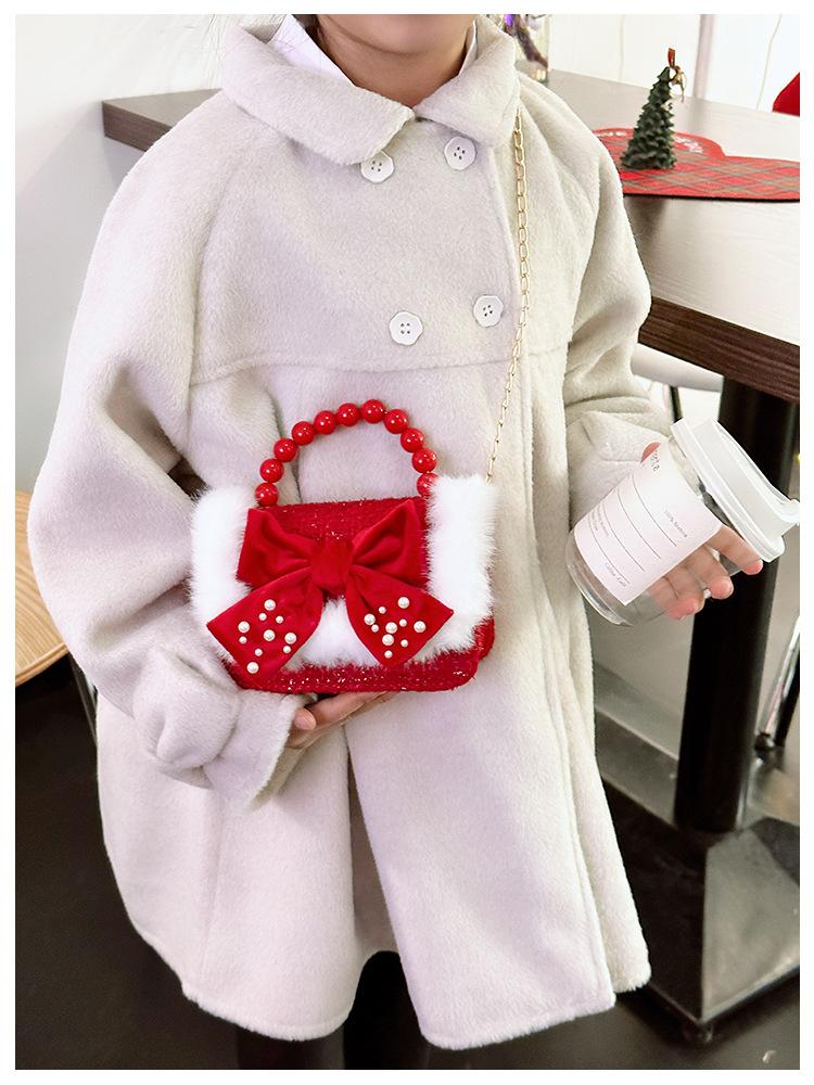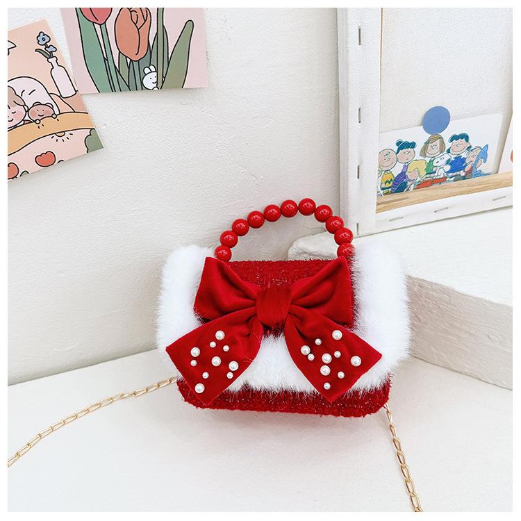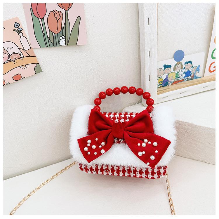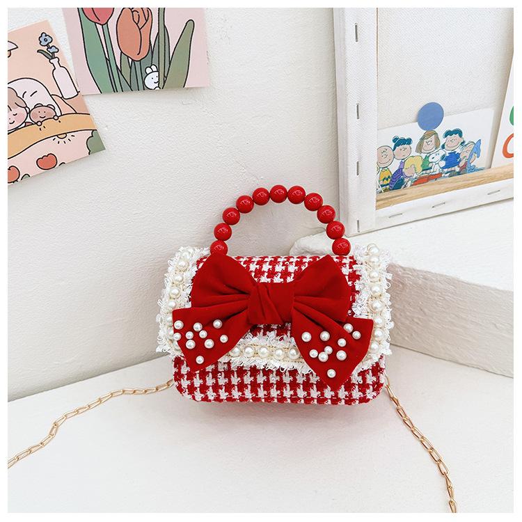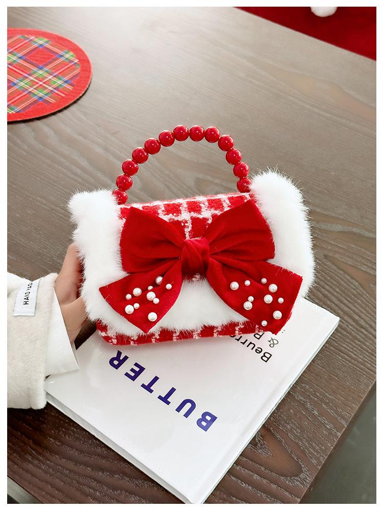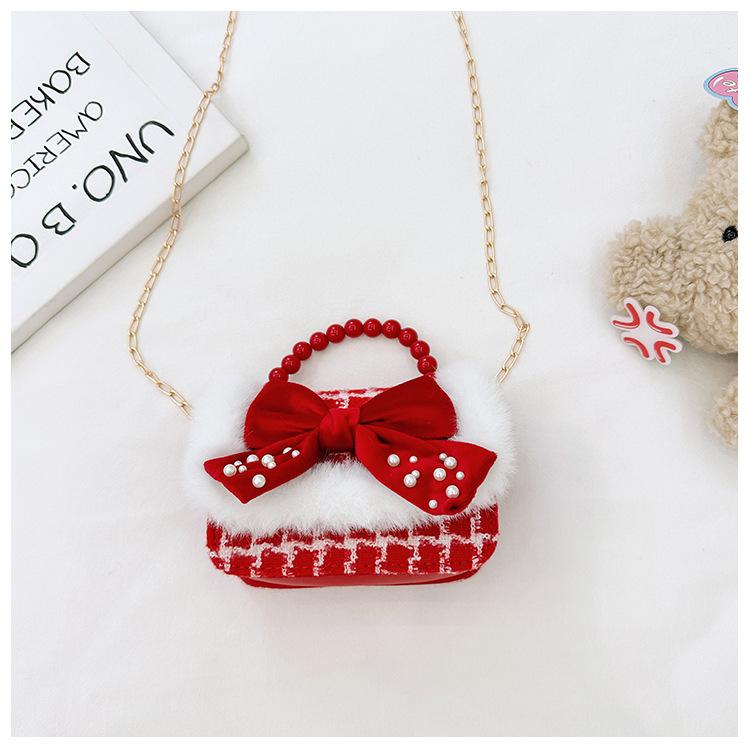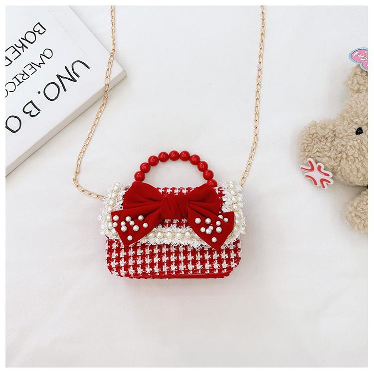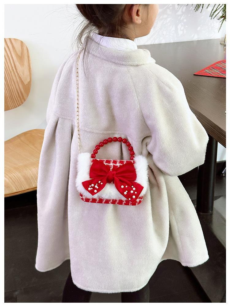 Bolso cuadrado pequeño para niños, bolso de perlas de moda para otoño e invierno, bolso de hombro de tela con lazo para niñas con festival de Año Nuevo para niños