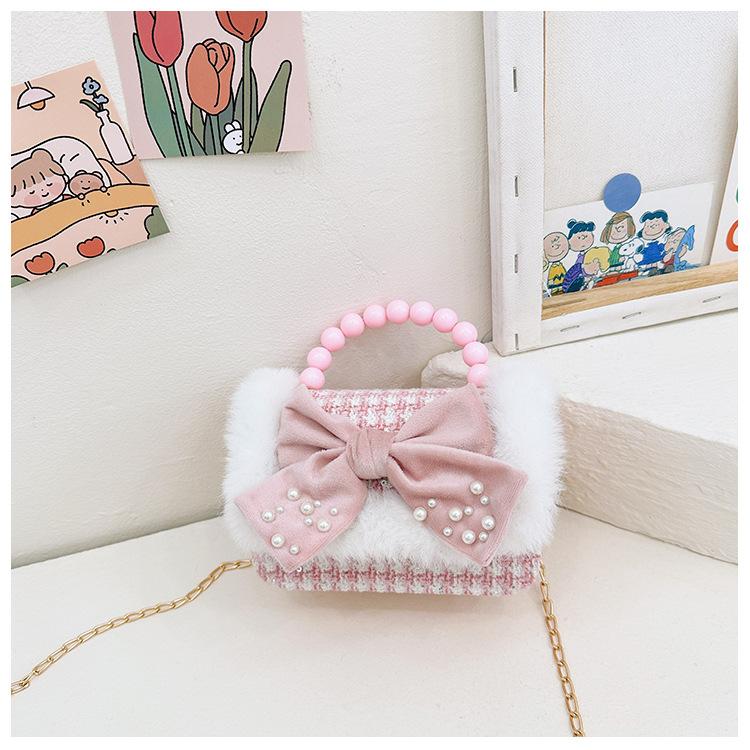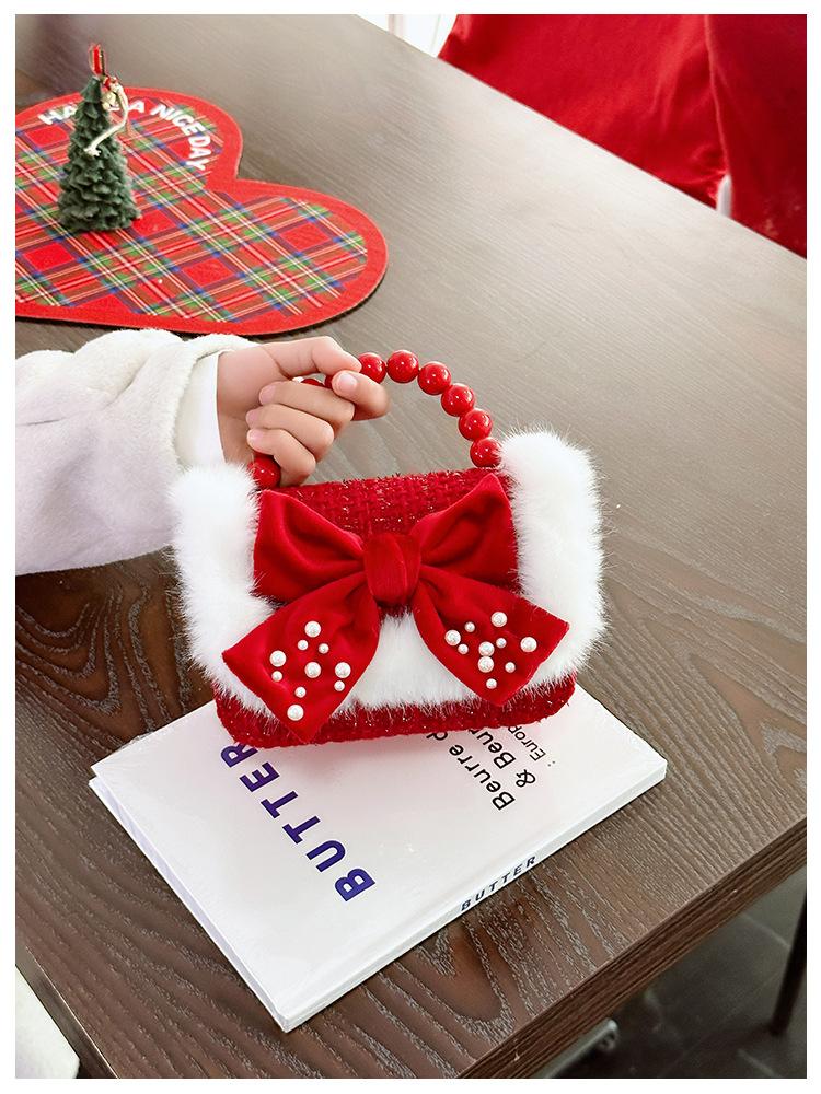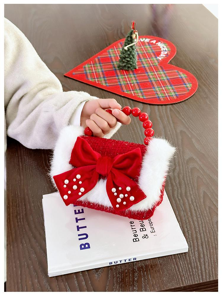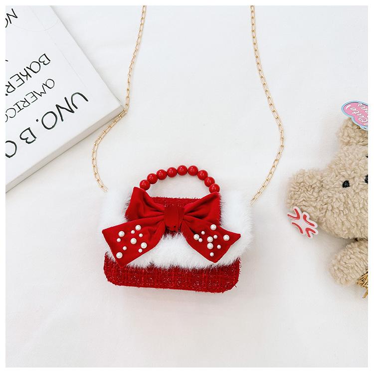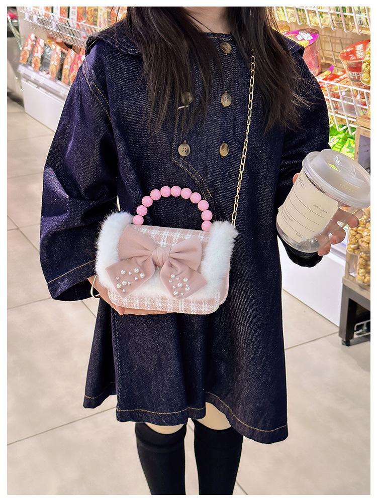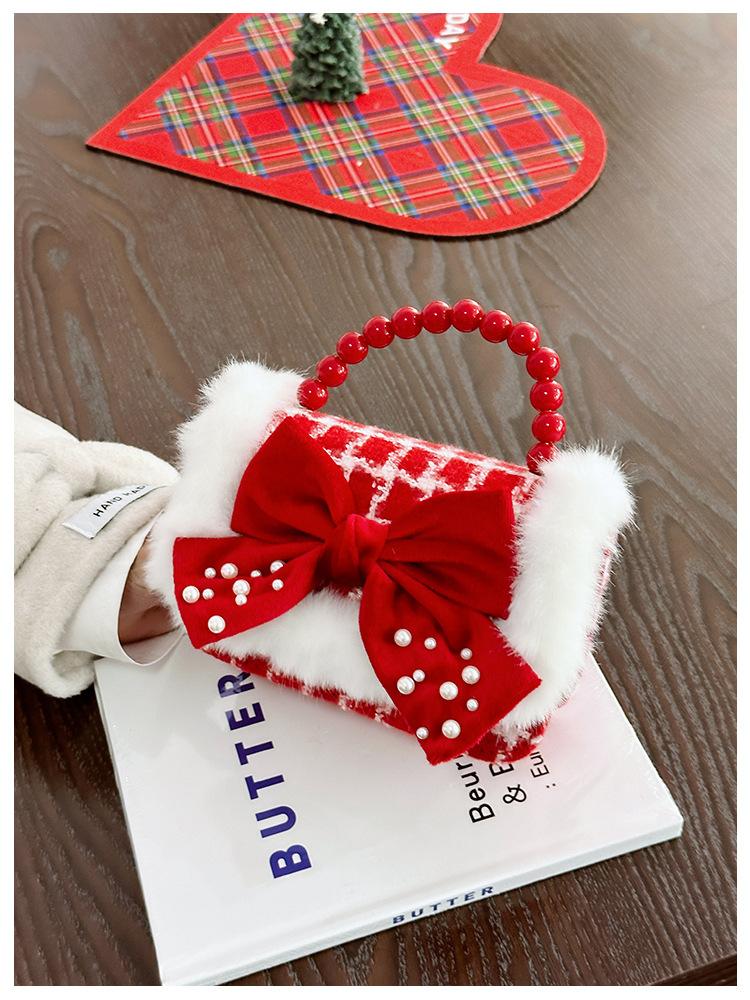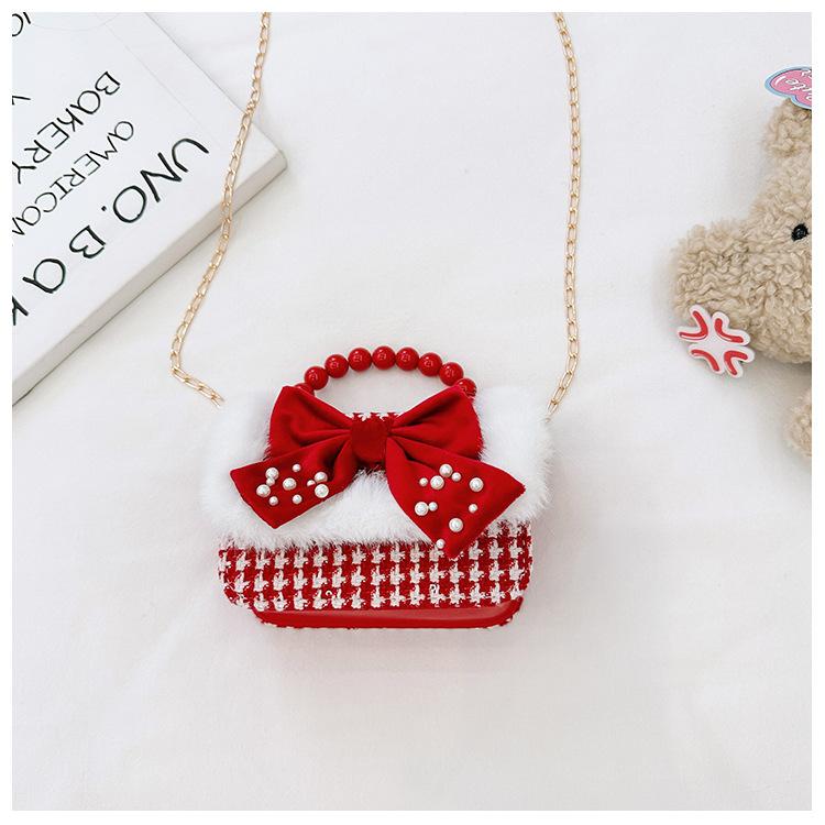 Bolso cuadrado pequeño para niños, bolso de perlas de moda para otoño e invierno, bolso de hombro de tela con lazo para niñas con festival de Año Nuevo para niños