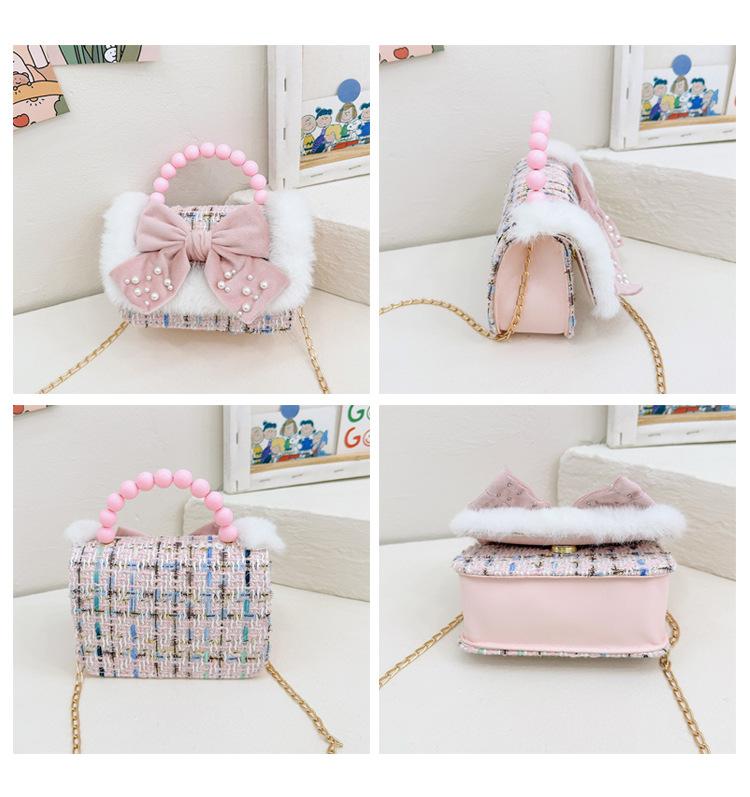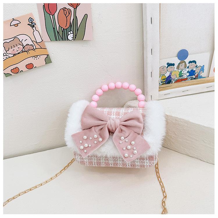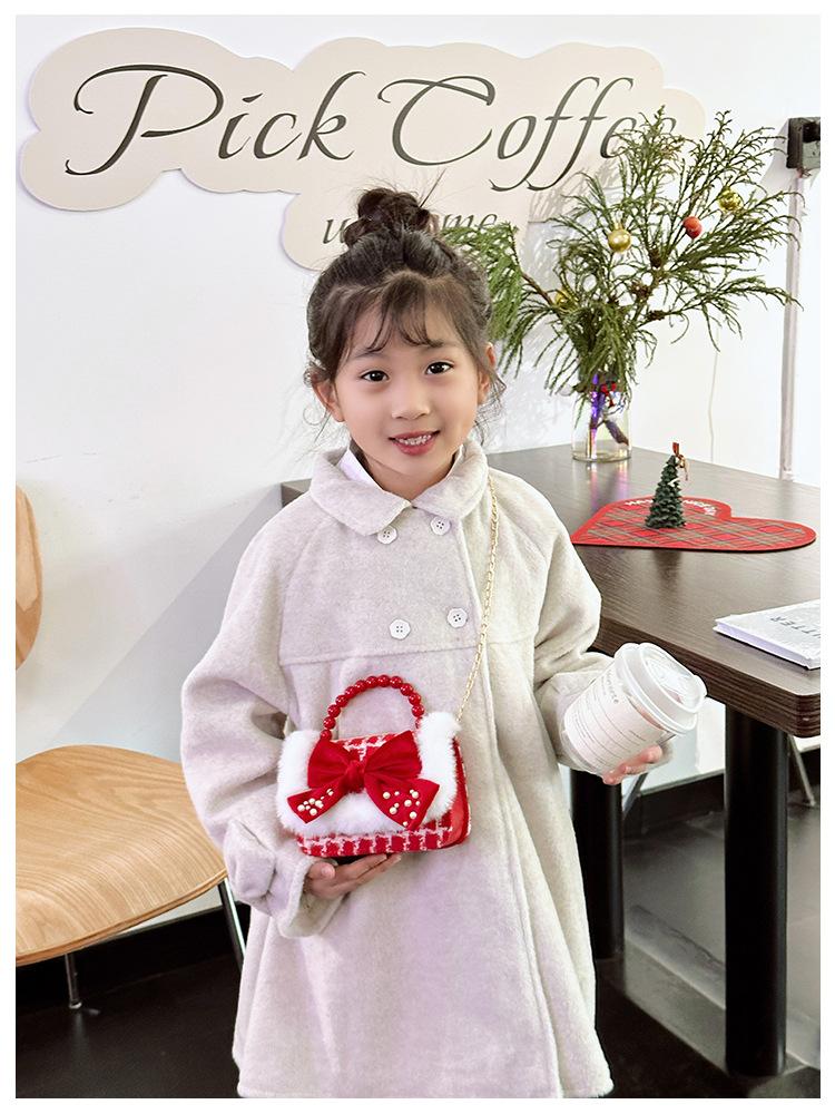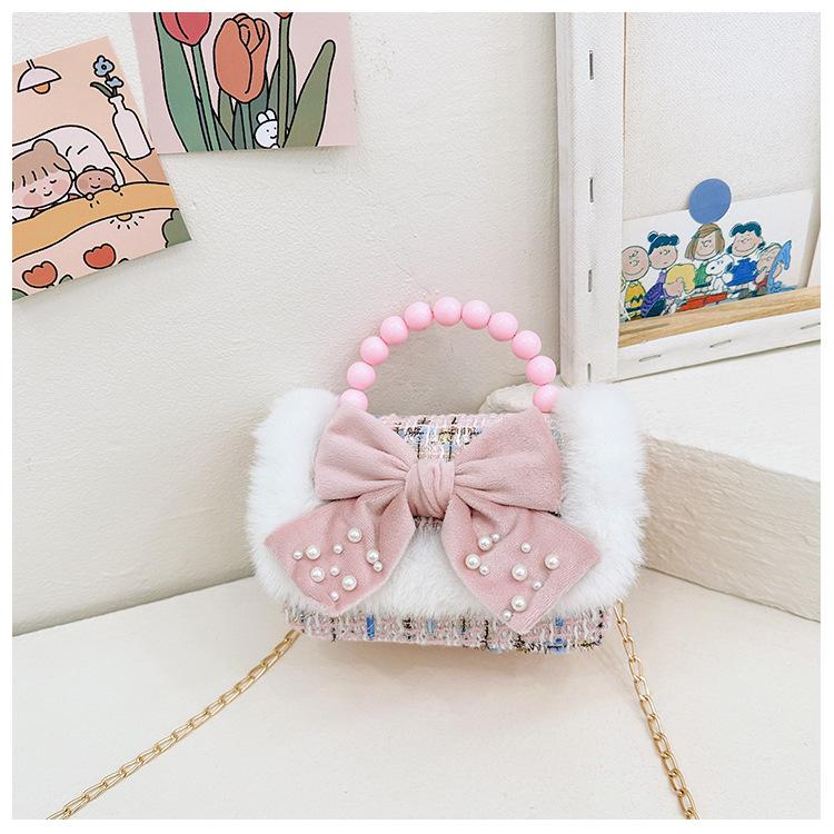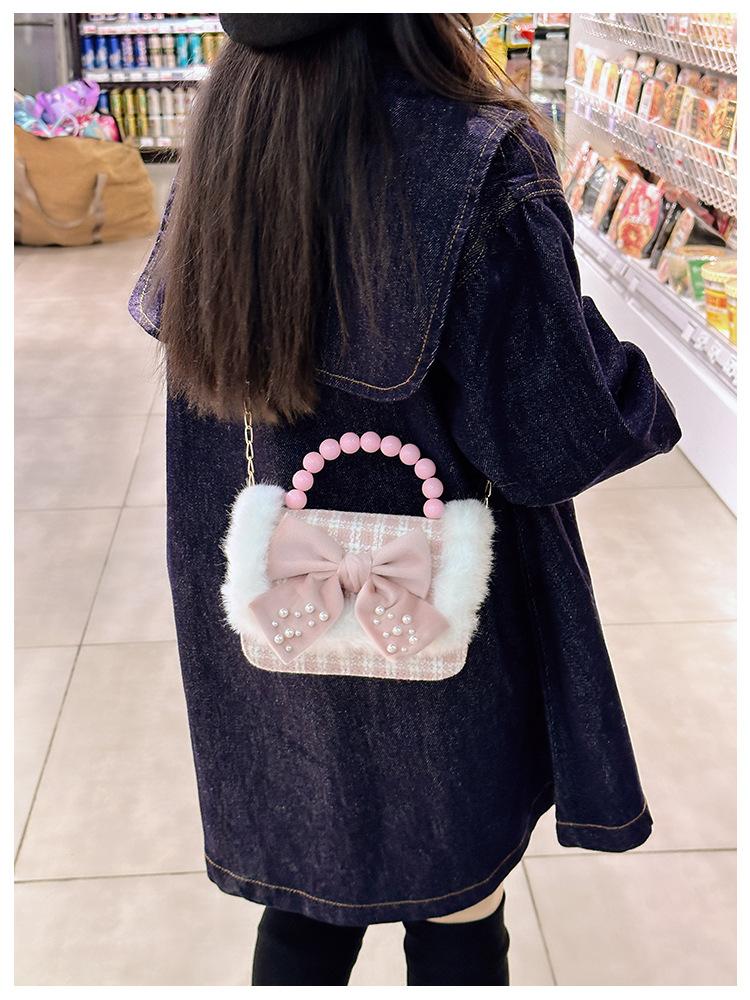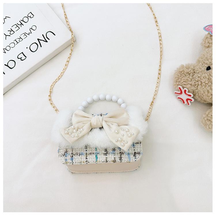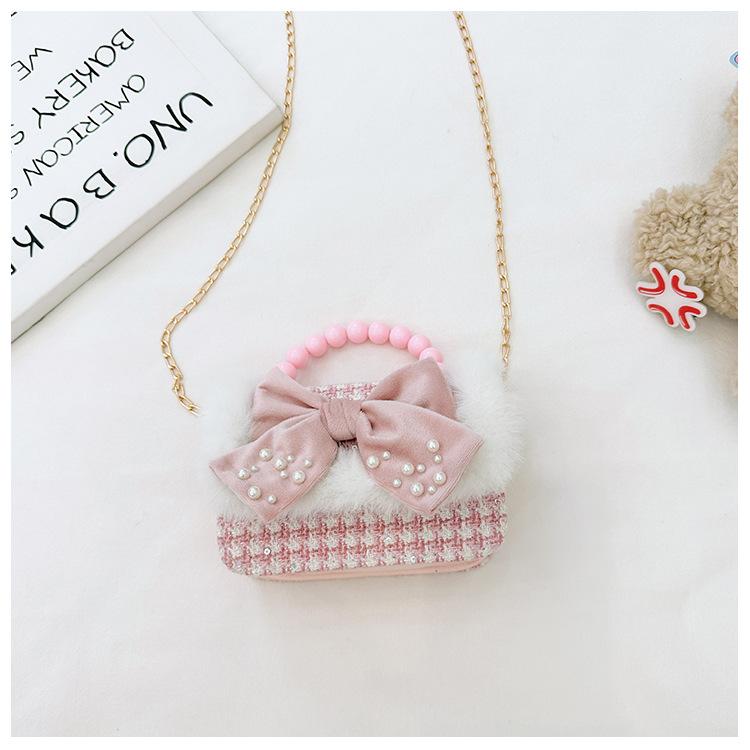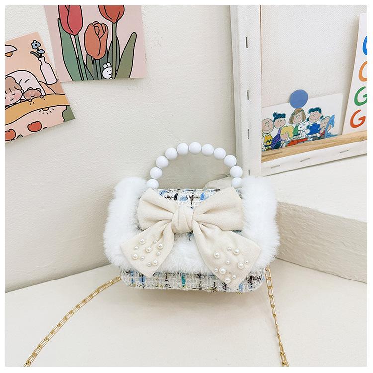 Bolso cuadrado pequeño para niños, bolso de perlas de moda para otoño e invierno, bolso de hombro de tela con lazo para niñas con festival de Año Nuevo para niños