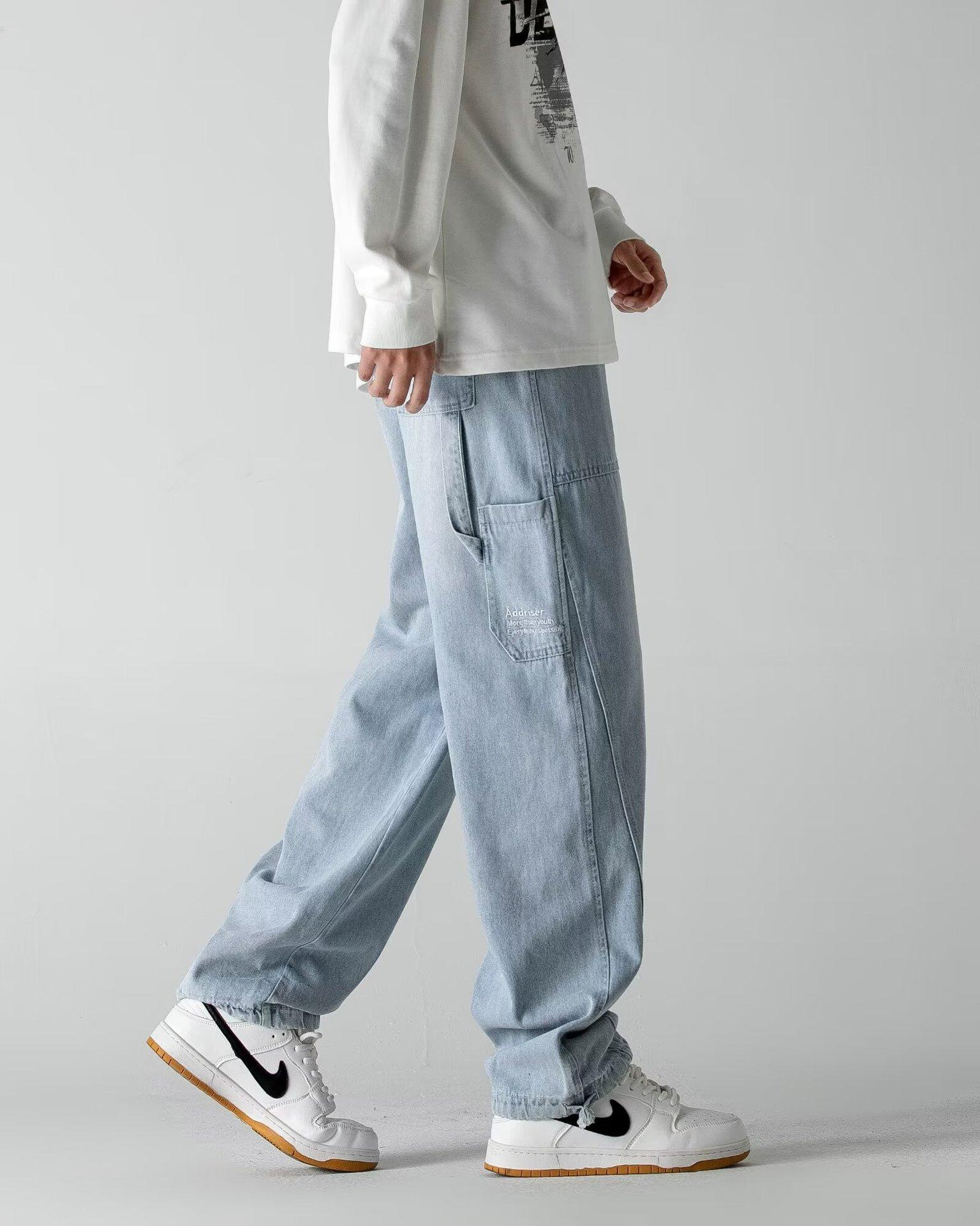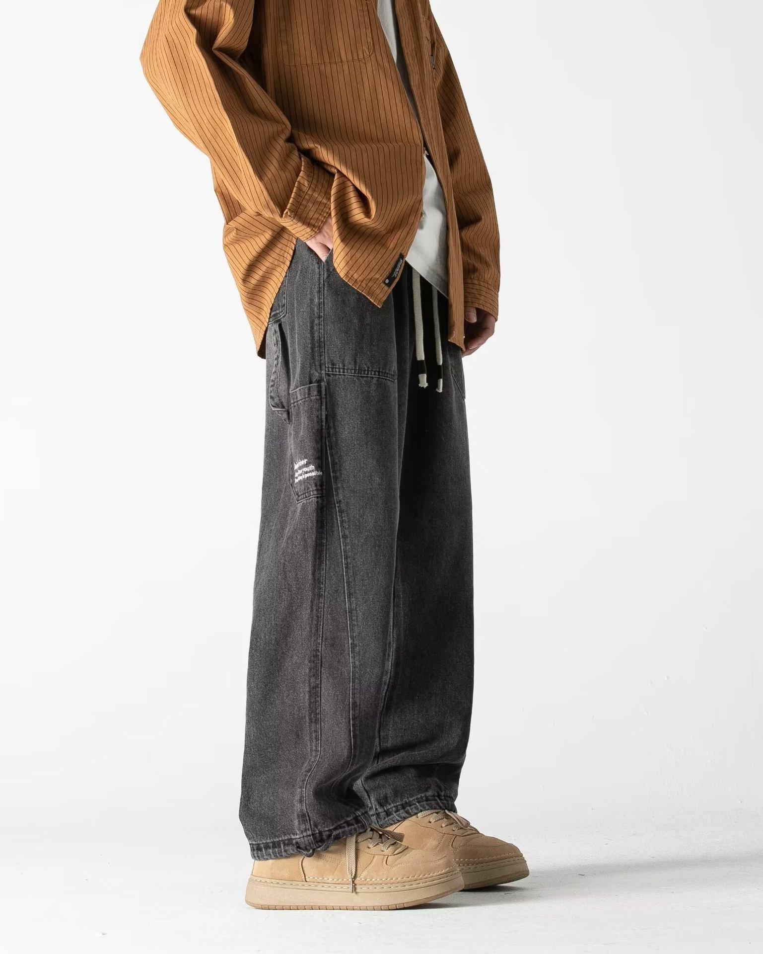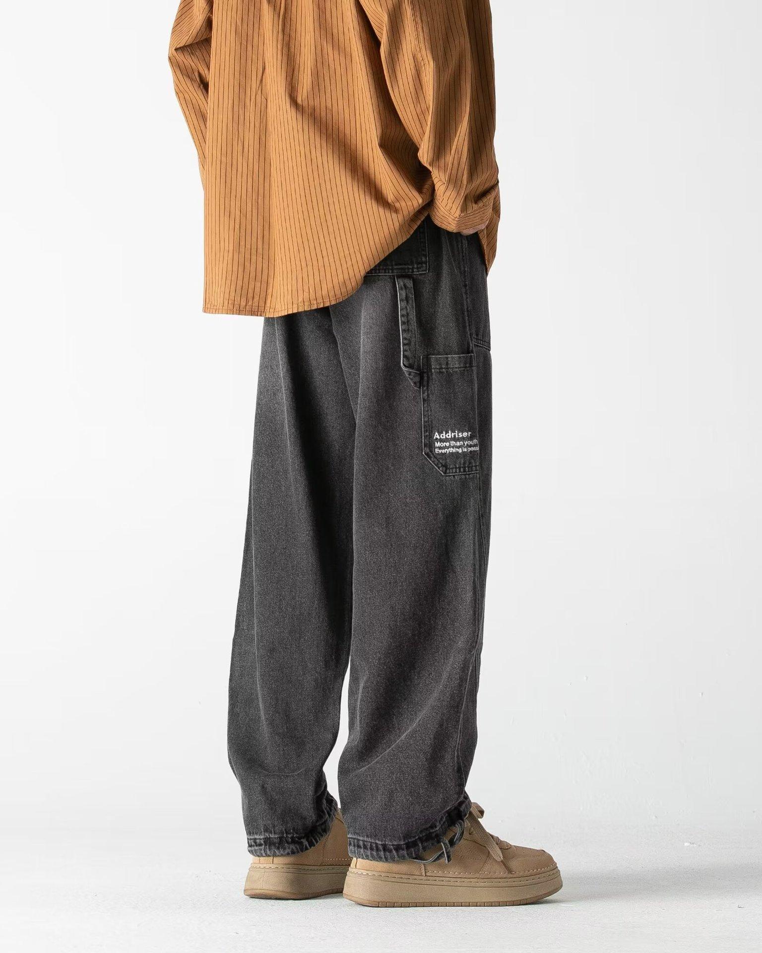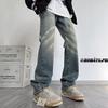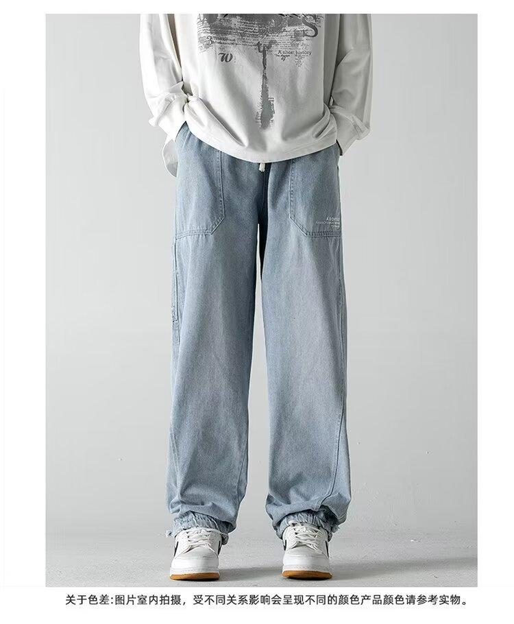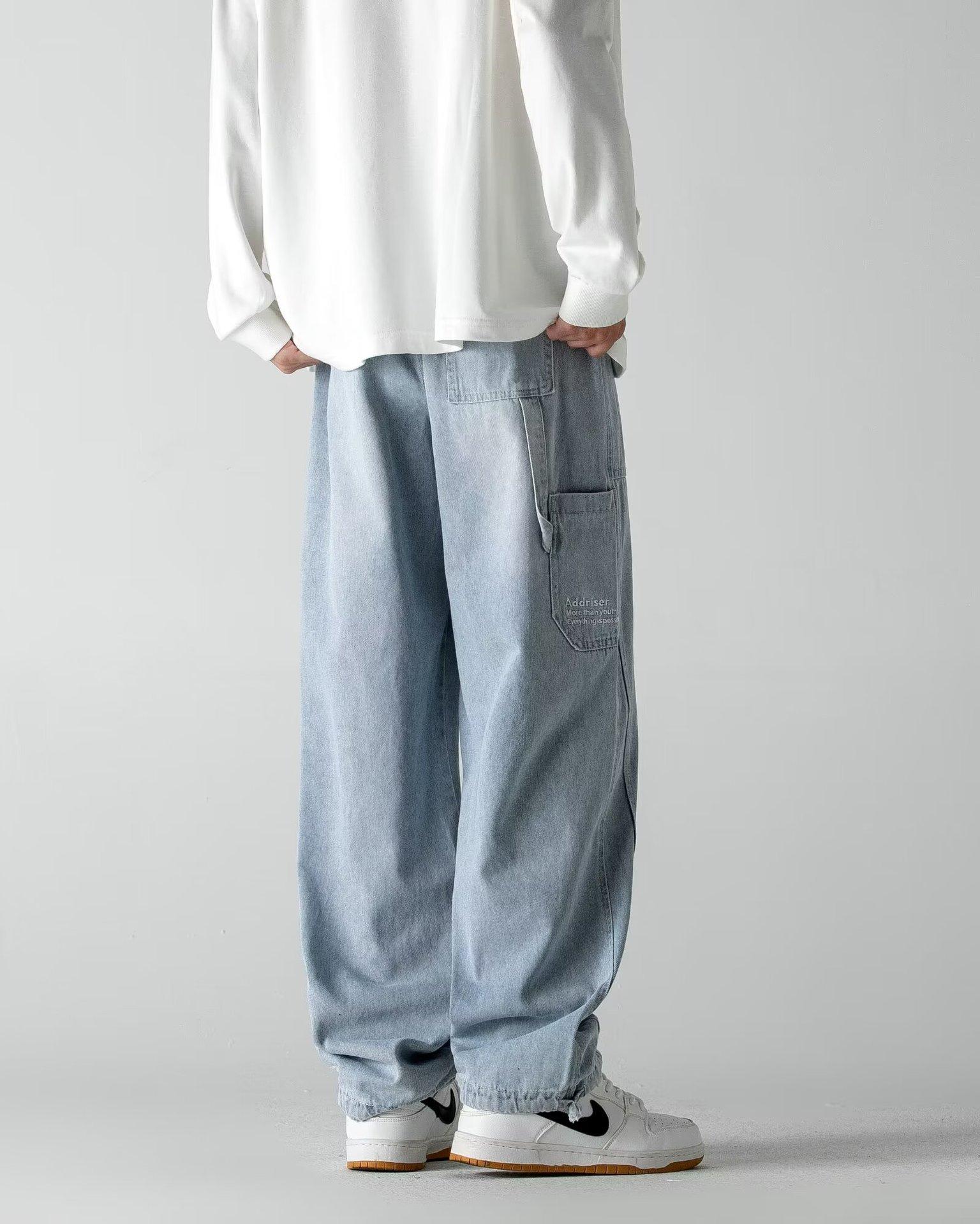 Overol de mezclilla para hombre Americano de alta calle volantes pantalones guapos marca de moda vintage lavado costuras pantalones tobilleros sueltos rectos