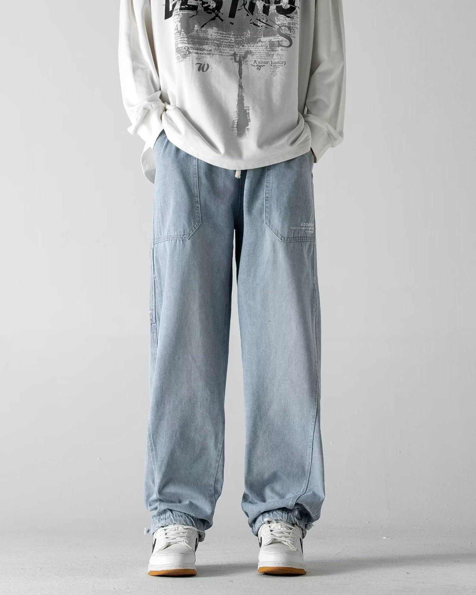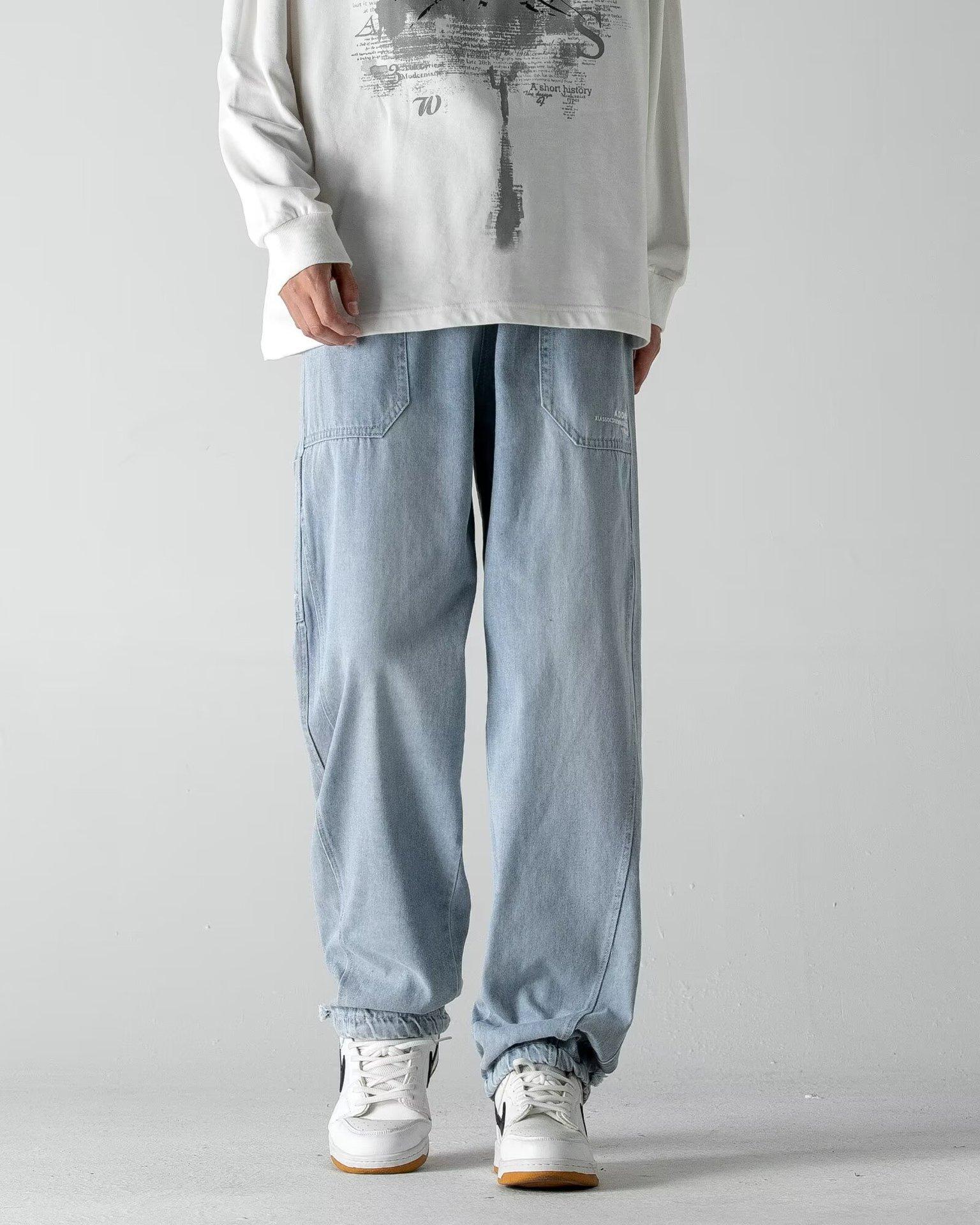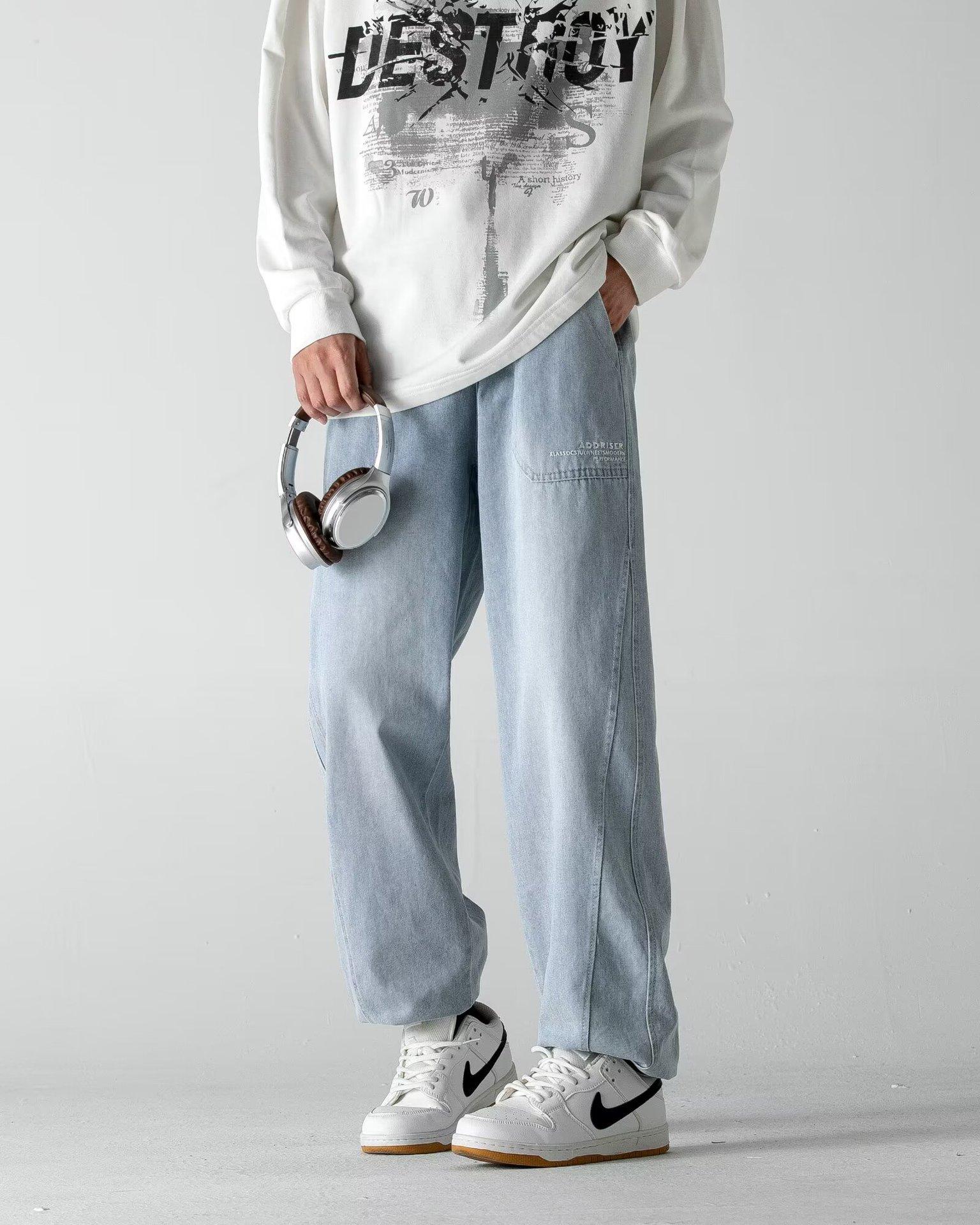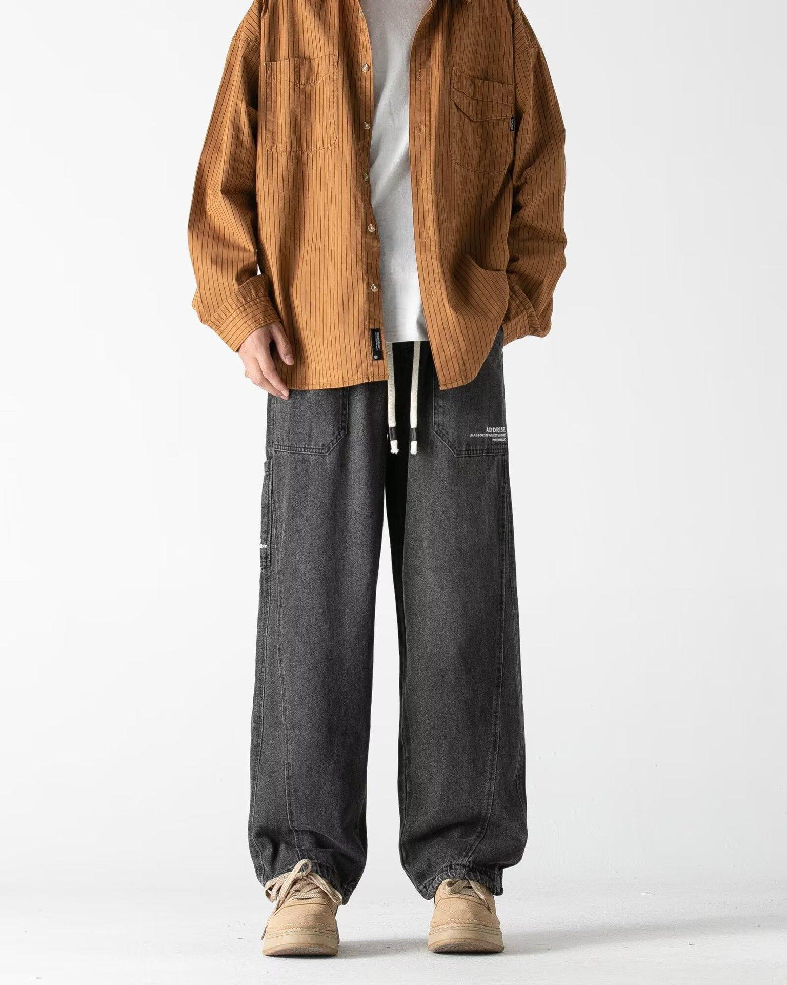Overol de mezclilla para hombre Americano de alta calle volantes pantalones guapos marca de moda vintage lavado costuras pantalones tobilleros sueltos rectos