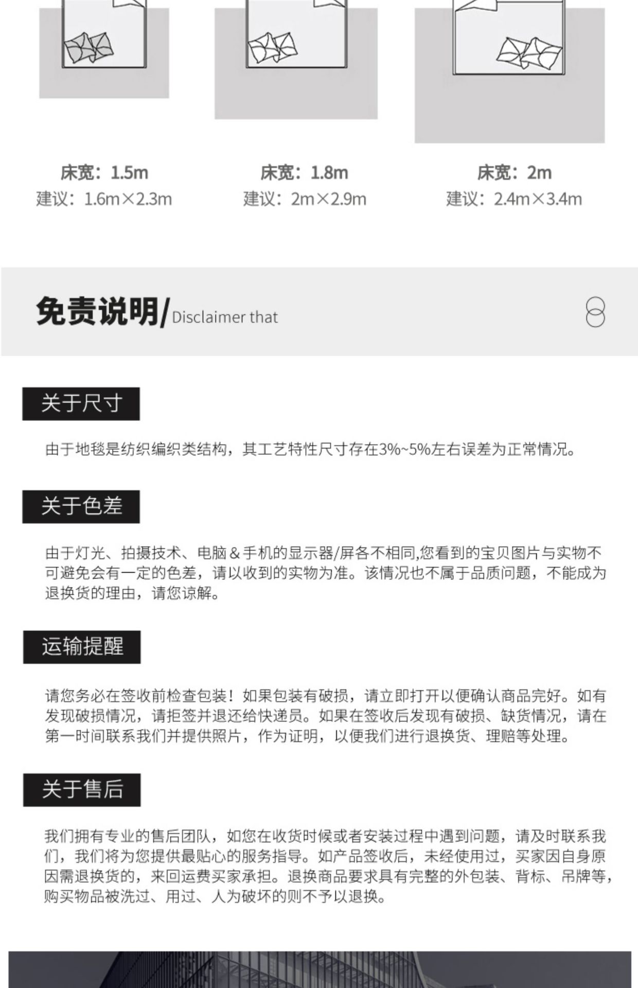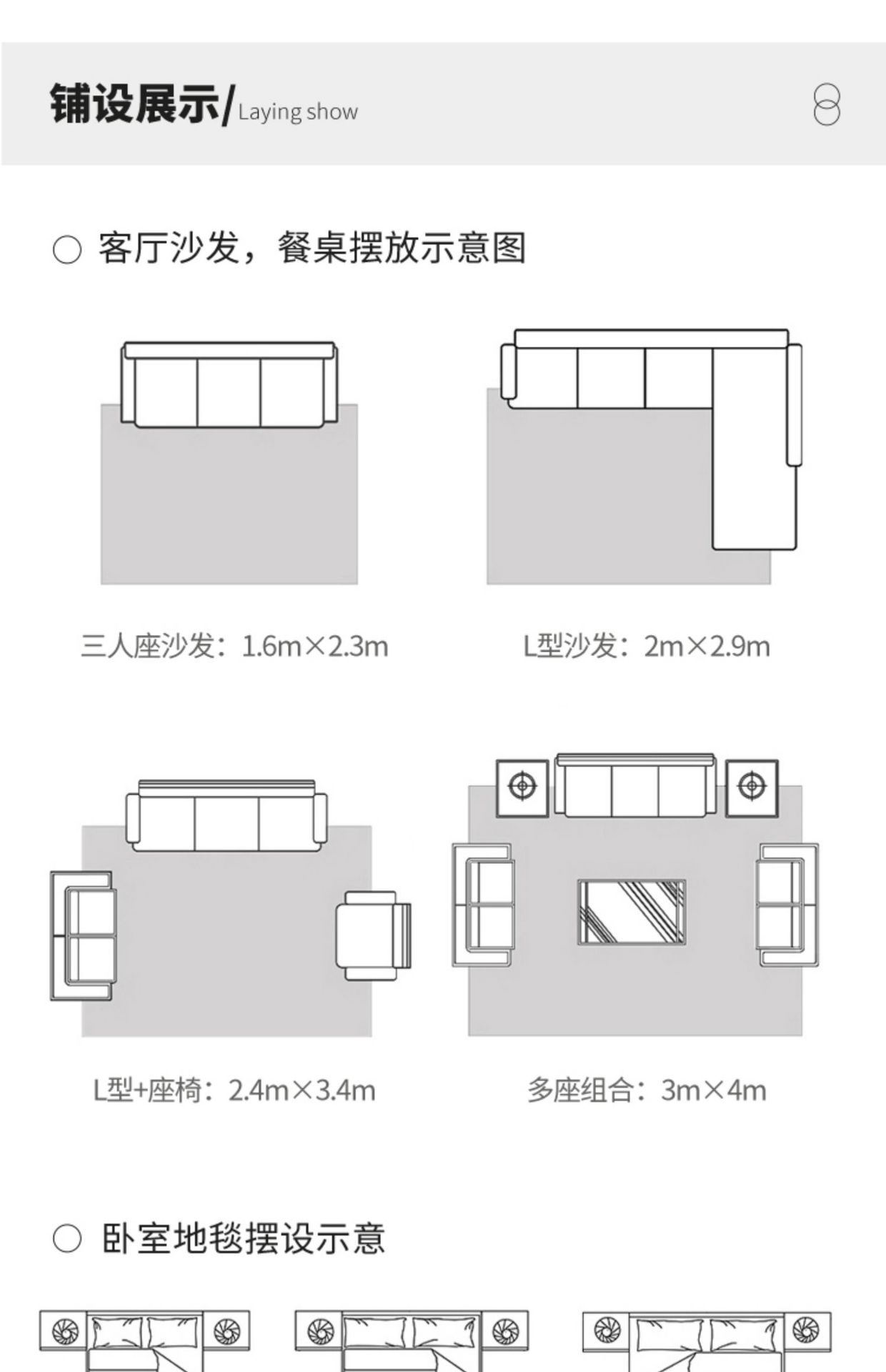 1.6x 2.3 m [for double sofa]], 2.0x 2.9 m [for three sofa]], 2.4x 3.3 m [suitable for L-shaped sofa]], 3.0x 4....