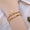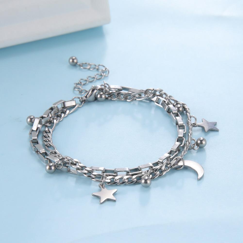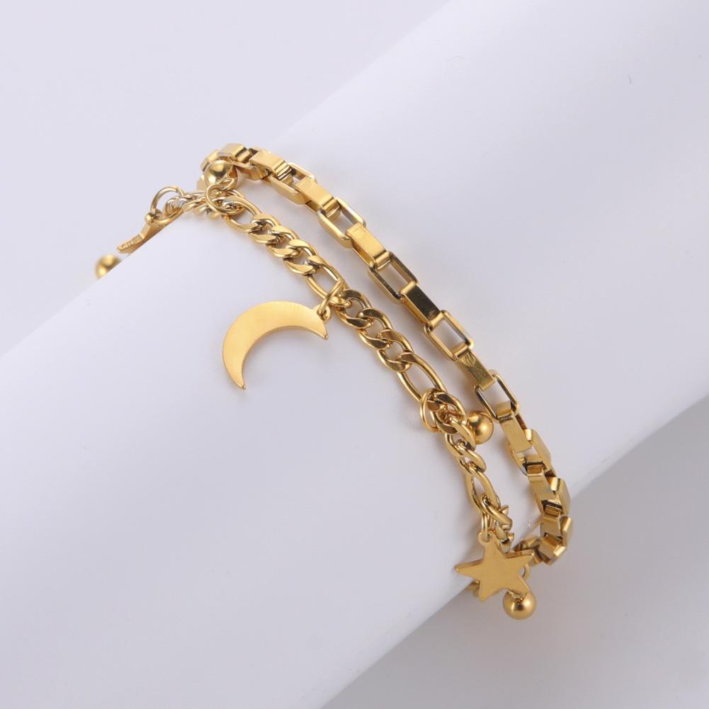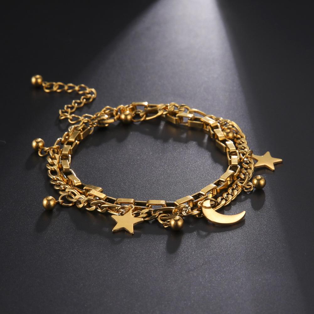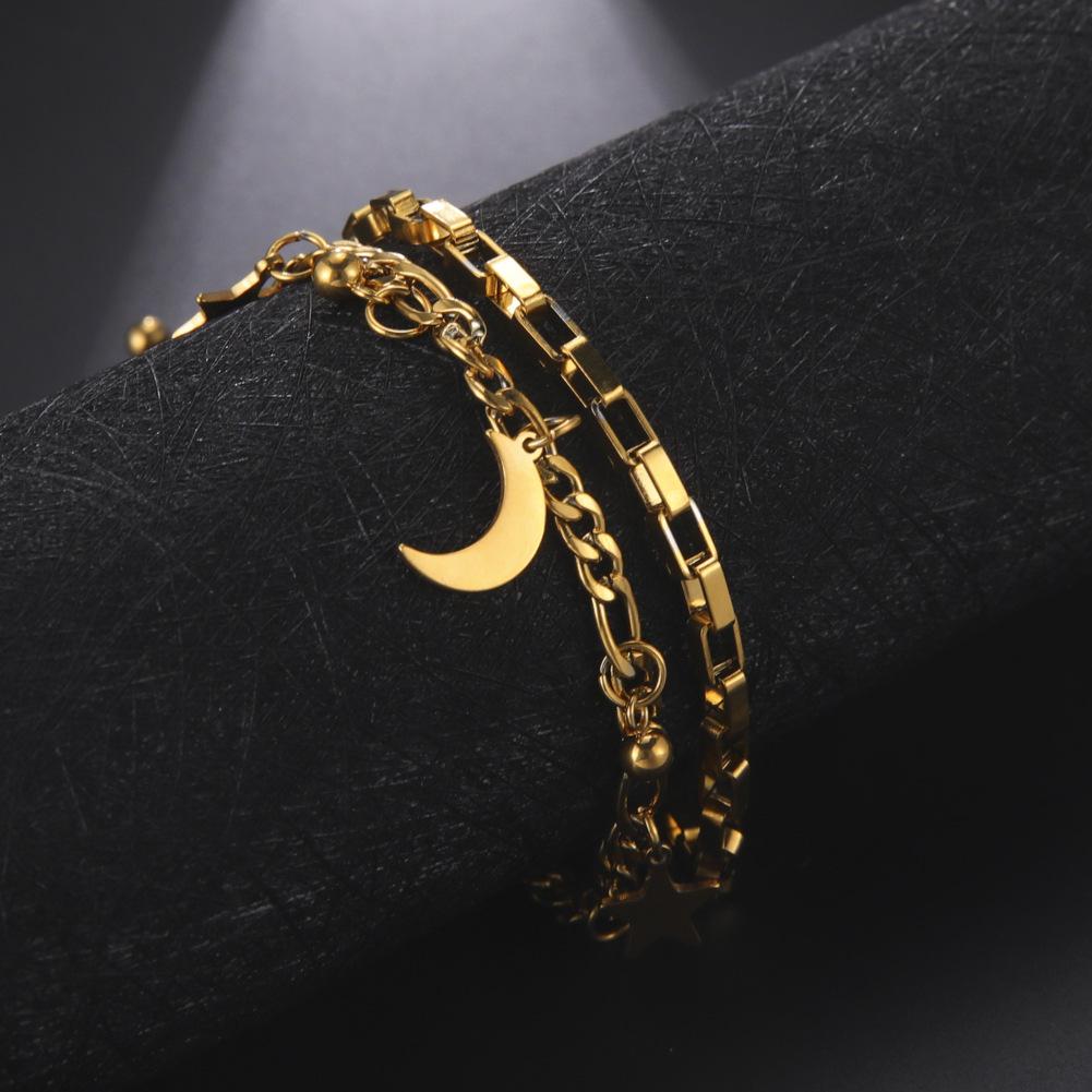 Pulsera de doble capa de moda de lujo ligero con cuentas redondas de estrella y luna, cadena Figaro de acero inoxidable