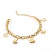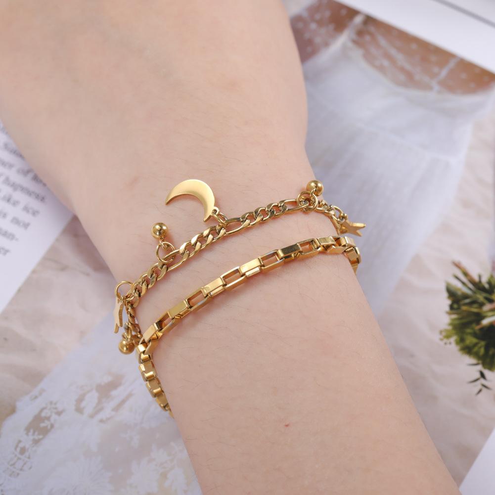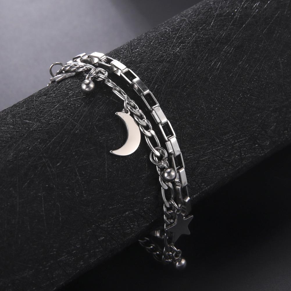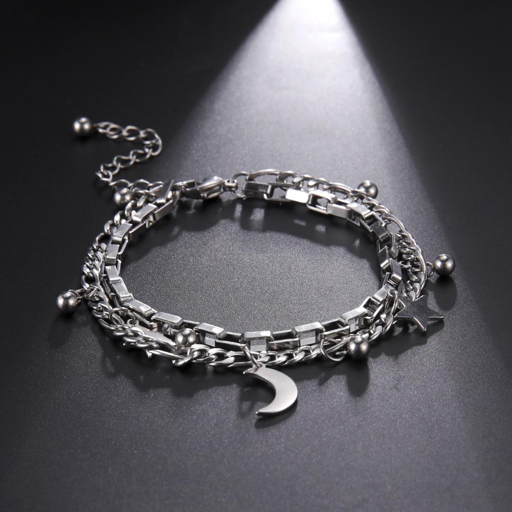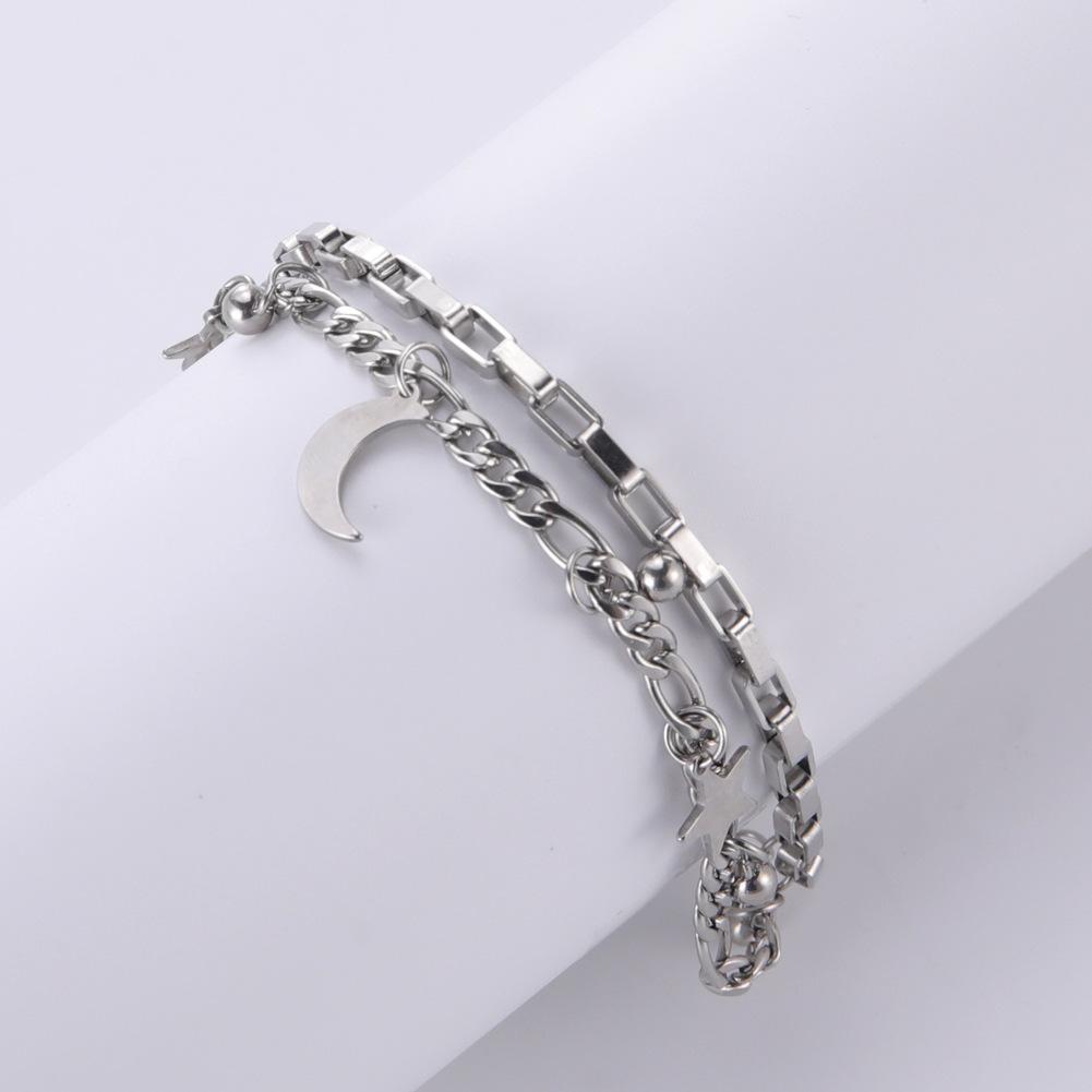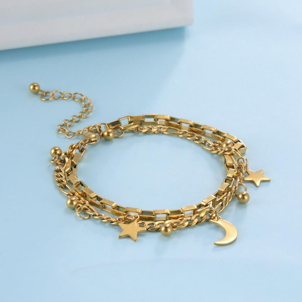 Pulsera de doble capa de moda de lujo ligero con cuentas redondas de estrella y luna, cadena Figaro de acero inoxidable