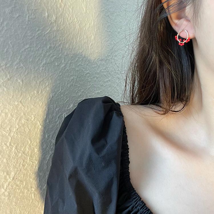 Pendientes de plata S925 estilo coreano con pequeñas cuentas de arroz y bayas rojas, hechos a mano, redondos y sinuosos, exquisitos pendientes de niña para mujer