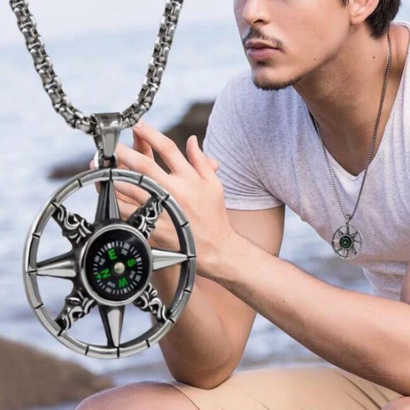 Collar con colgante de brújula retro transfronterizo europeo y americano de acero de titanio para hombre y mujer, cadena larga de lana de estilo hip hop personalizada a juego.