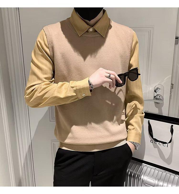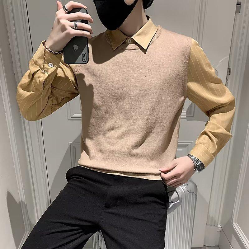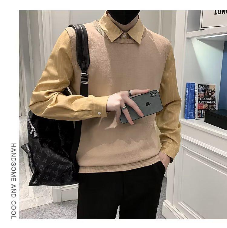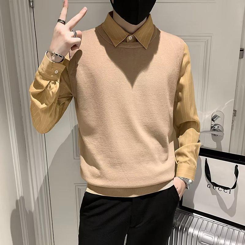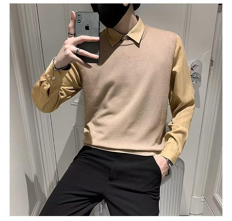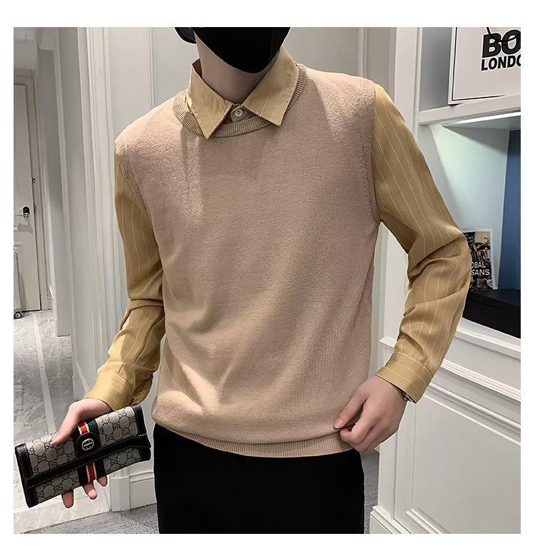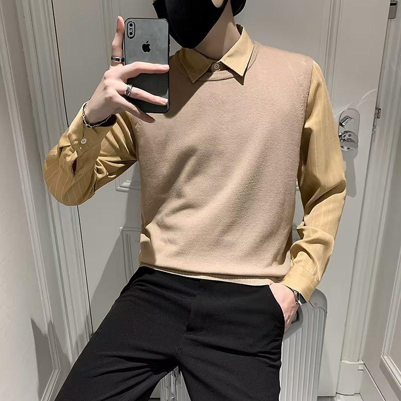 Compra Suéter de dos piezas falso para hombre, otoño e invierno, ajustado, moderno, nuevo, a rayas, cuello de camisa, camisa de punto, top largo al por mayor en Joom.pro