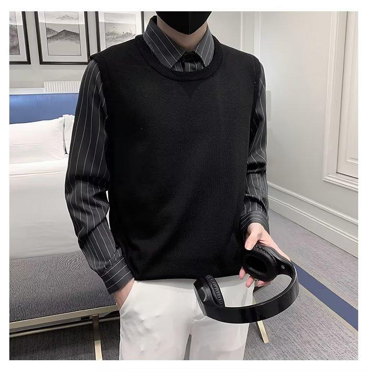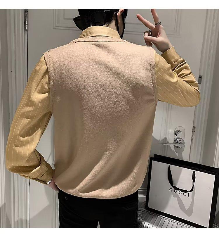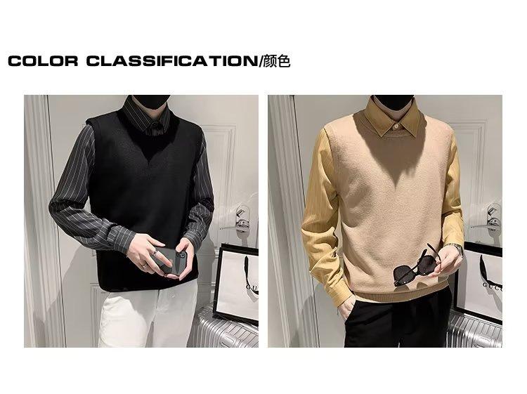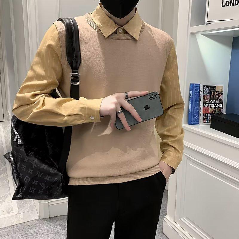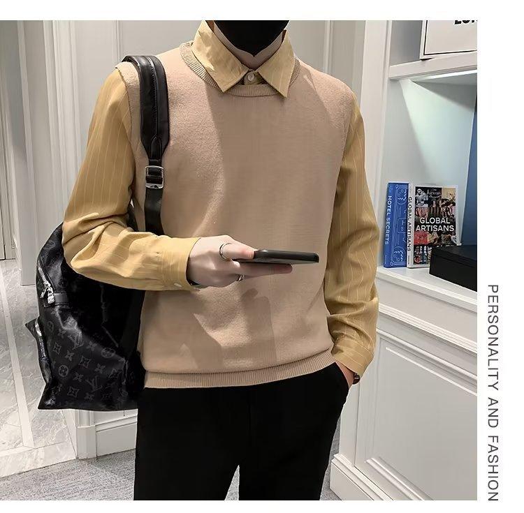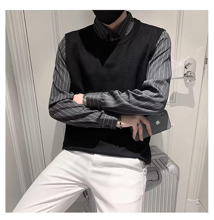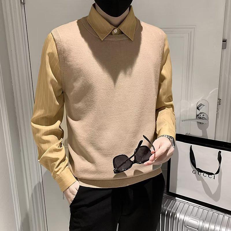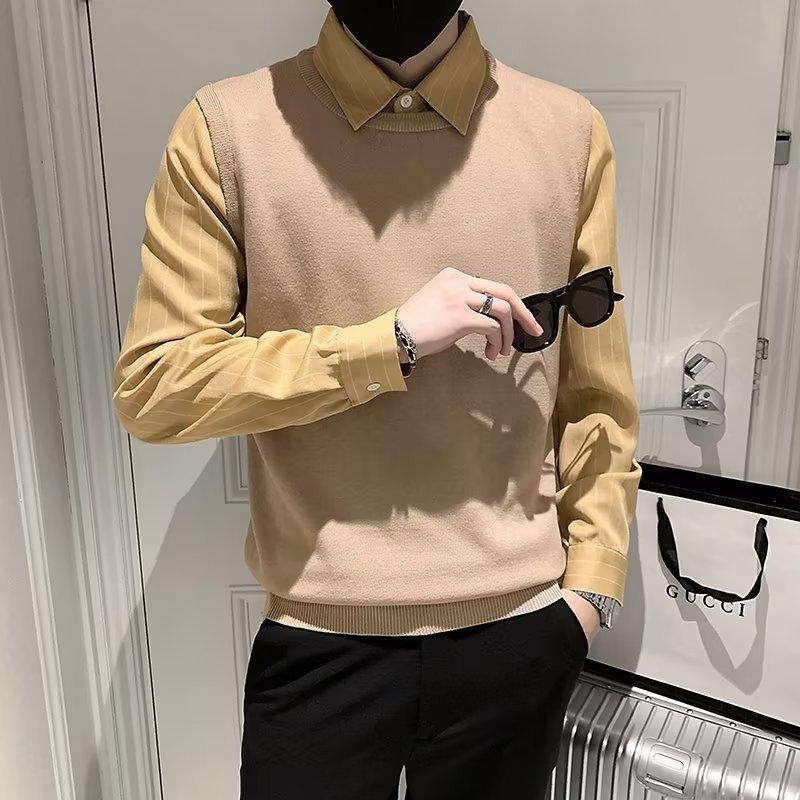 Compra Suéter de dos piezas falso para hombre, otoño e invierno, ajustado, moderno, nuevo, a rayas, cuello de camisa, camisa de punto, top largo al por mayor en Joom.pro