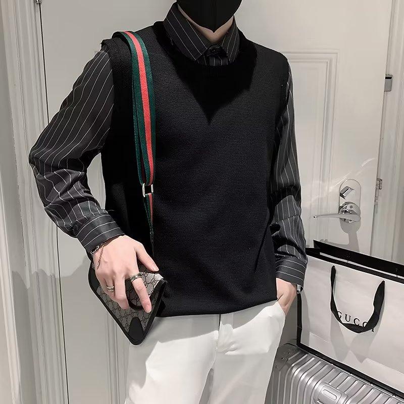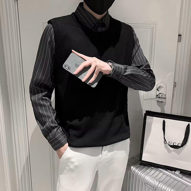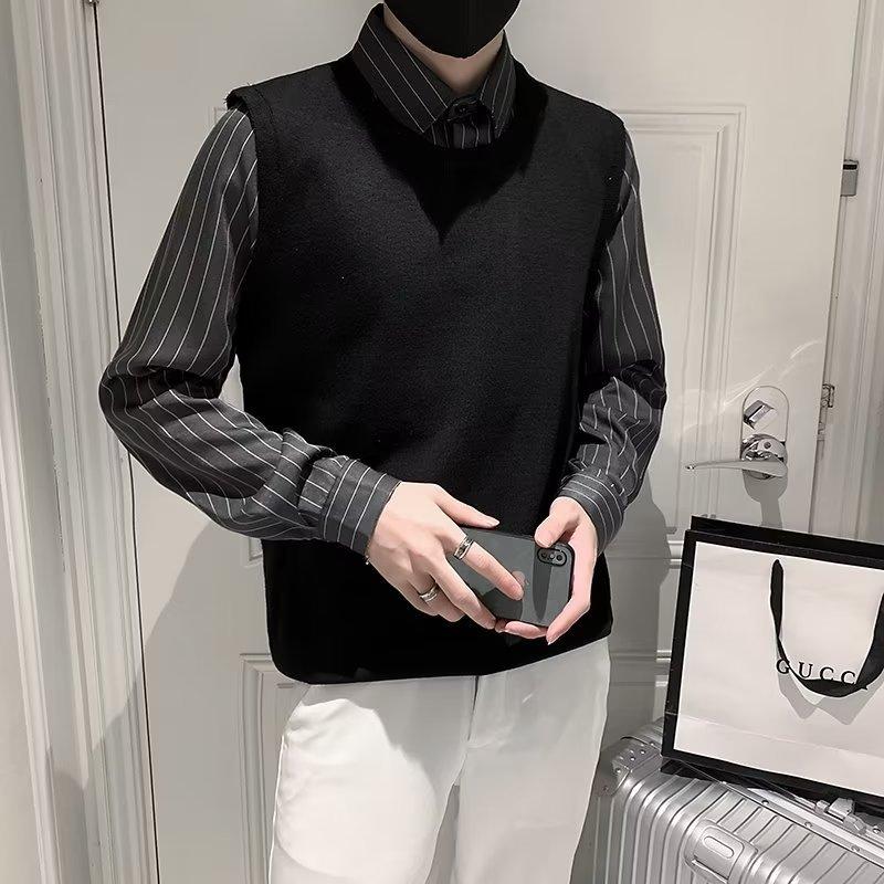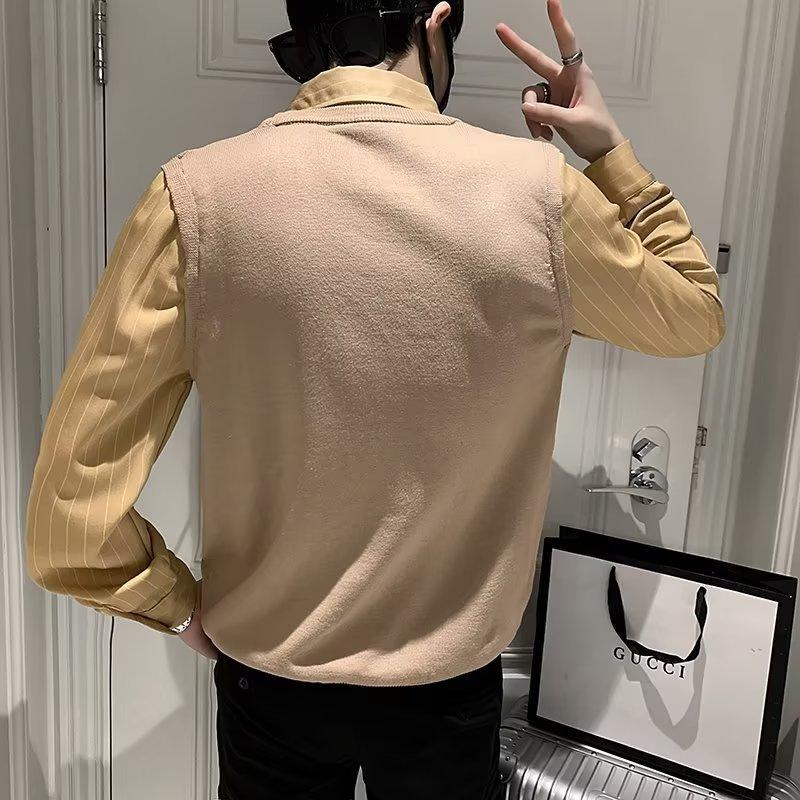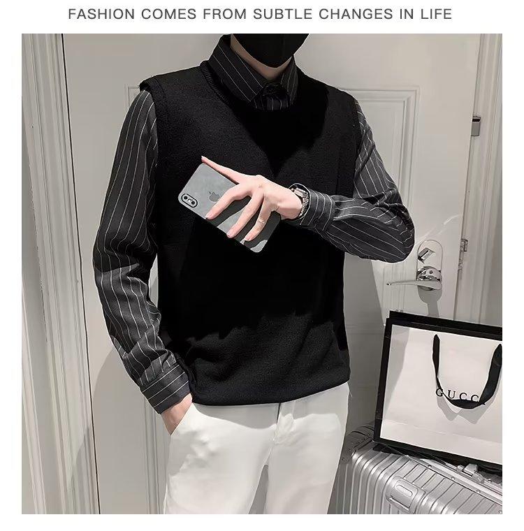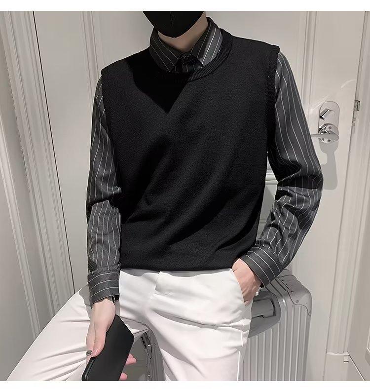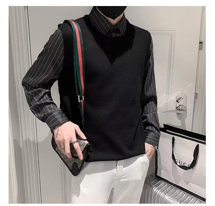 Compra Suéter de dos piezas falso para hombre, otoño e invierno, ajustado, moderno, nuevo, a rayas, cuello de camisa, camisa de punto, top largo al por mayor en Joom.pro