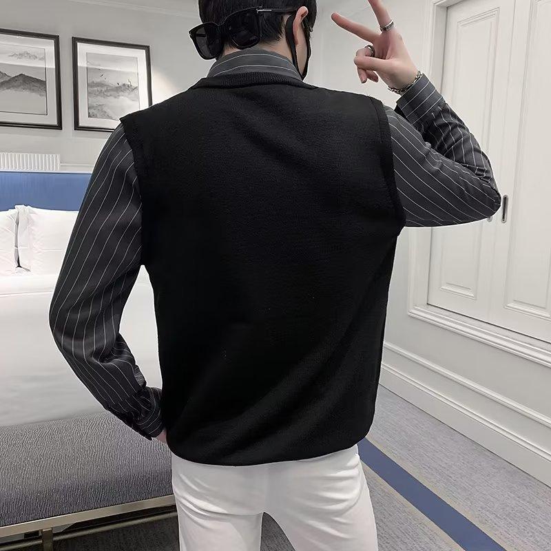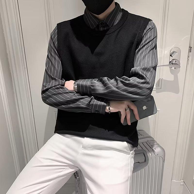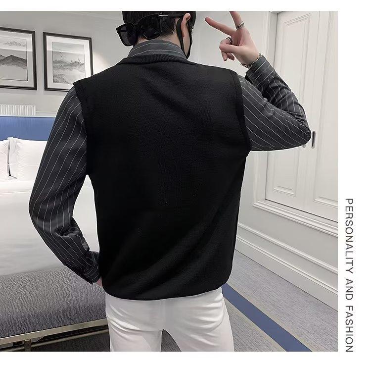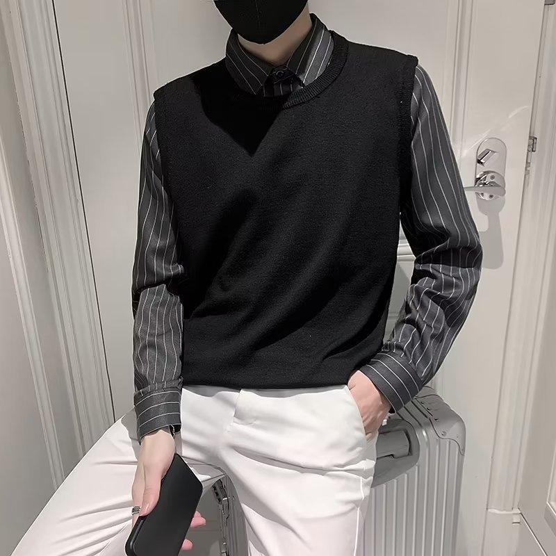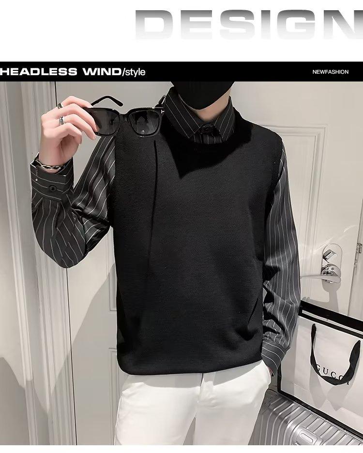 Suéter de dos piezas falso para hombre, otoño e invierno, ajustado, moderno, nuevo, a rayas, cuello de camisa, camisa de punto, top largo