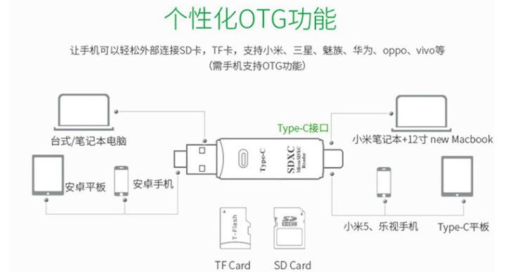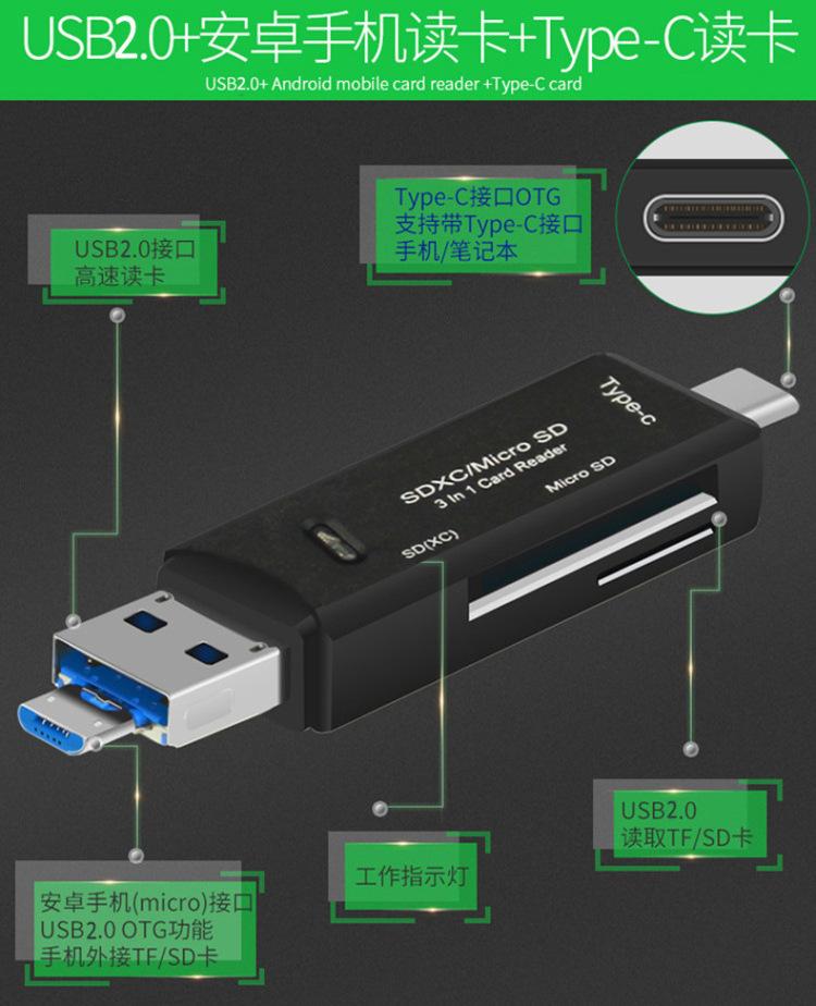 Función del producto: Puede proporcionar lectura de tarjetas de almacenamiento SD y TF y transmisión de datos para interfaz Tipo-c/interfaz MicroUSB/interfaz USB2.0