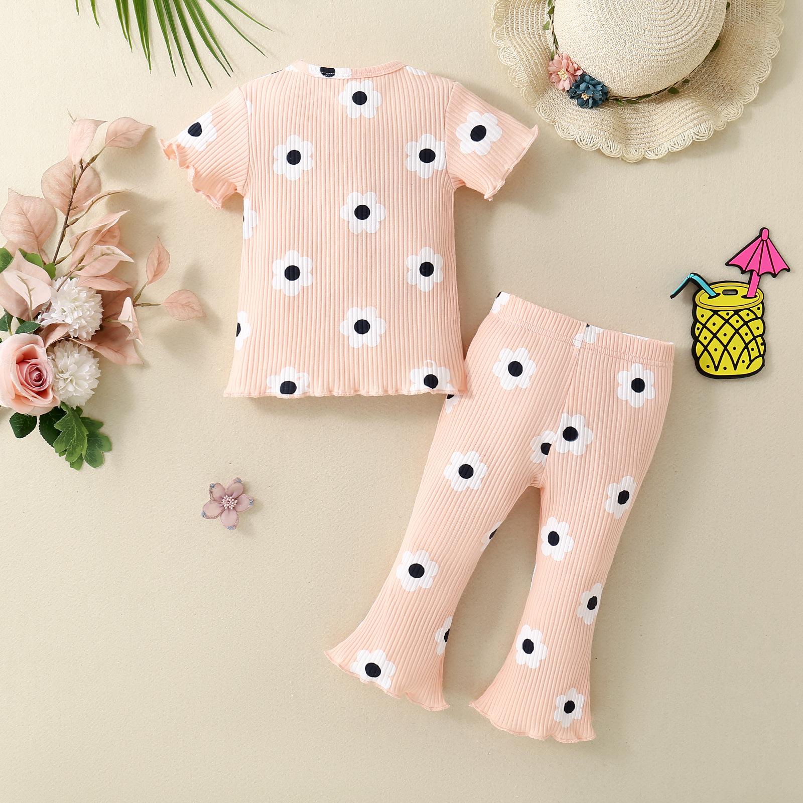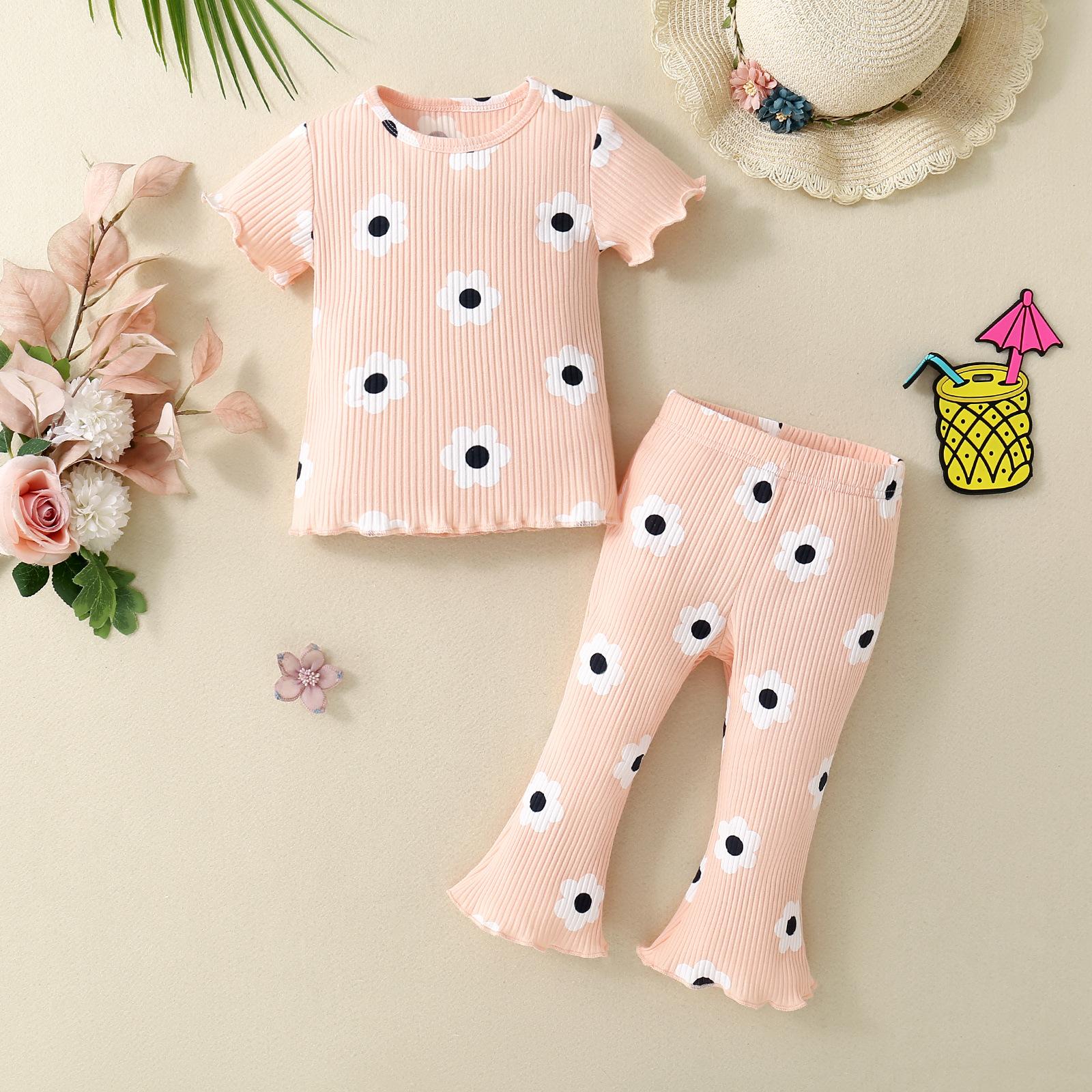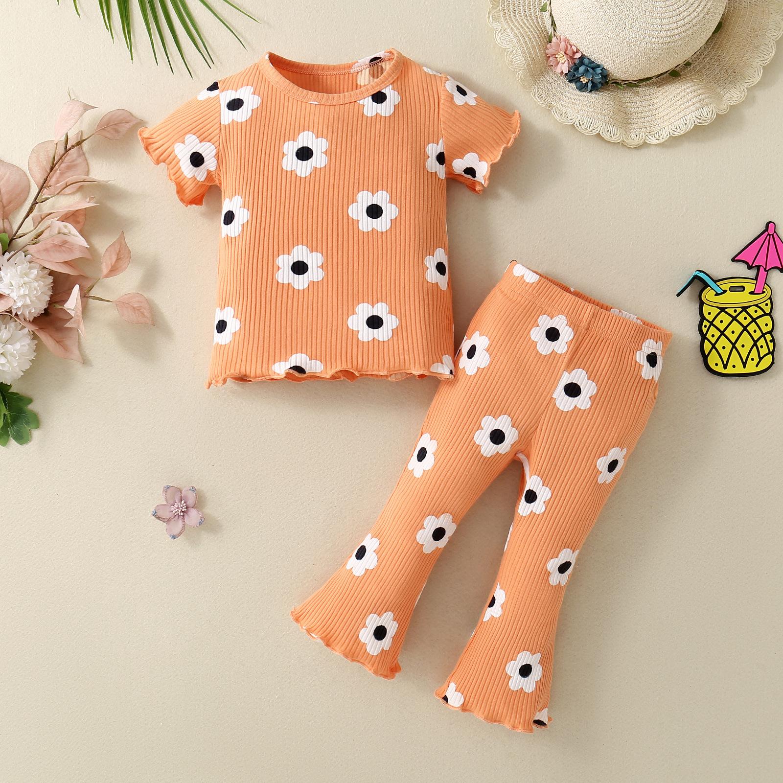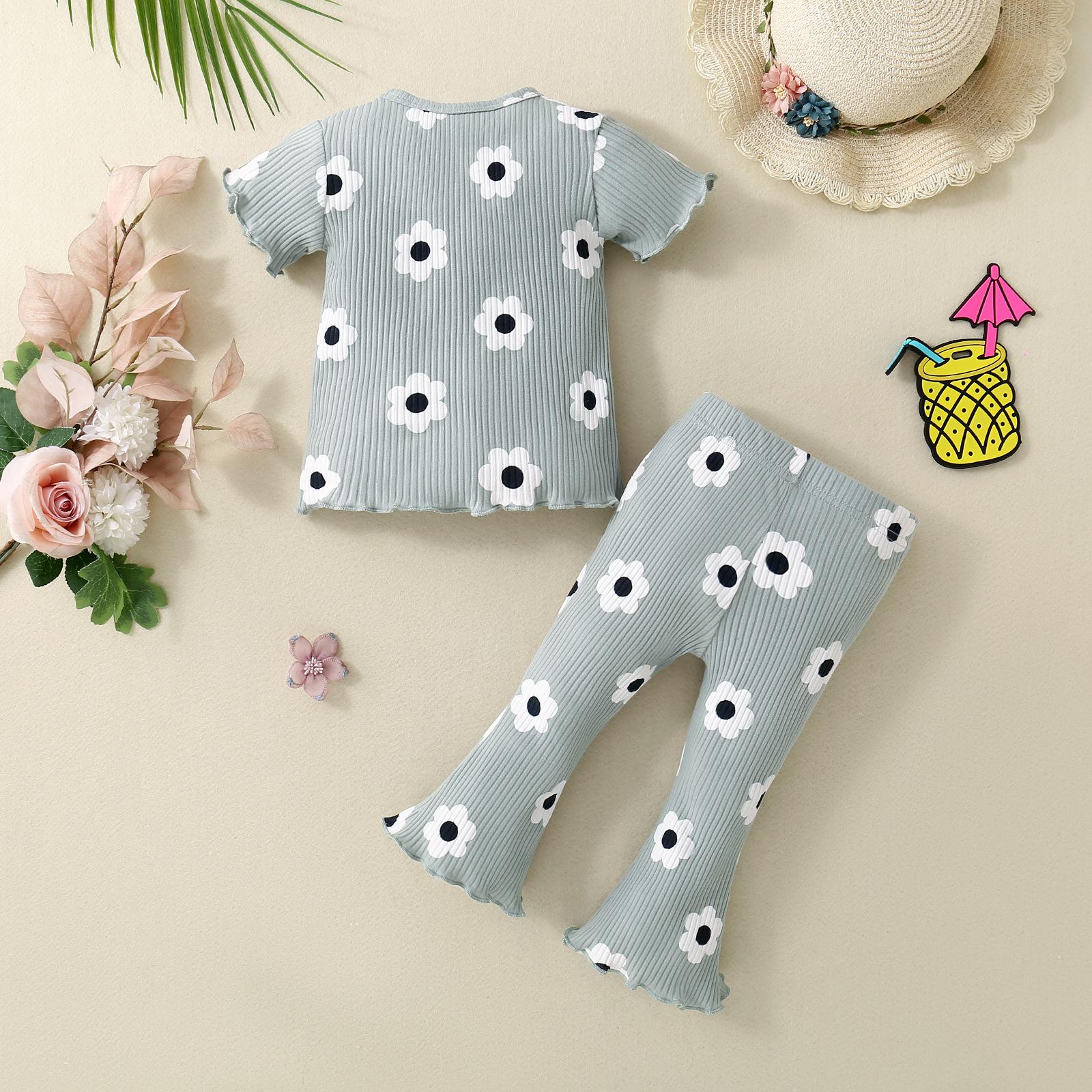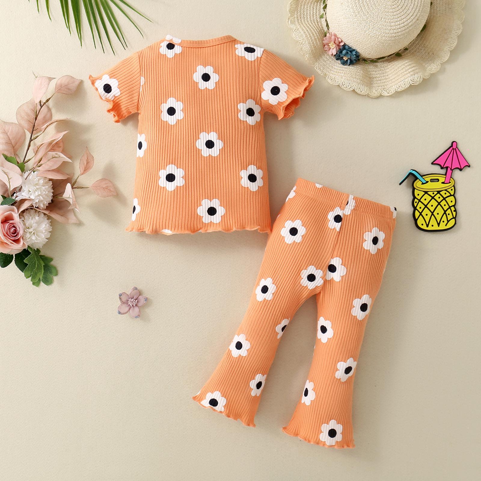 Transfronterizo Nuevo Verano Niña Flor Pequeña Hoyo Manga Corta Trompeta Traje de Pantalón Verano Ropa de Casa