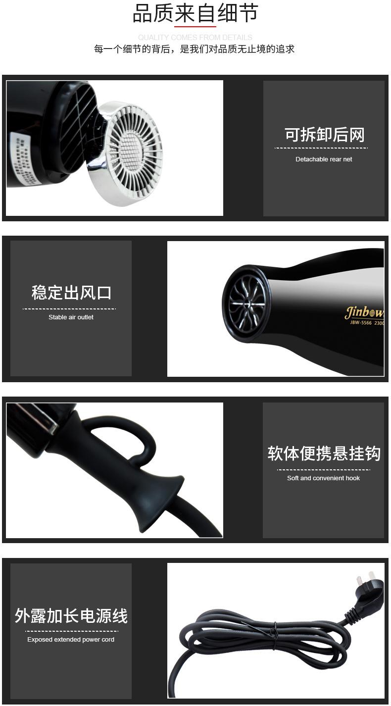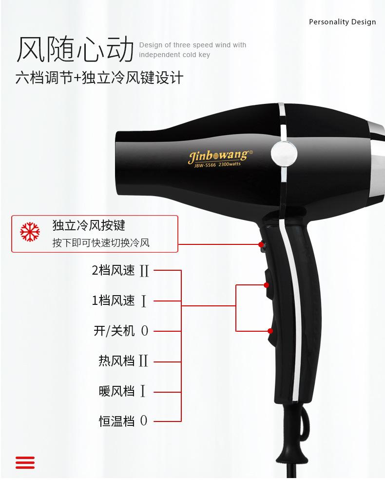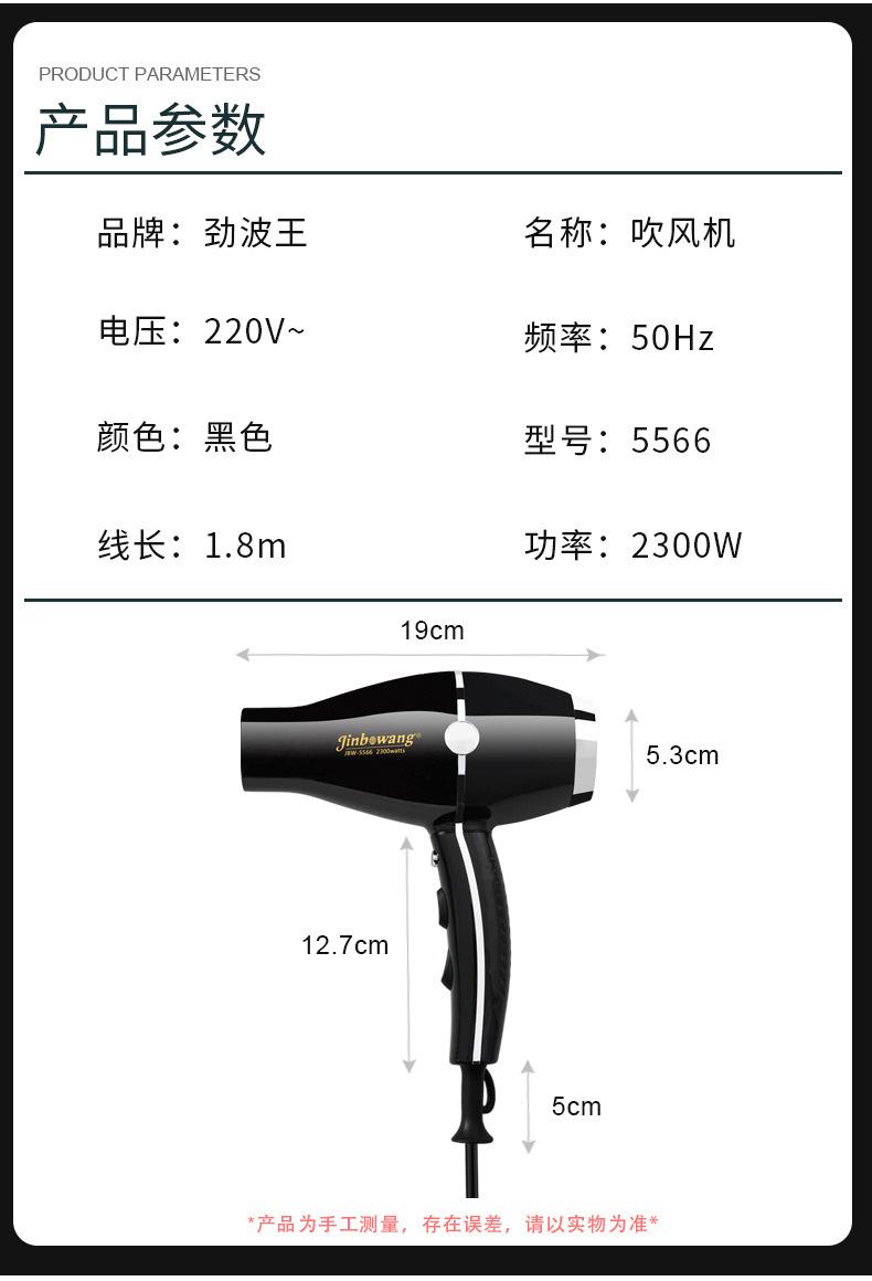 [Nombre]: Secador de pelo Jinbowang 5566 [Cantidad de embalaje]: 24 piezas [Peso bruto/neto individual]: 0.8kg (embalaje en caja de color)/0.620kg [Tamaño del embalaje]: 24*28*10cm