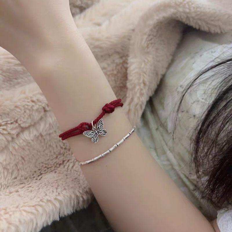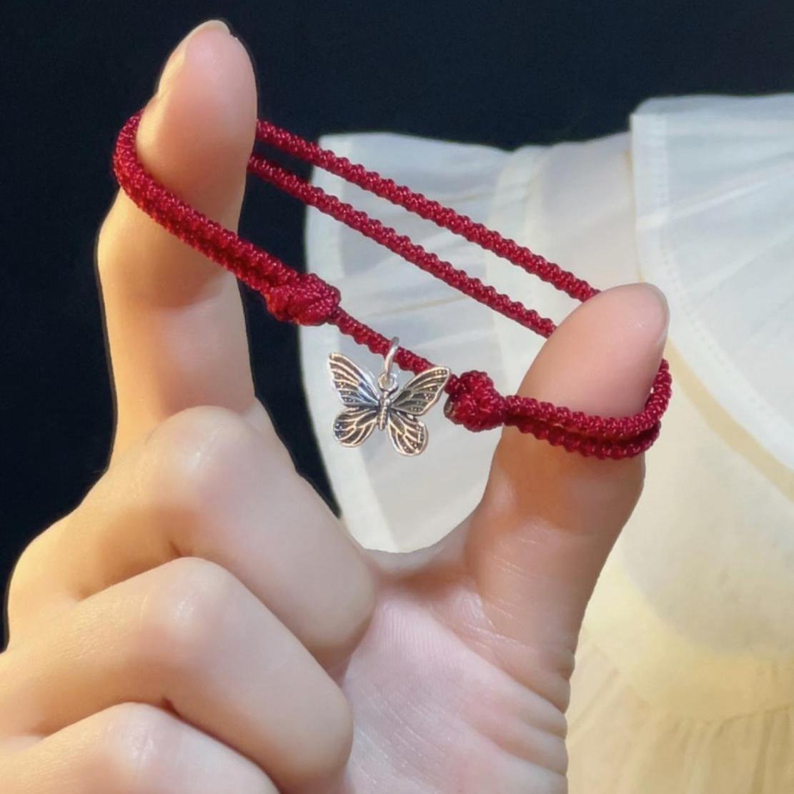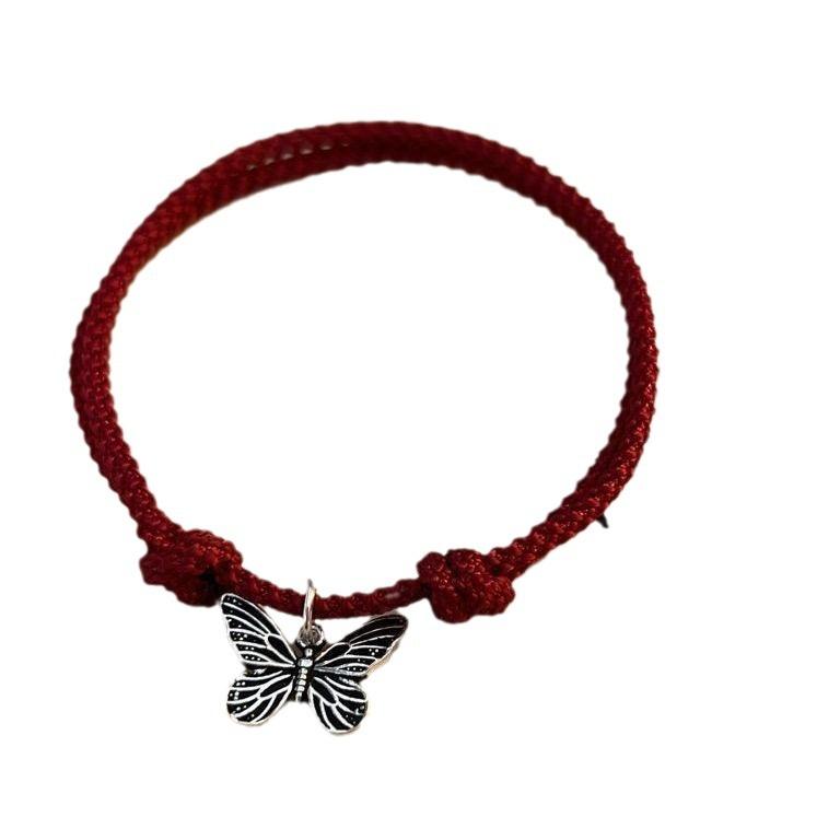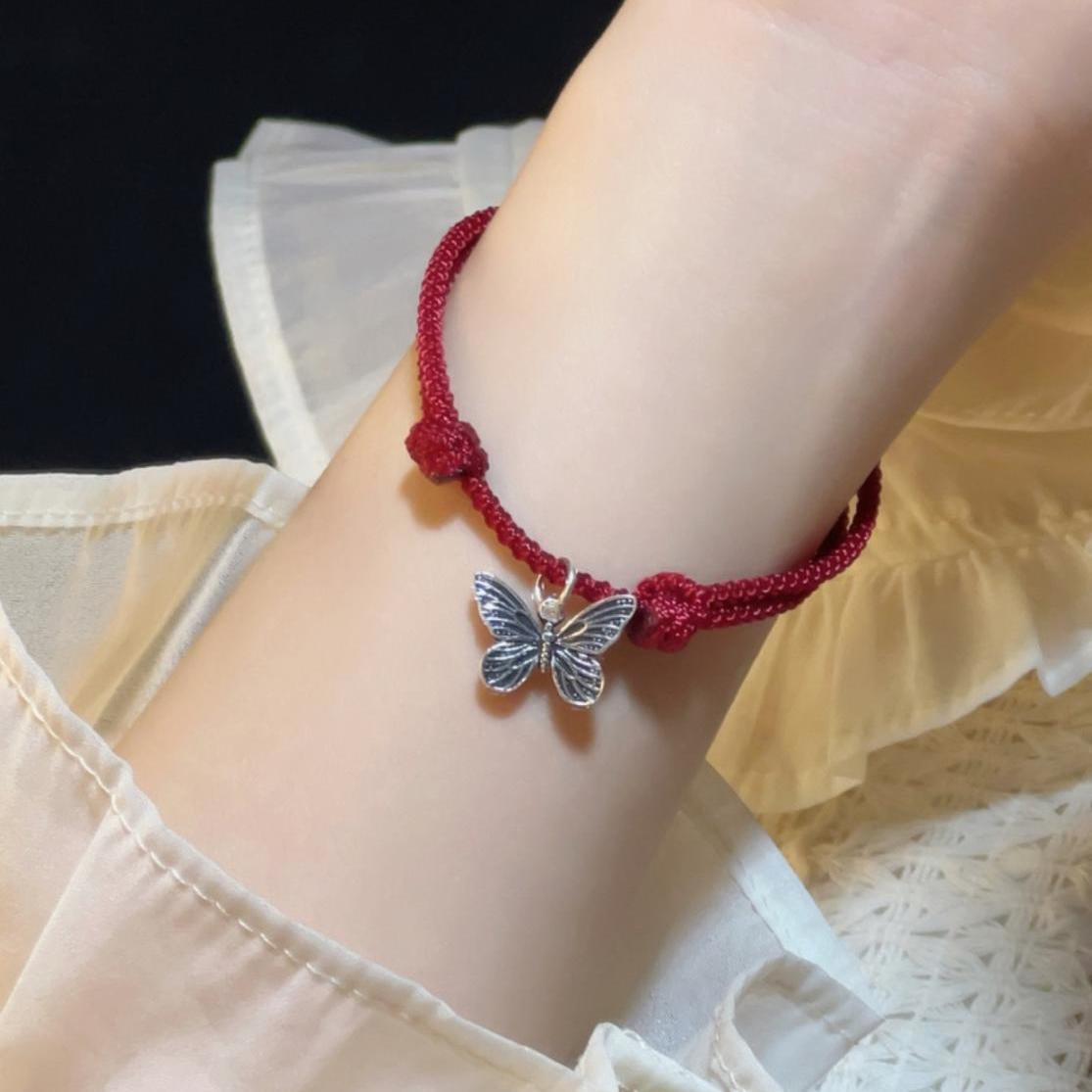 Pulsera Étnica de Mariposa Plateada Vintage Tejida Plateada Estilo Nacional Cuerda de Mano Artística China Adornos de Nicho Cuerda Roja de Nicho