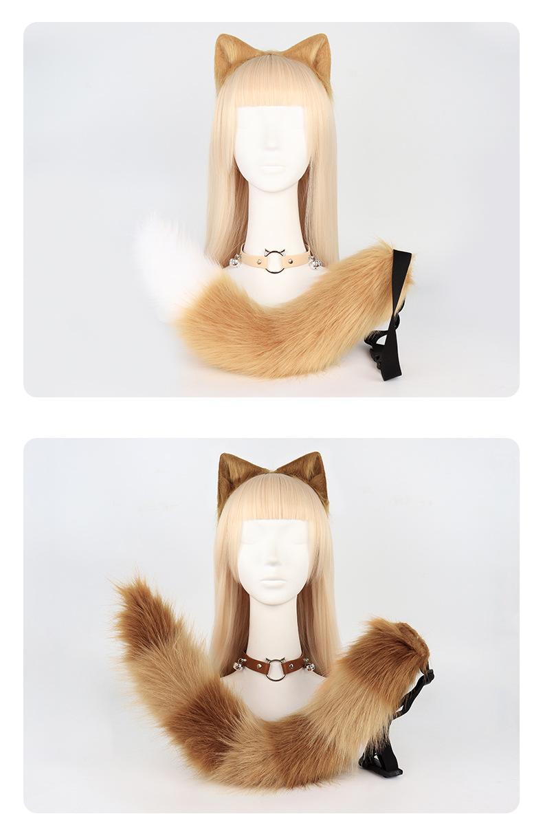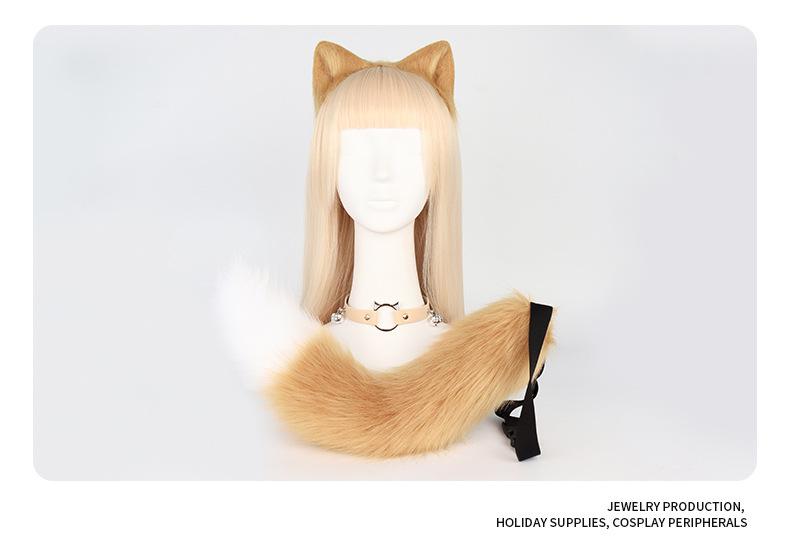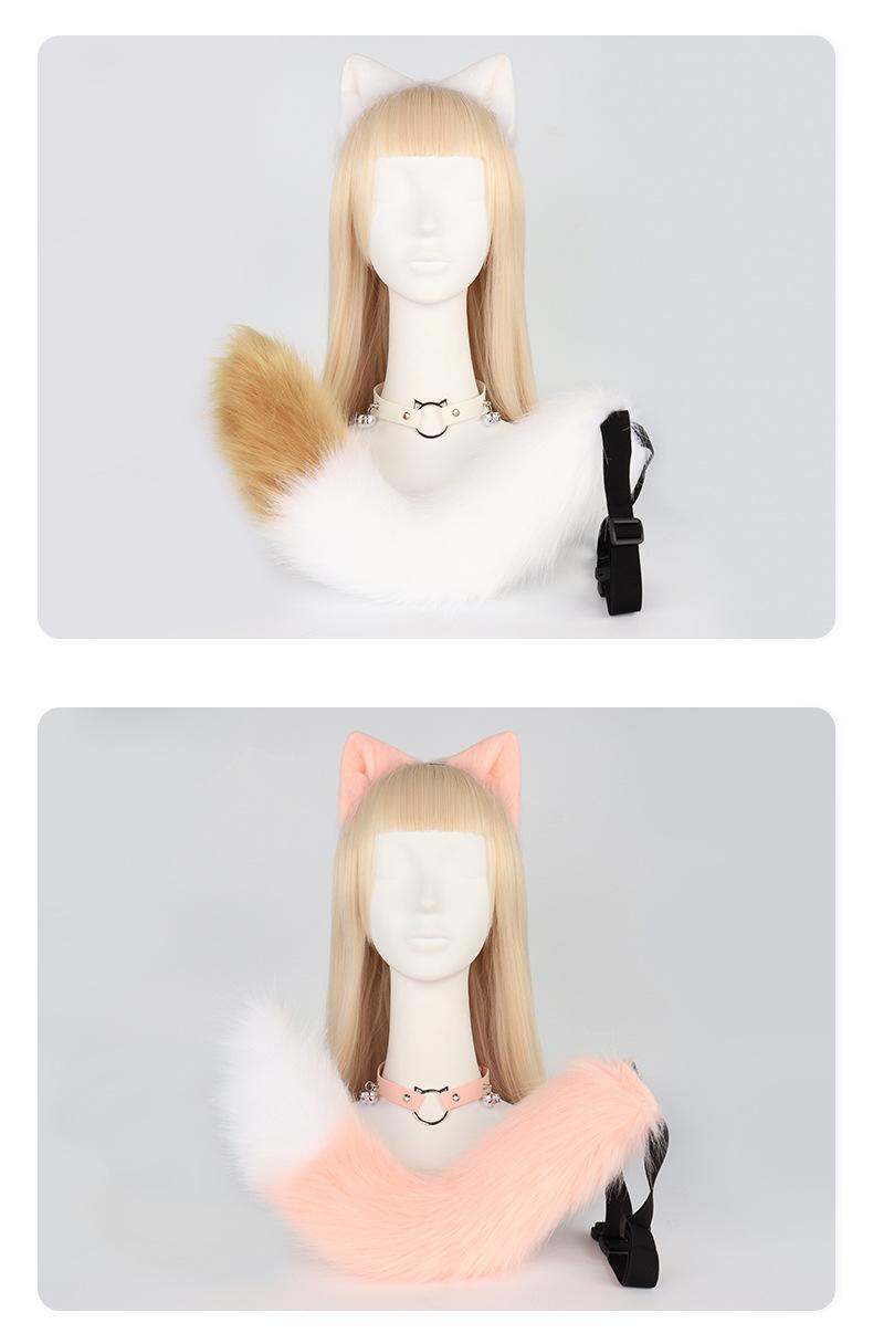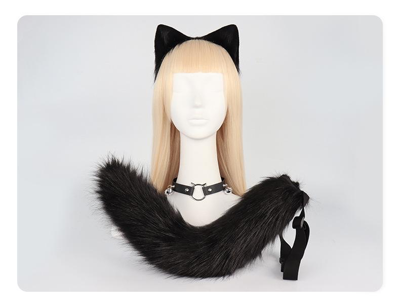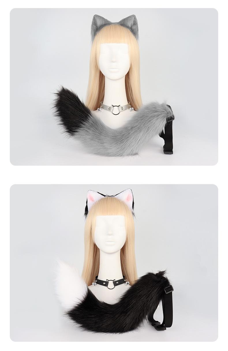 Traje de cola de bestia con orejas de bestia de peluche cos bidimensional, diadema con orejas de zorro y orejas de lobo, accesorios de cola, collar con campana y micrófono de gato