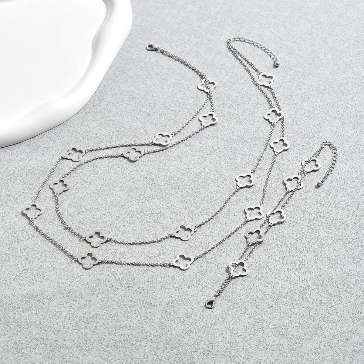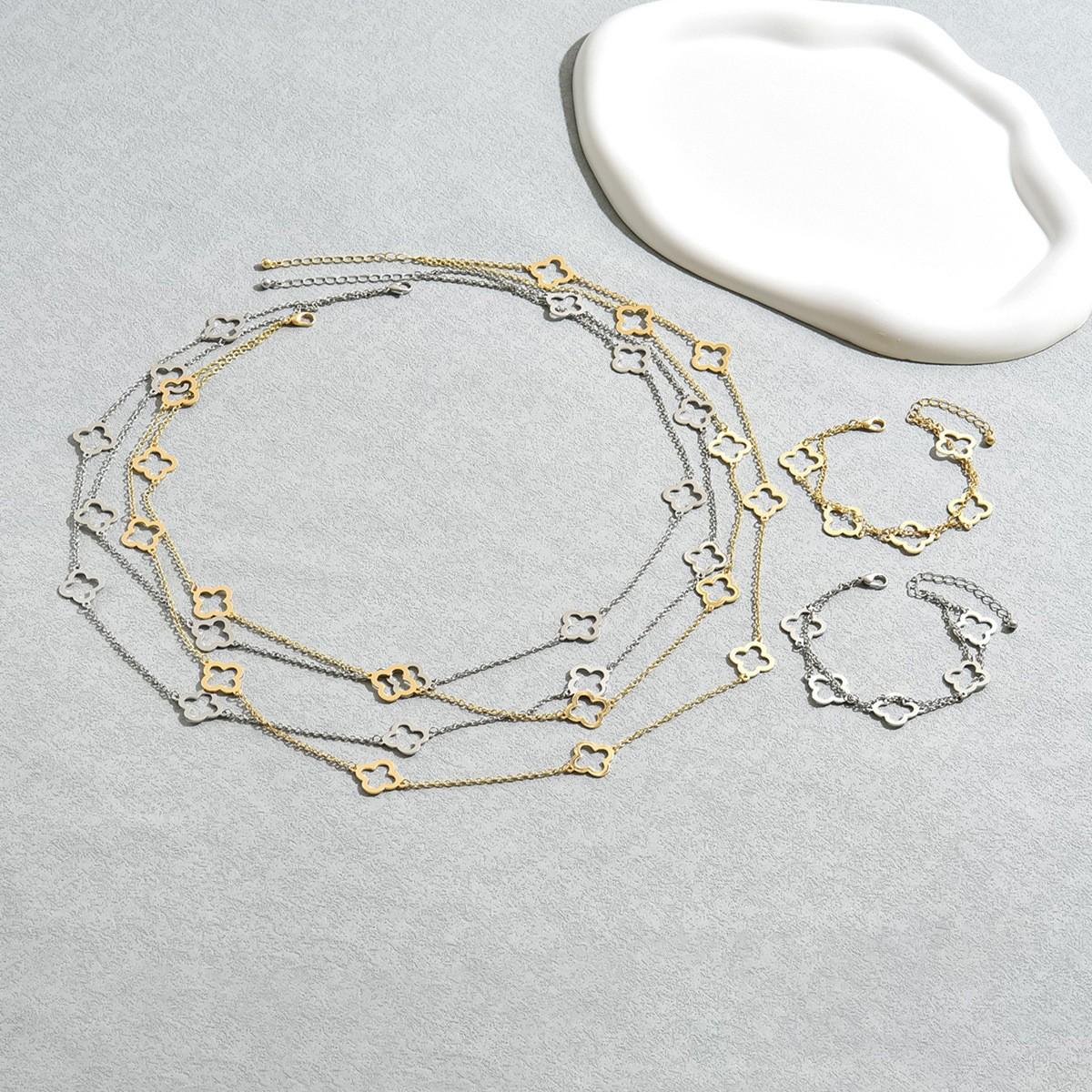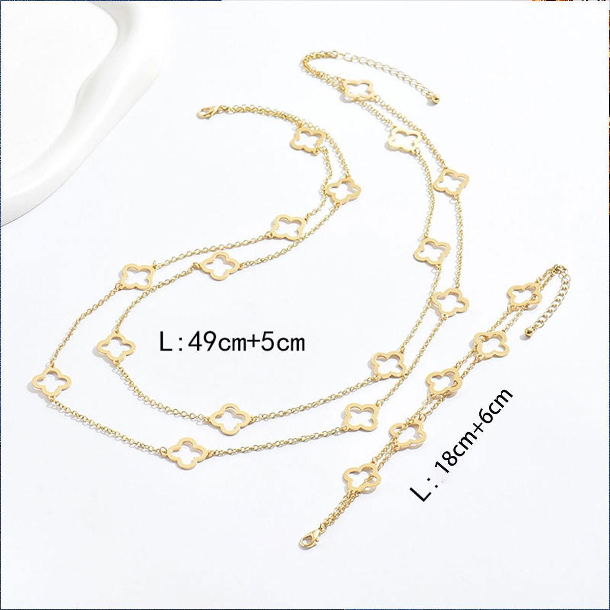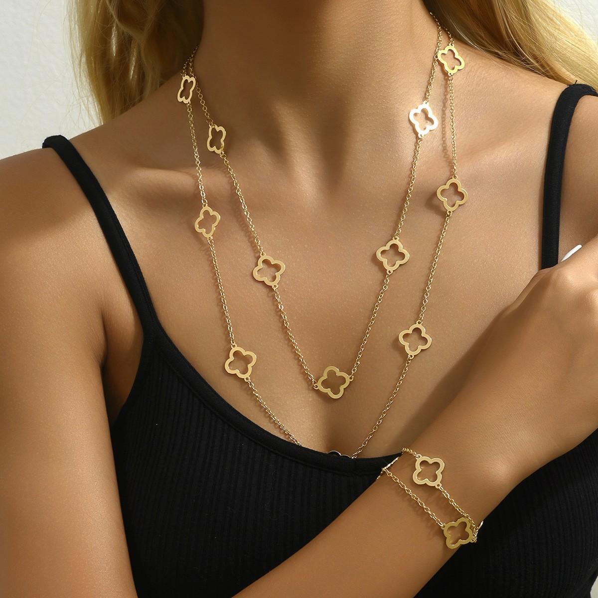 Pulsera de Cadena de Aleación Transfronteriza Europea y Americana con Trébol de Cuatro Hojas Retro Juego de Collar y Aretes Ligeros Europeos y Americanos para Mujer Set Dorado Exagerado