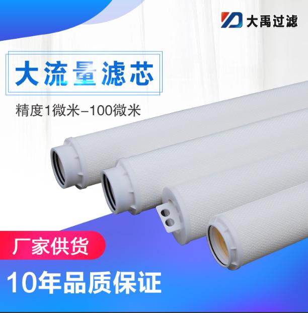 El elemento filtrante de gran caudal DYMF tiene un diseño de gran diámetro (165 mm), filtración por presión externa, esqueleto de soporte de alta resistencia en el interior y el exterior, material filtrante compuesto multicapa progresivo, soldadura general por fusión en caliente, anillo de sellado externo. Diseño de caudal único de 50-90 m³/H, adecuado para prefiltración de ósmosis inversa a gran escala y otros campos.