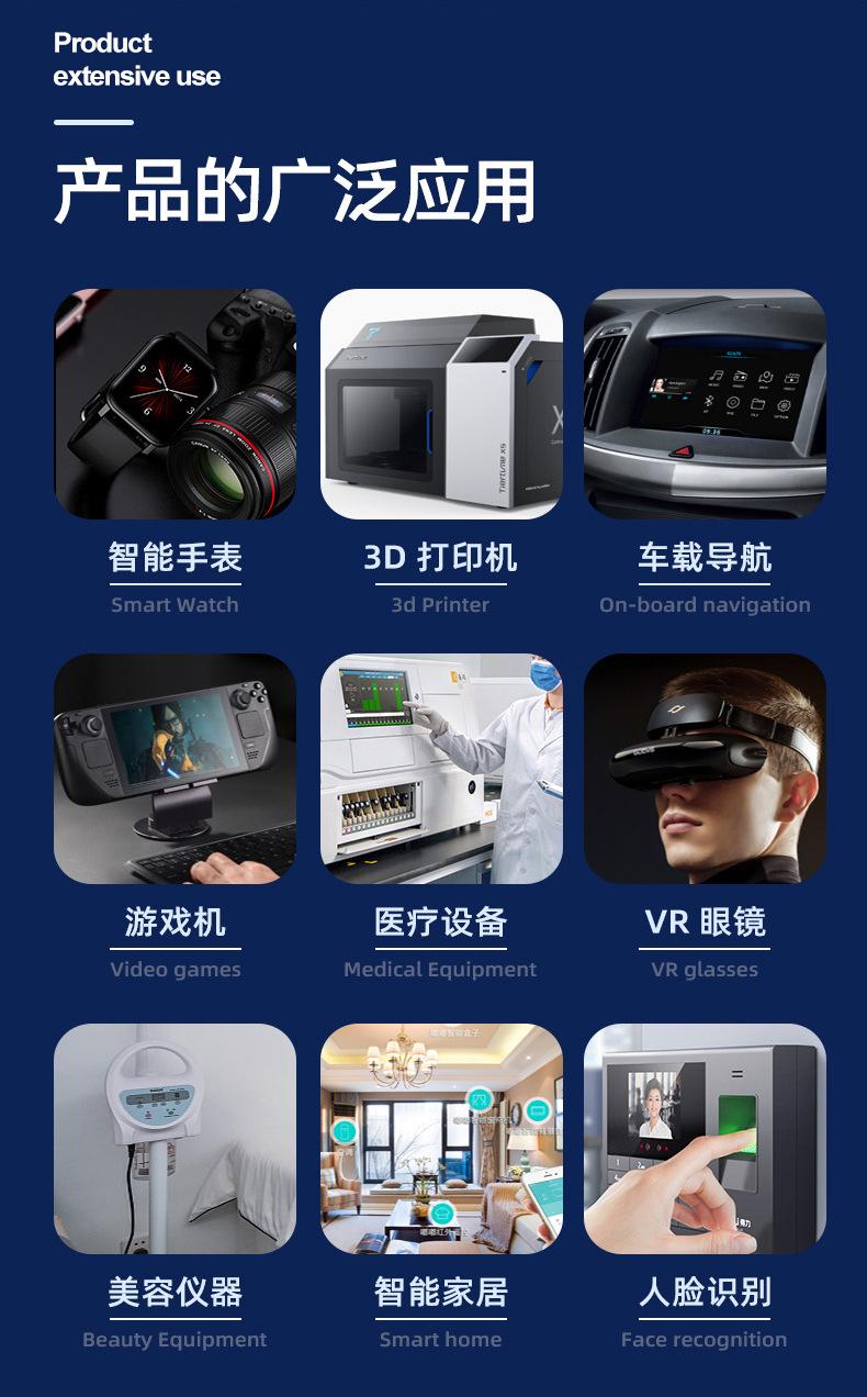 Portátiles, tabletas, monitores de computadora, televisores, netbooks, industria, imagenología médica, señalización digital, pantallas empalmadas, alto brillo para exteriores, pantallas de barra cortada, pantallas transparentes, pizarras electrónicas, teléfonos móviles, terminales portátiles, dispositivos portátiles, proyección, HMD, VR, AR, pantallas de vehículos, dispositivos de navegación portátiles, marcos de fotos digitales, DVD portátiles, videoporteros, videoteléfonos, pantallas circulares, MID, UMPC, MP3, PMP, cámaras digitales, videocámaras digitales, impresoras, impresoras 3D, juegos, libros electrónicos, etiquetas electrónicas, instrumentos, electrónica para vehículos, equipos de comunicación, electrodomésticos, cultura, educación, deportes y entretenimiento, finanzas, control fiscal, atención médica, cronometraje y conteo