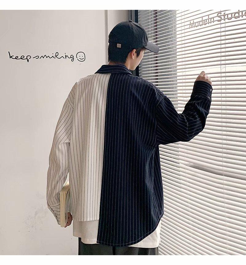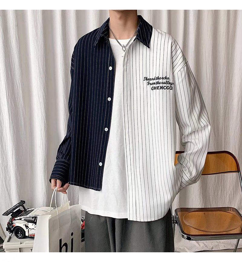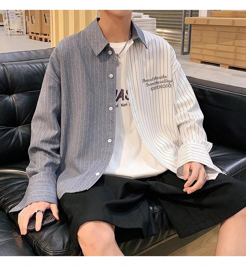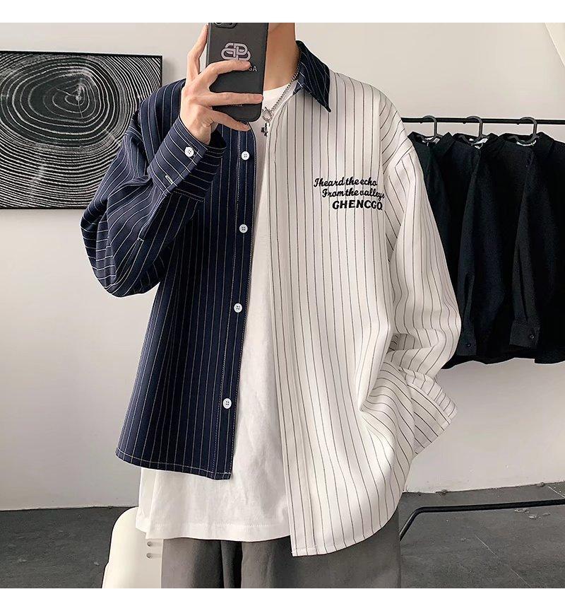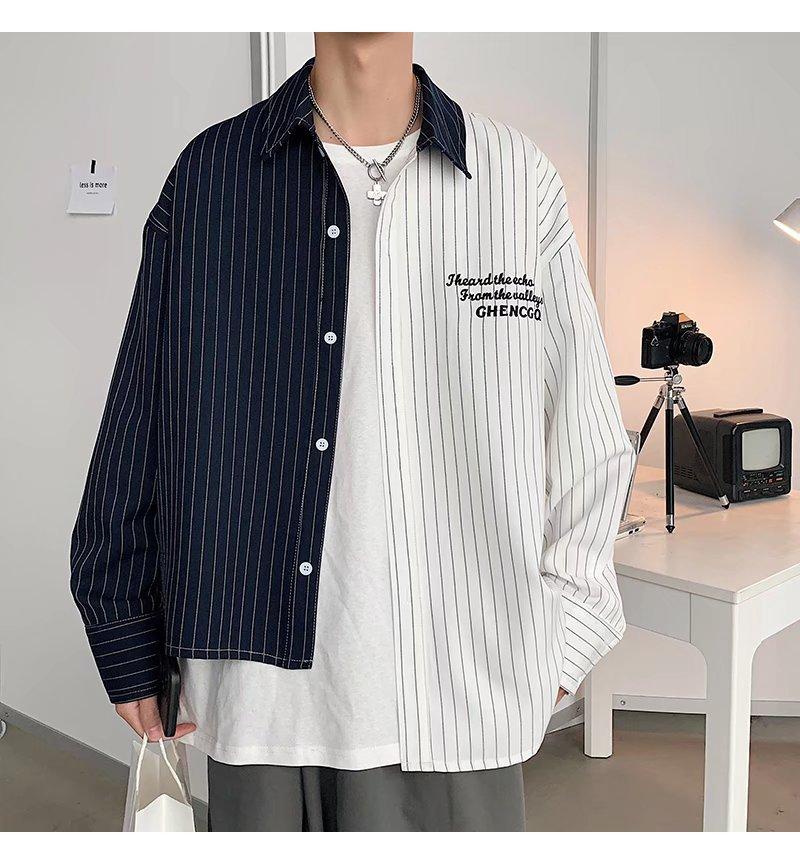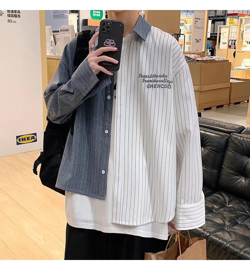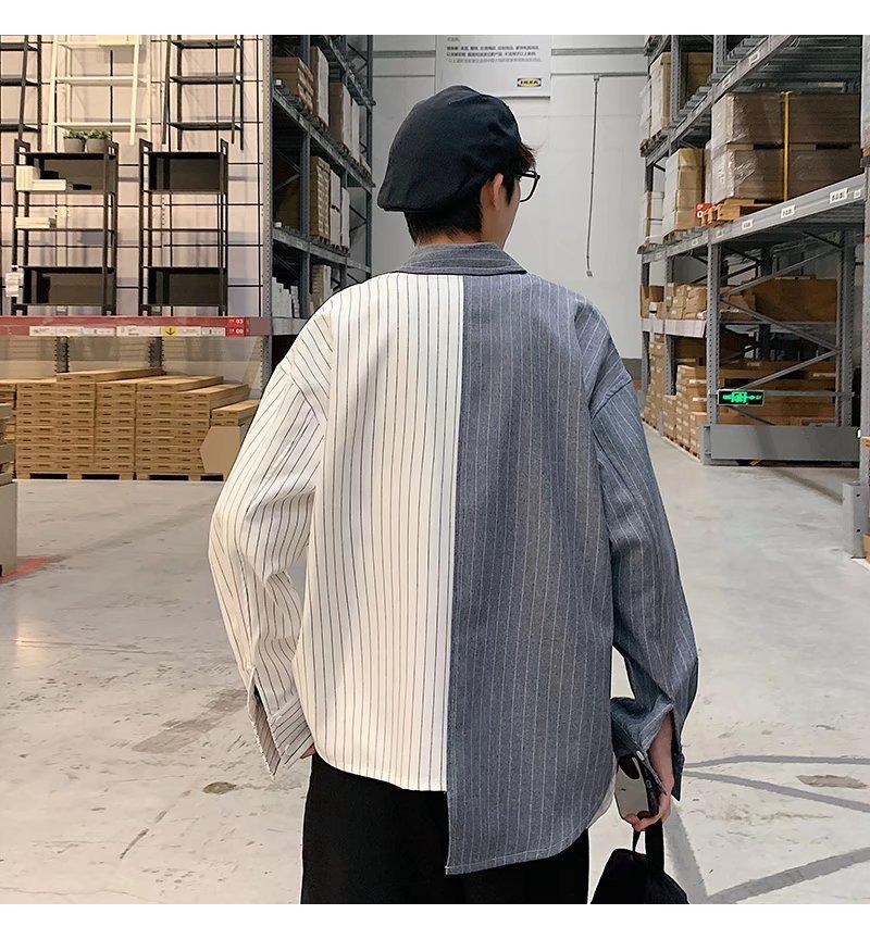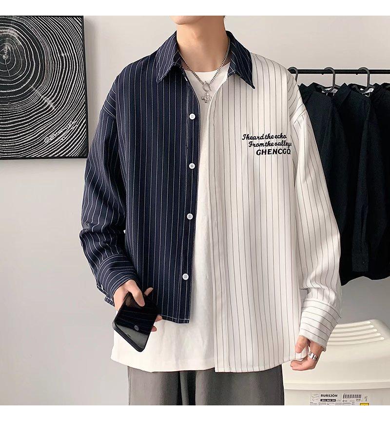Camisa de rayas de manga larga irregular para hombre, primavera y otoño, costuras de color en contraste, marca de moda Ruan Shuai, diseño de camisa de otoño con sentido del diseño.