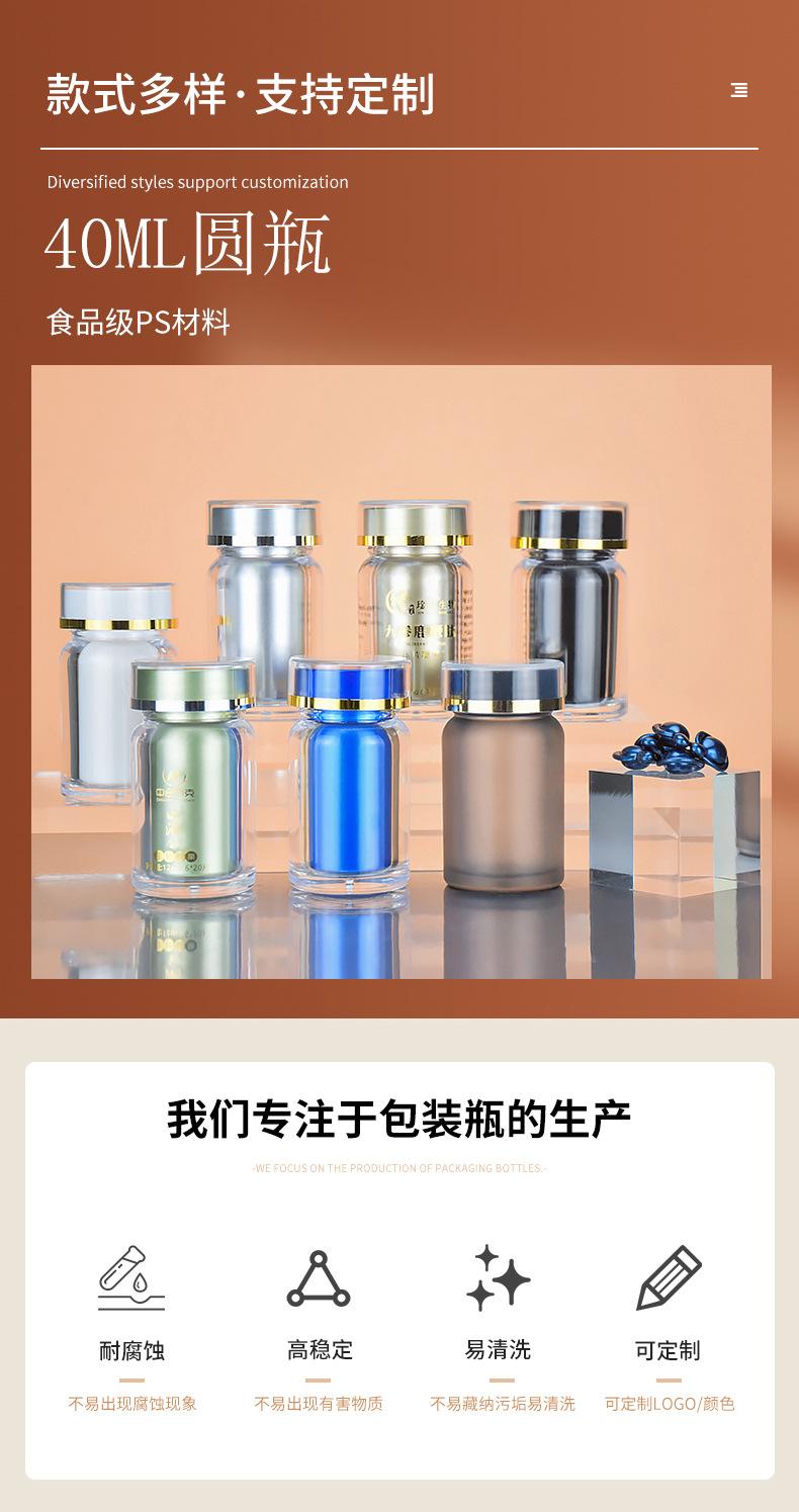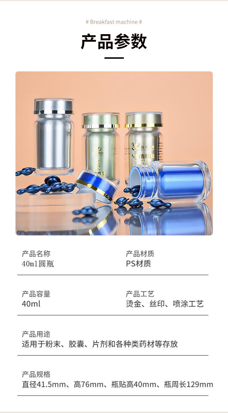 Suministro directo de fábrica 40 ml botella pequeña de medicina botella para cápsulas tableta maca sub-botella material PS transparente botella para producto para el cuidado de la salud