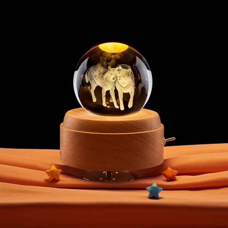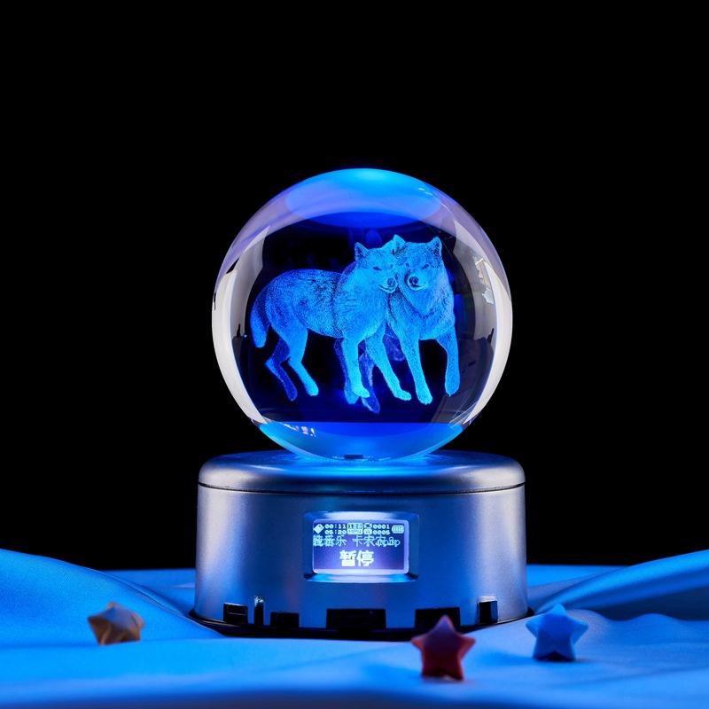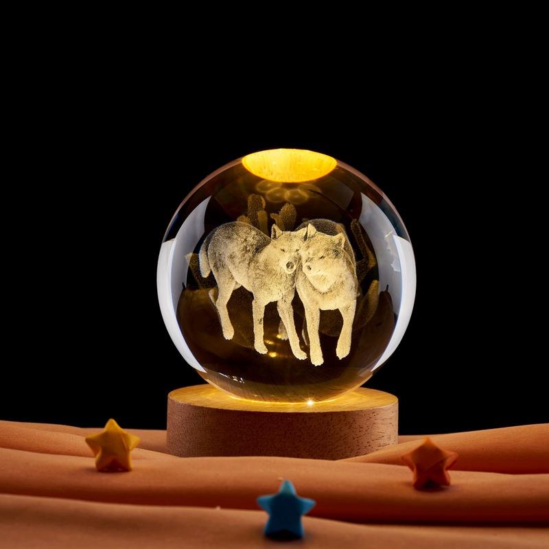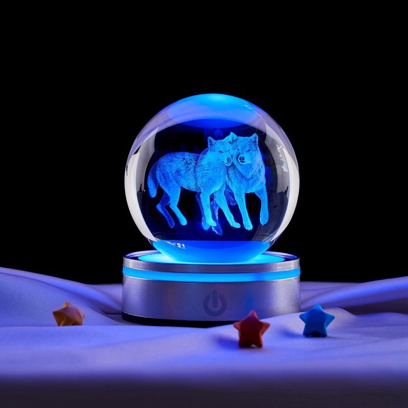 Venta al por mayor de comercio exterior transfronterizo doble lobo 3d grabado láser tridimensional bola de cristal luz nocturna luminosa adornos de artesanía creativa